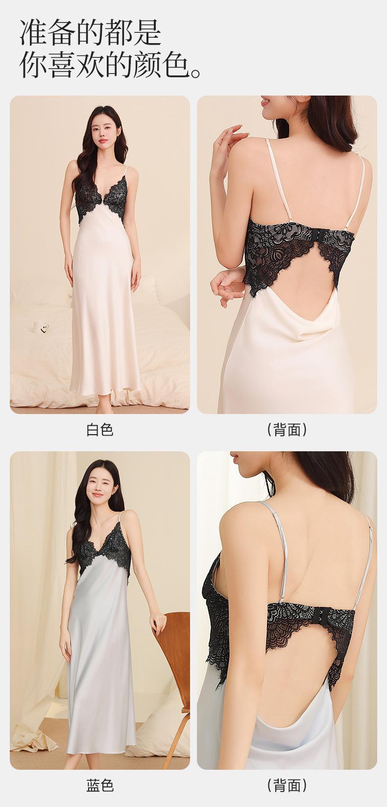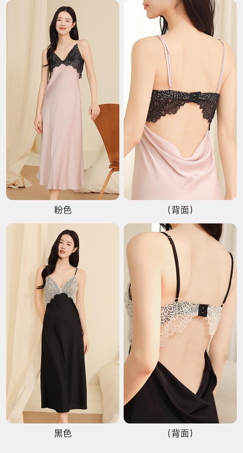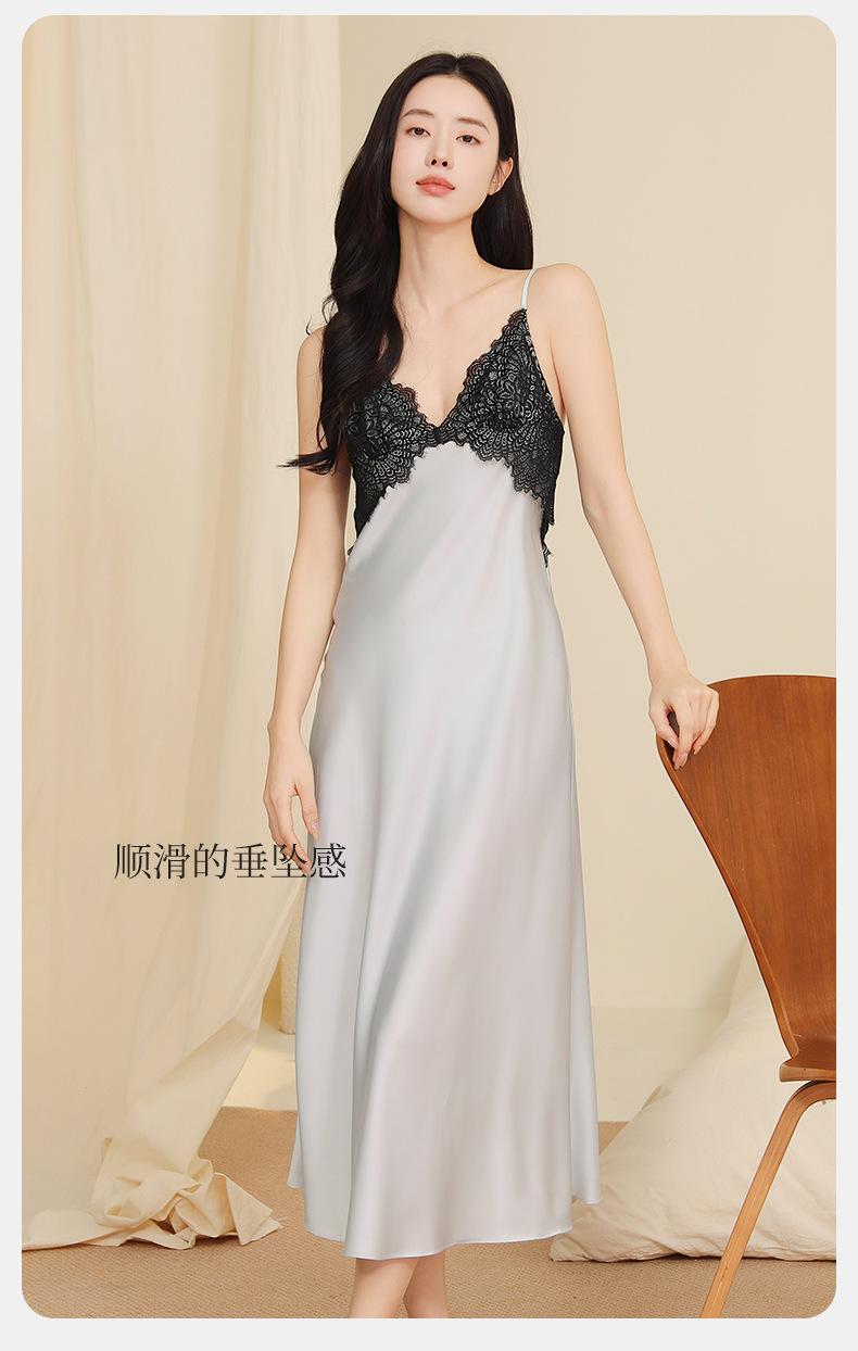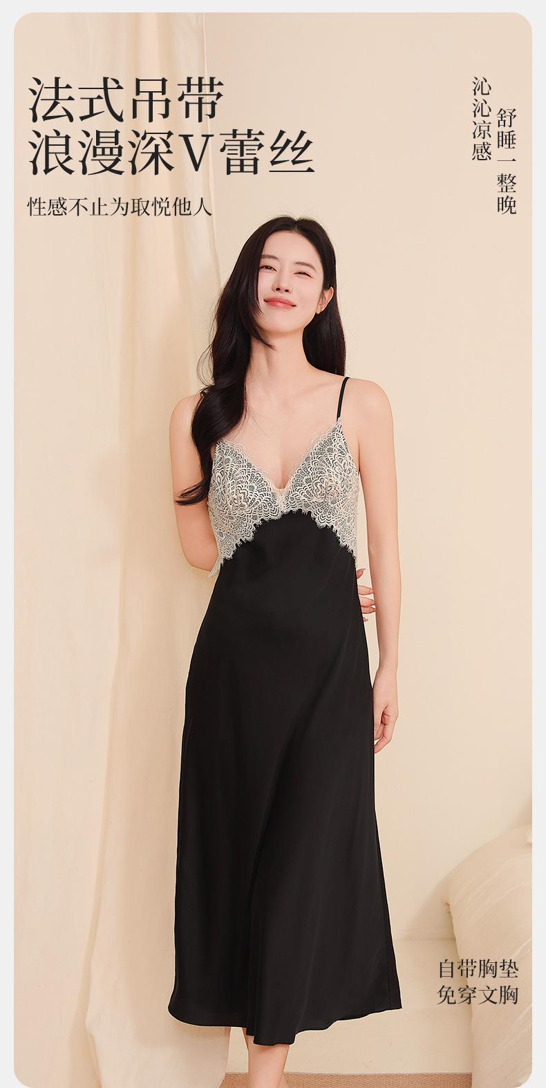 Yu Zhaolin Pijama Sexy de Encaje para Mujer Verano Seda de Hielo Francés Falda con Tirantes Camisón Ropa para el Hogar Falda Larga con Almohadillas en el Busto