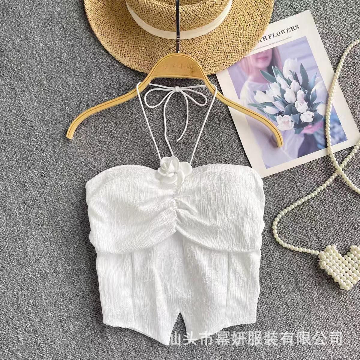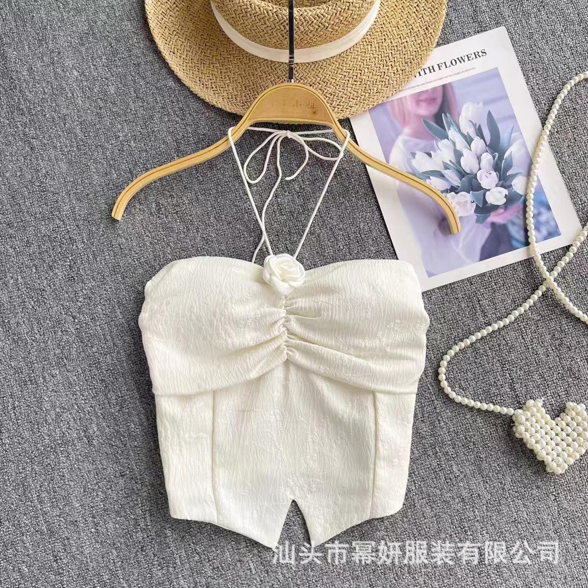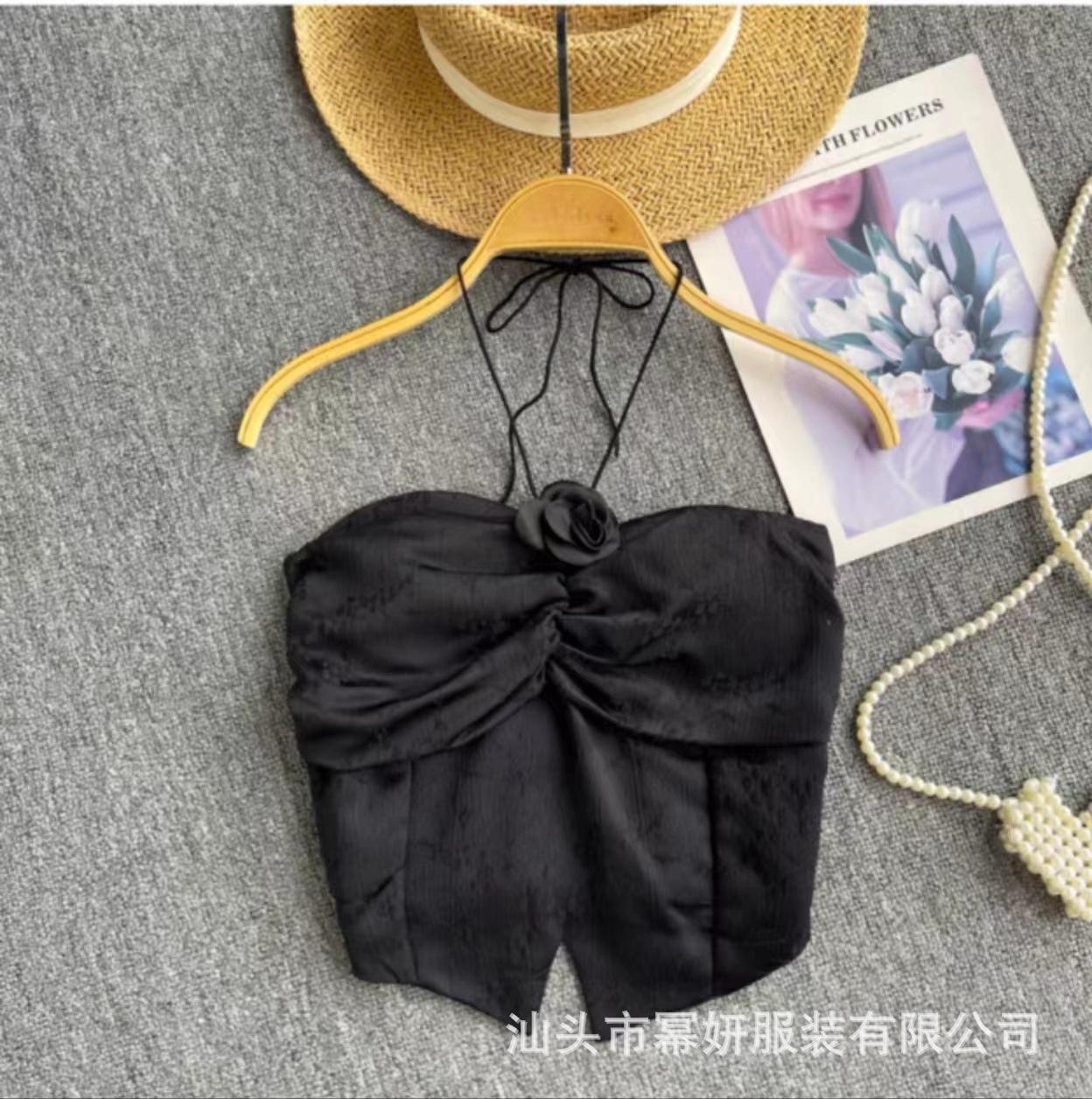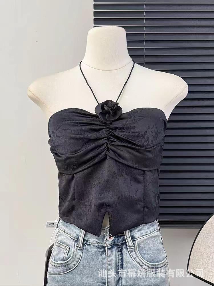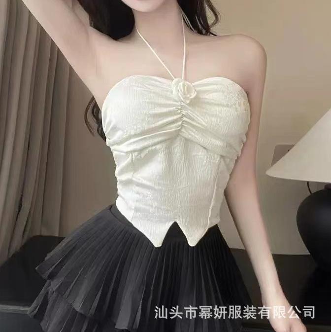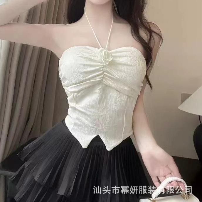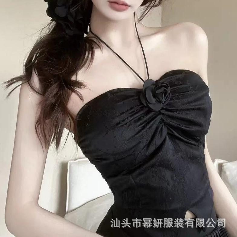 Estilo Deseo Puro Camisola Jacquard Halter con Flor Tridimensional con Almohadilla en el Pecho Anti-corrida Top con Hombros Descubiertos