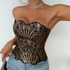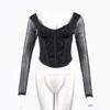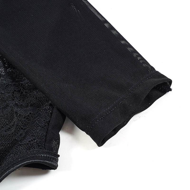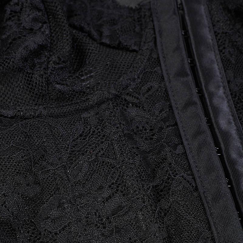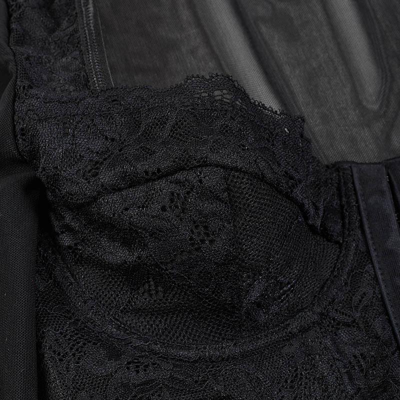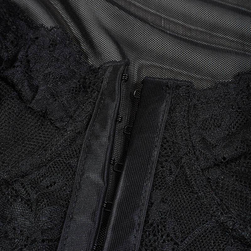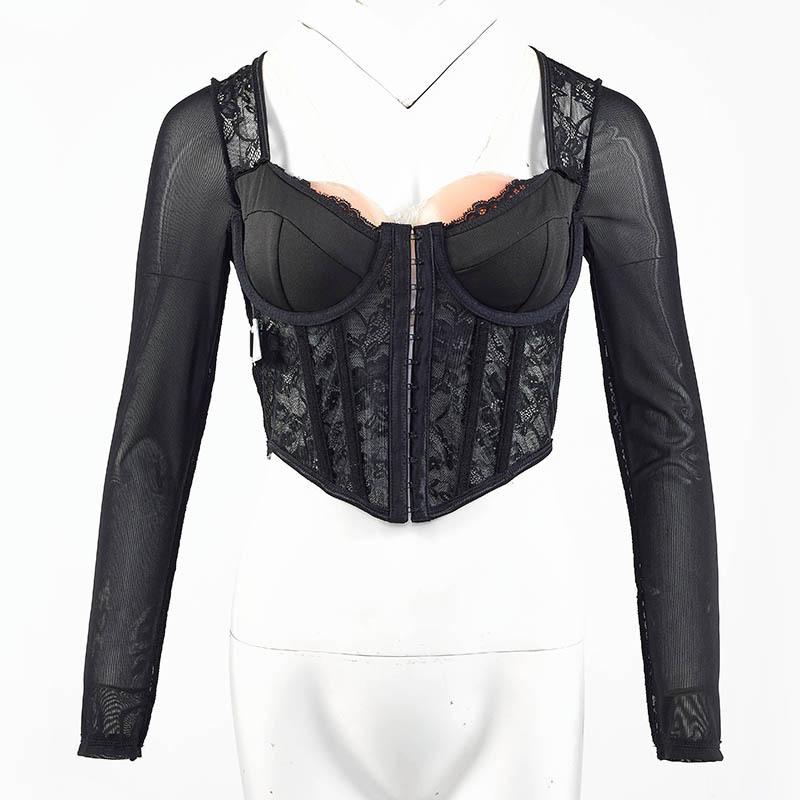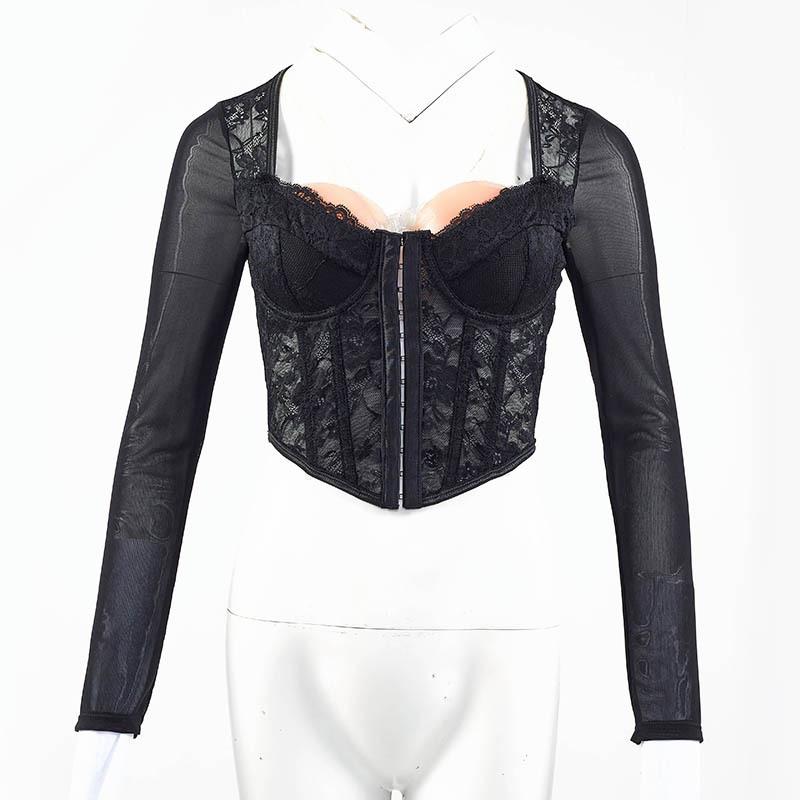 Body sexy de encaje europeo y americano transfronterizo, ajustado, empalmado, de malla transparente, con botones, corsé de varillas, escote bajo, estilo urbano