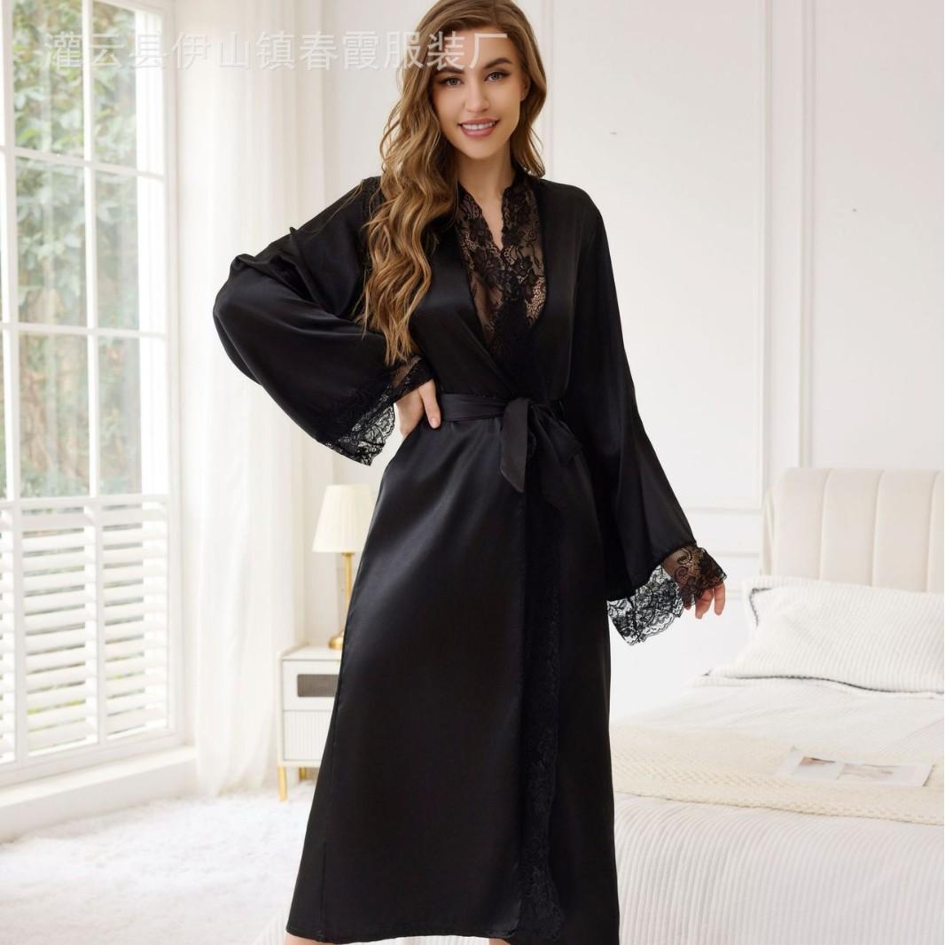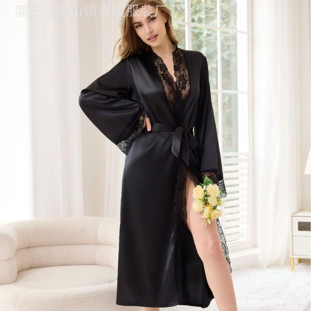 Camisón sexy de seda sintética de comercio exterior europeo y americano transfronterizo, bata con encaje en la cintura, conjunto de pijama casual para el hogar