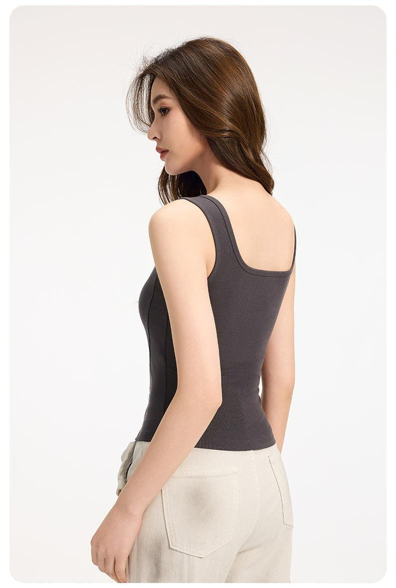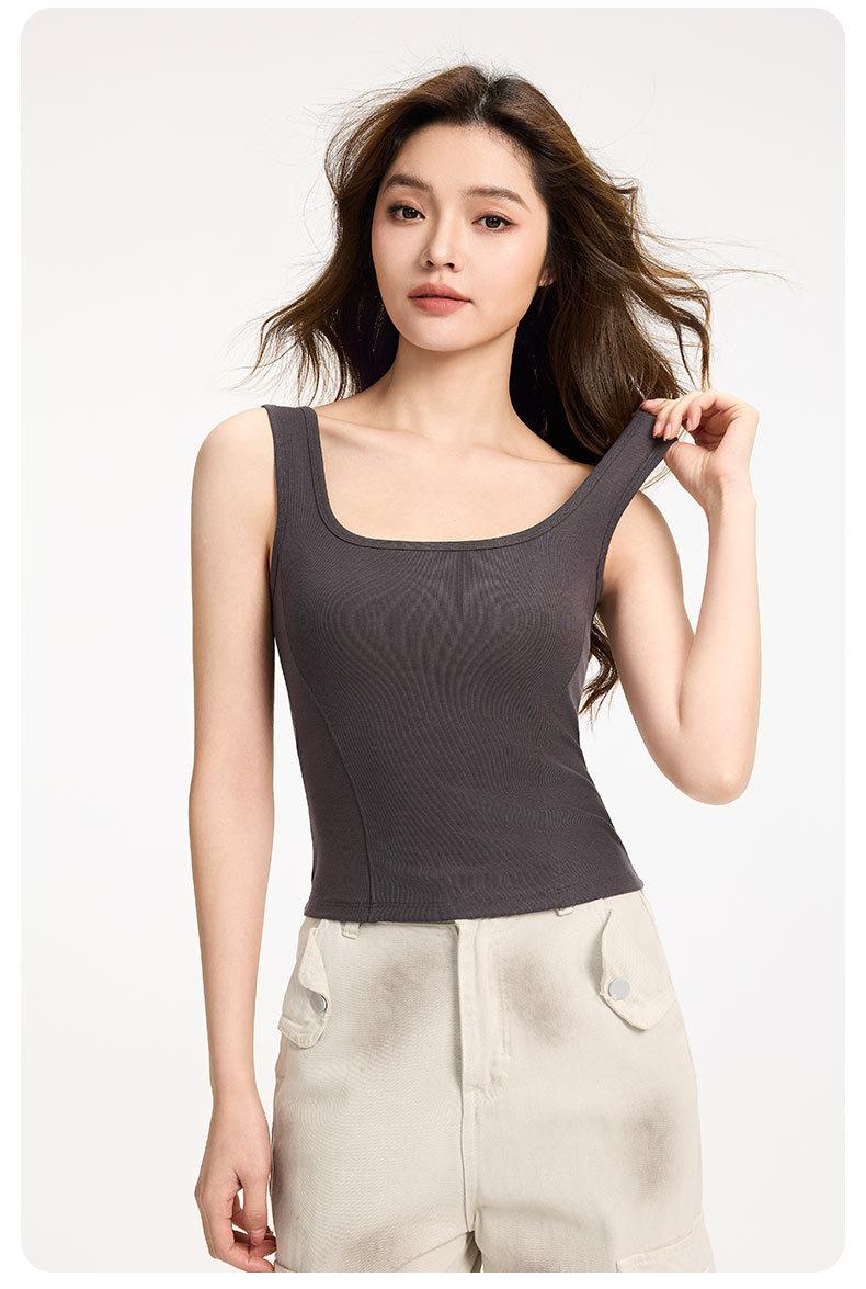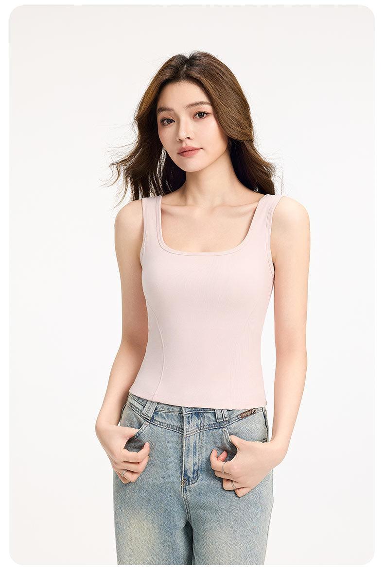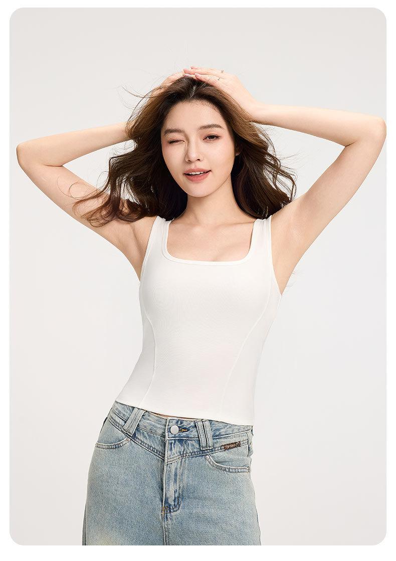 Camisola de Tirantes Anchos para Mujer Verano Nuevo Estilo Ajustado Adelgazante Combinable Top con Almohadilla en el Pecho para Mujer Cuello Cuadrado Chaleco Básico