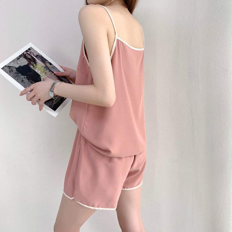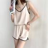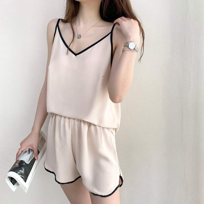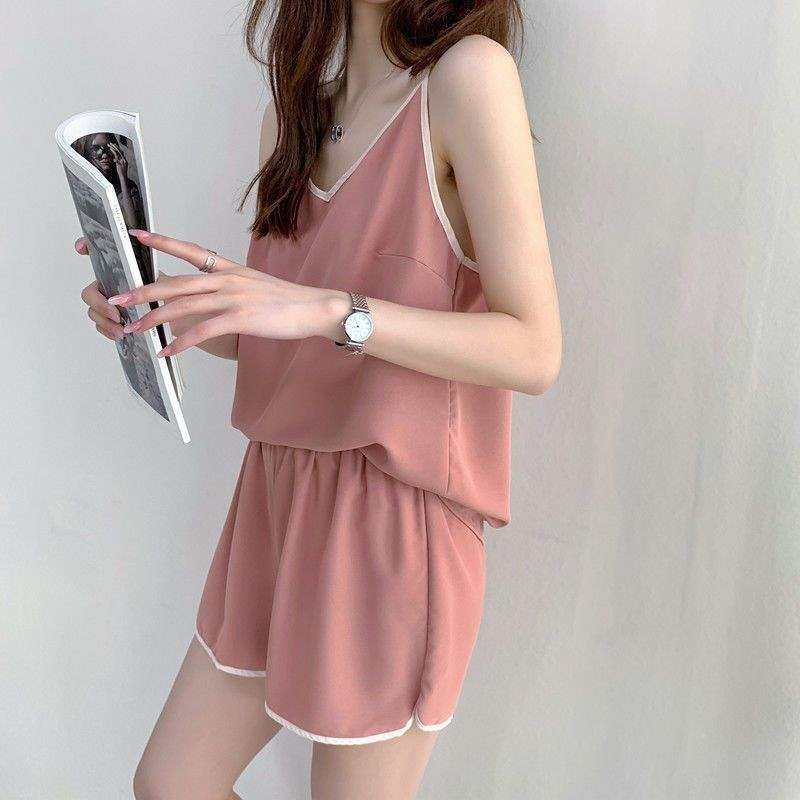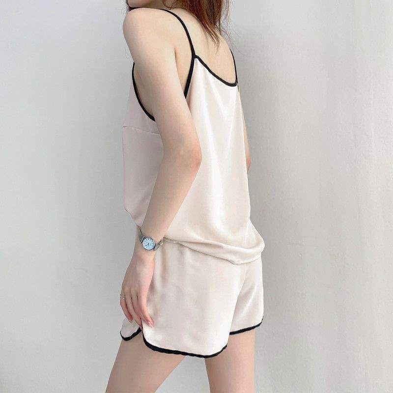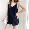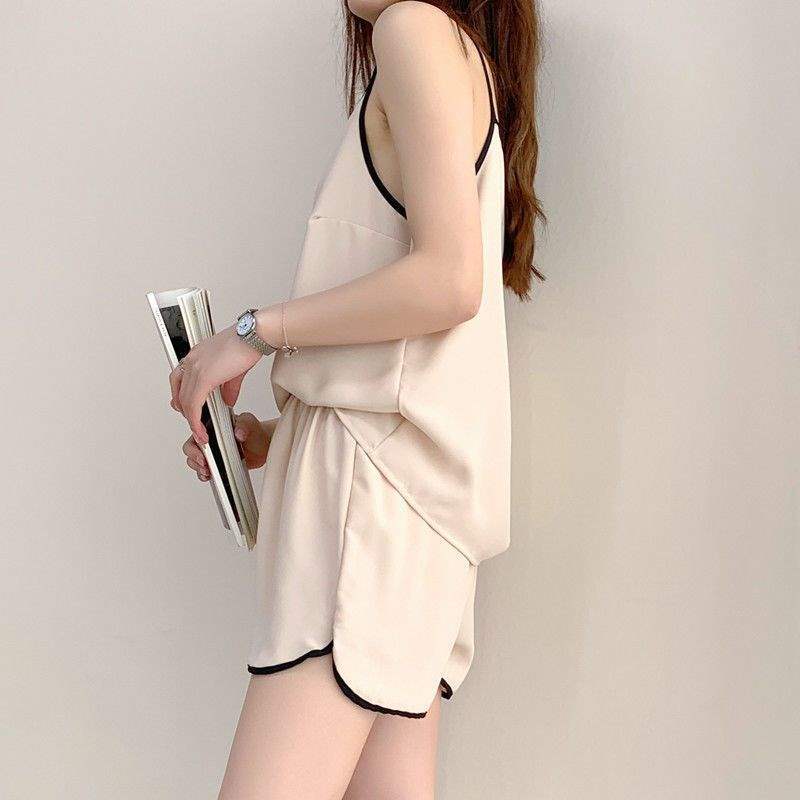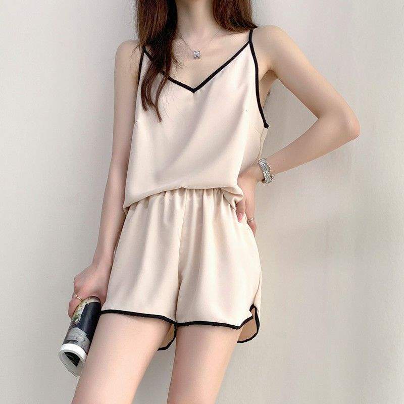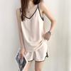 Pijama de verano para mujer, de seda helada, fino, sexy, con cuello, de satén, camisola, pantalones cortos, traje de dos piezas holgado