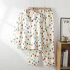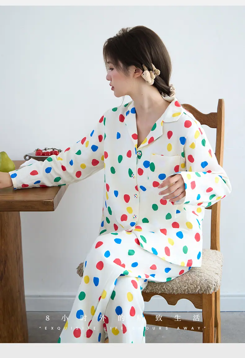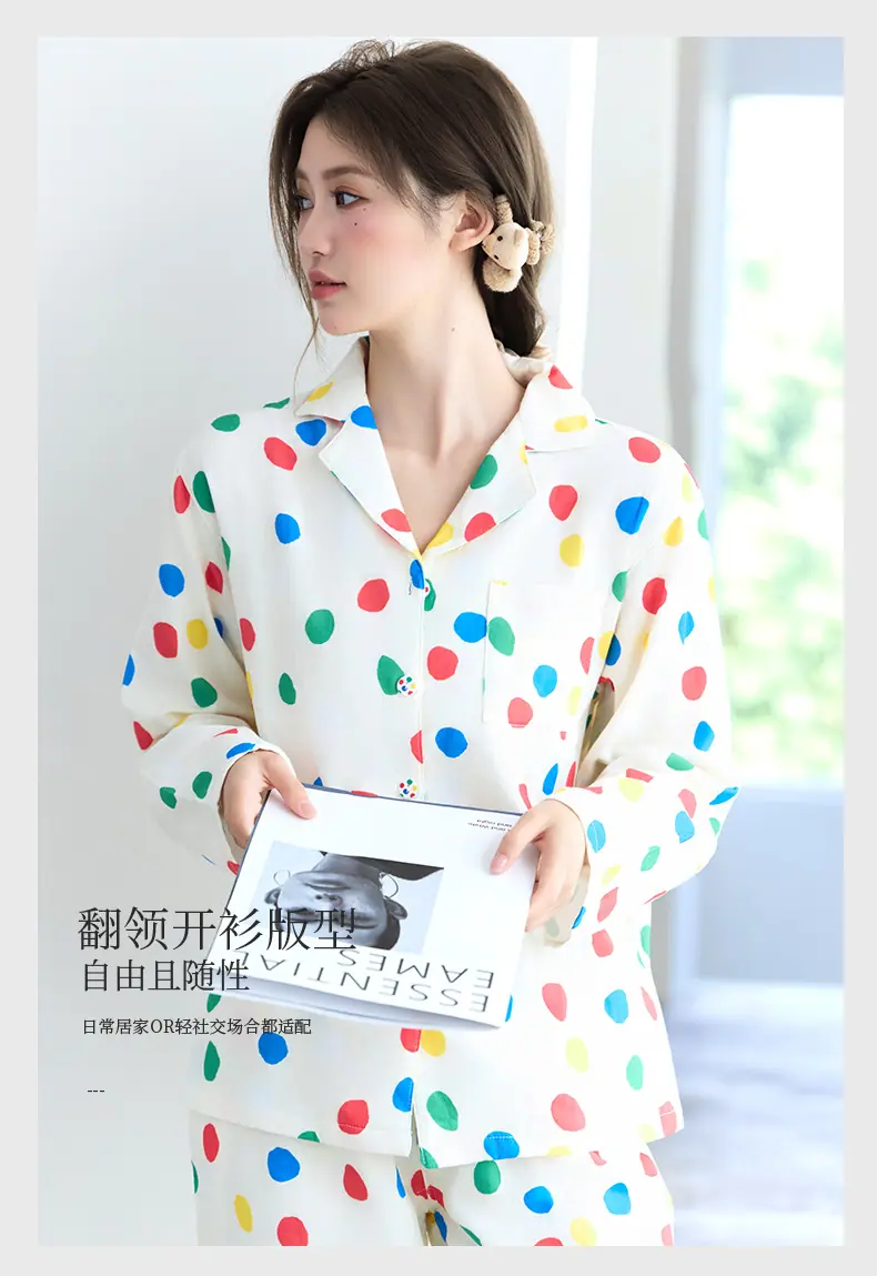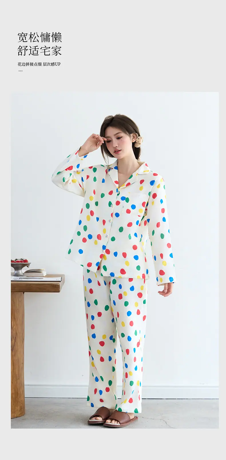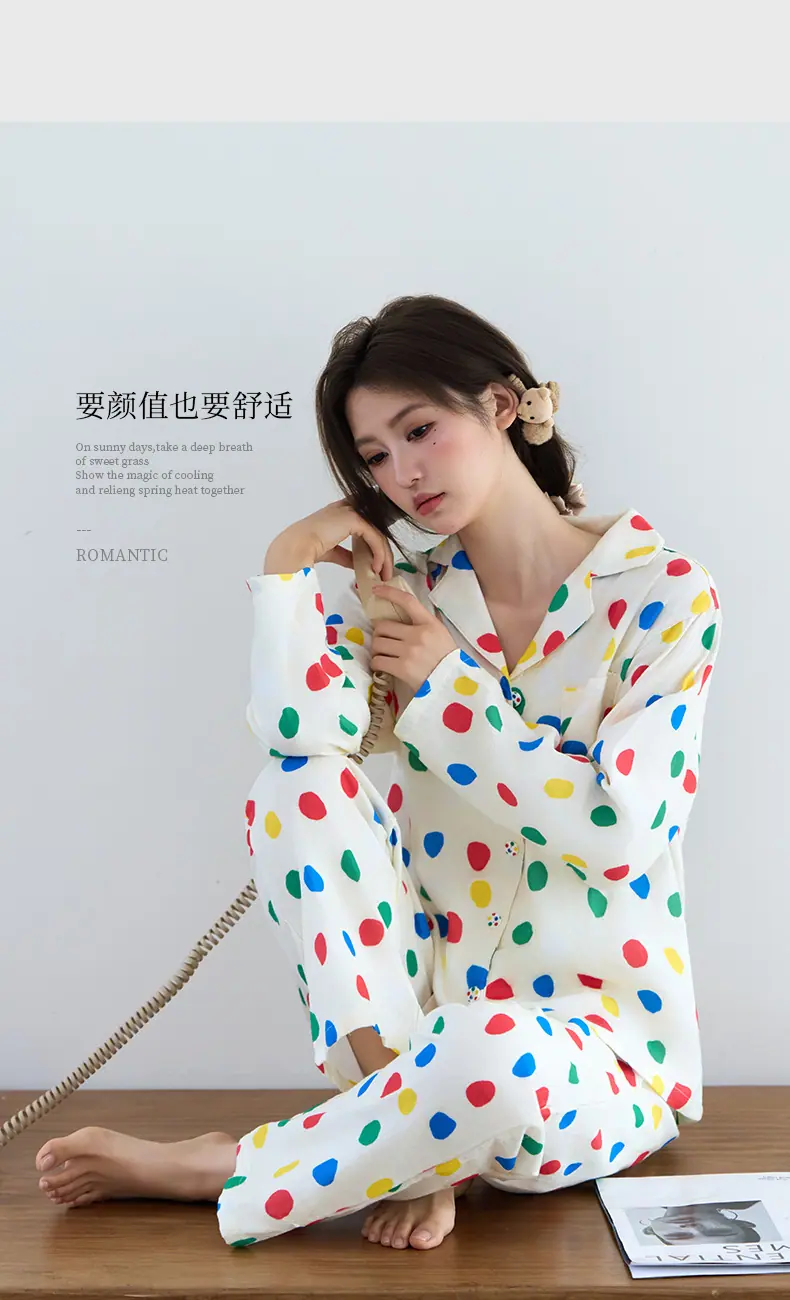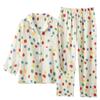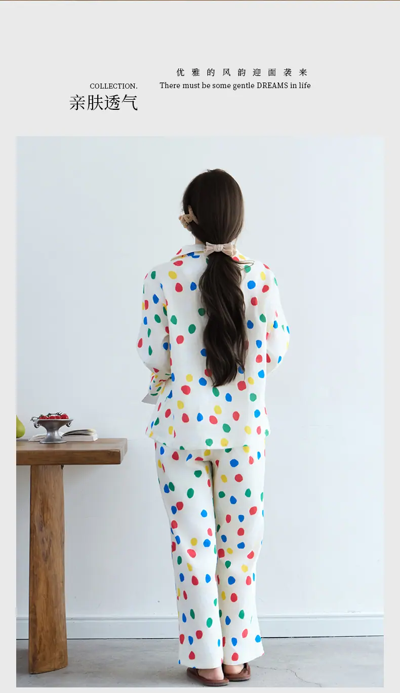 Primavera y Otoño Nuevo Algodón Puro Gasa Doble Capa Pijama para Mujer Estampado de Lunares Ondulados Coloridos Verano Delgado Manga Larga Pantalón Traje Ropa de Casa