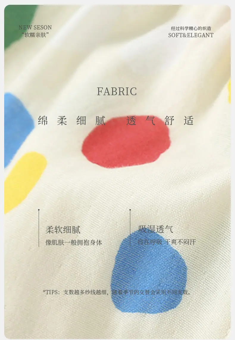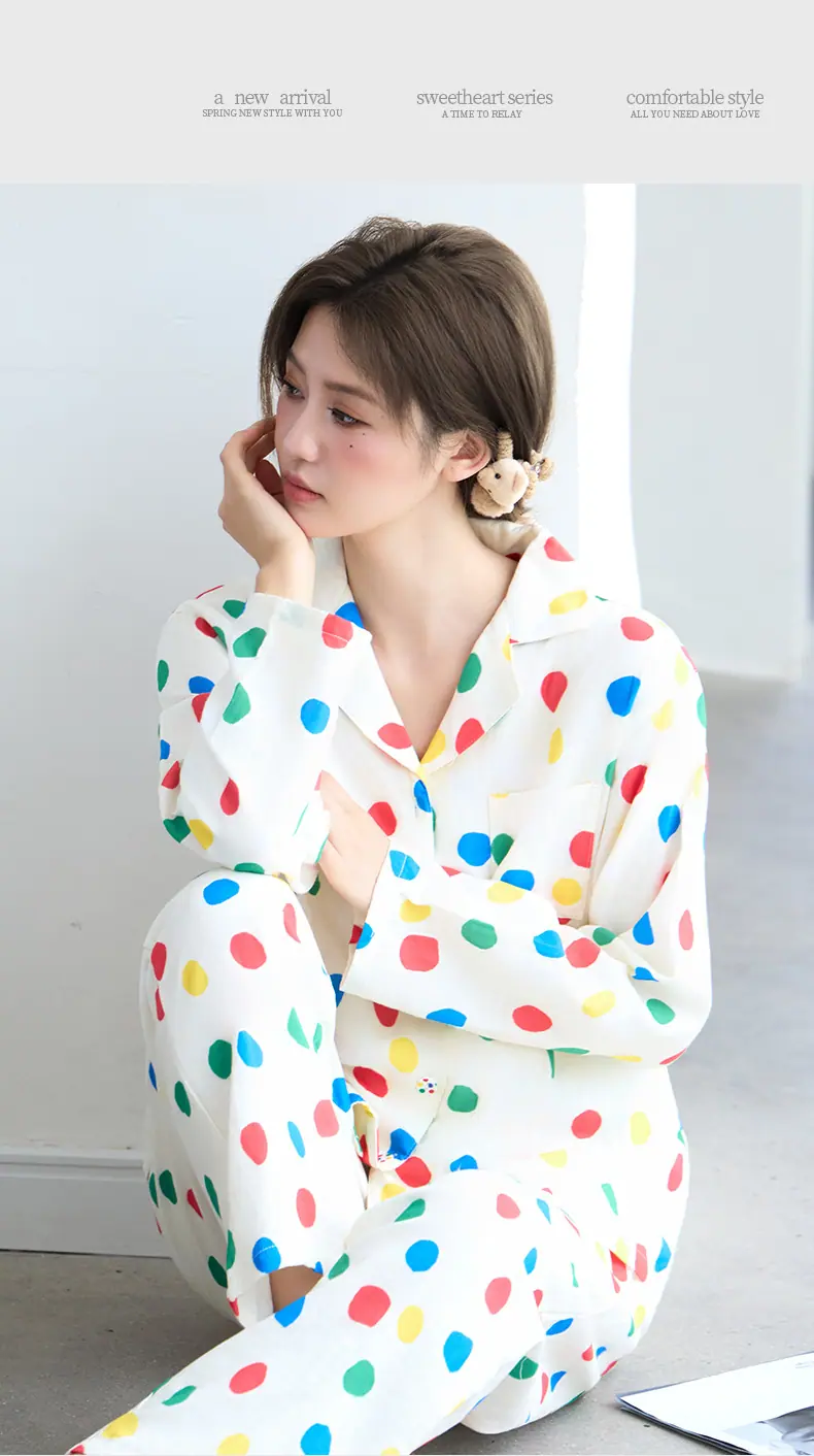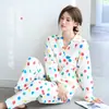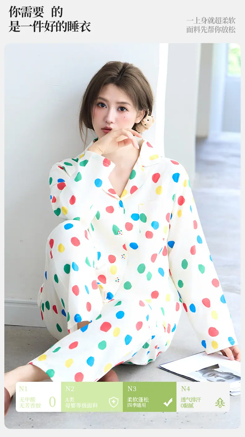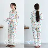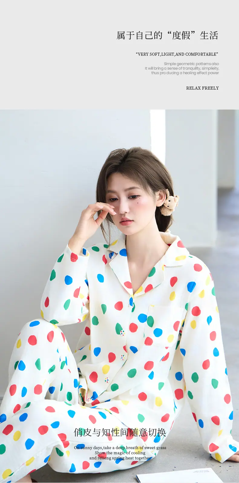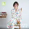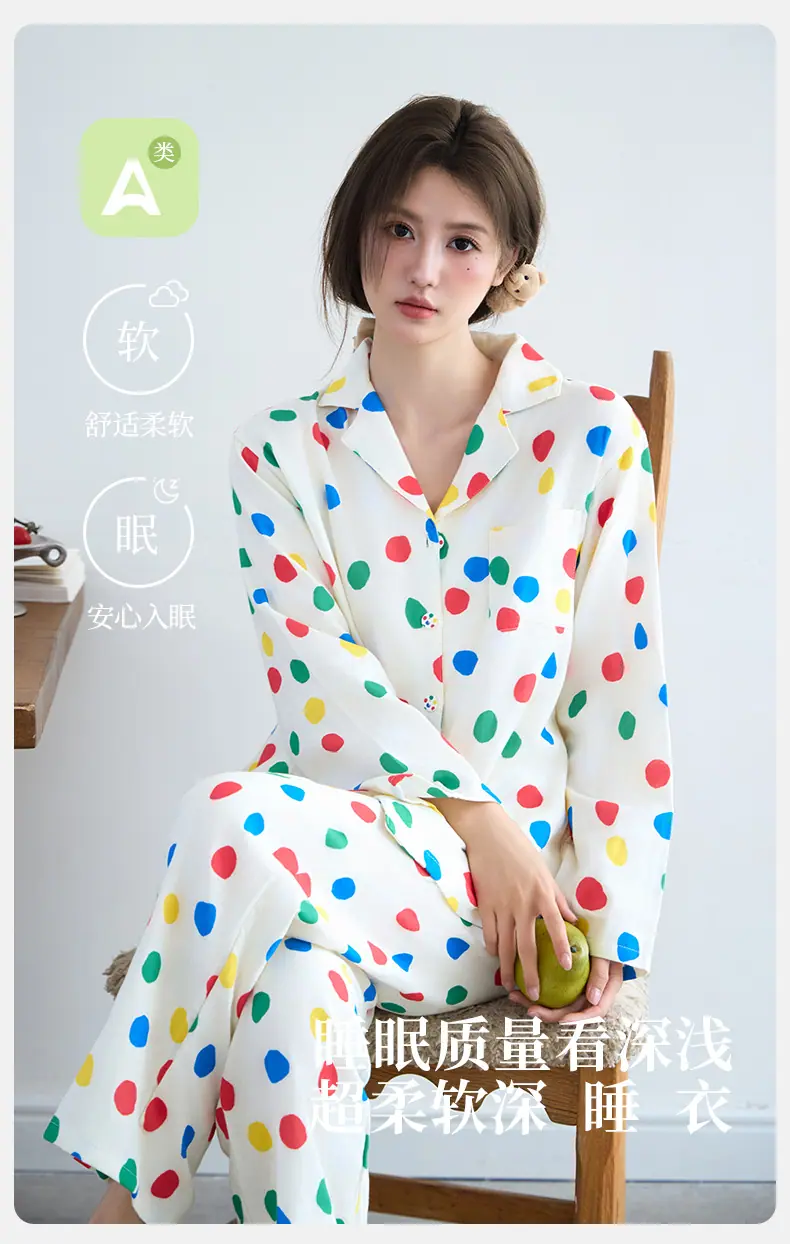 Primavera y Otoño Nuevo Algodón Puro Gasa Doble Capa Pijama para Mujer Estampado de Lunares Ondulados Coloridos Verano Delgado Manga Larga Pantalón Traje Ropa de Casa