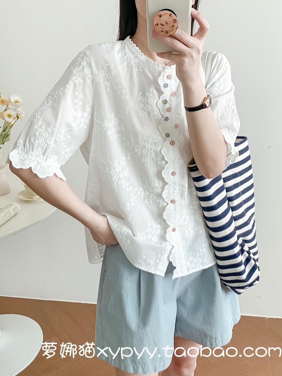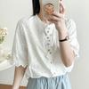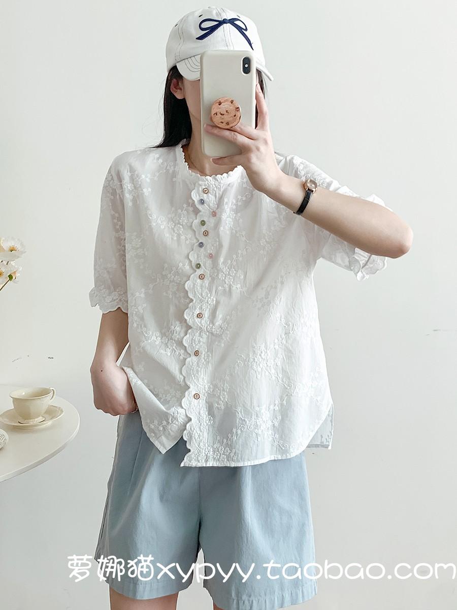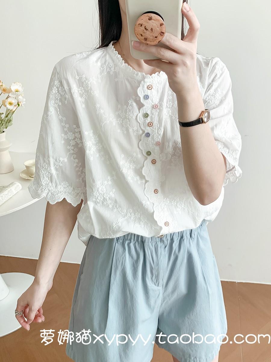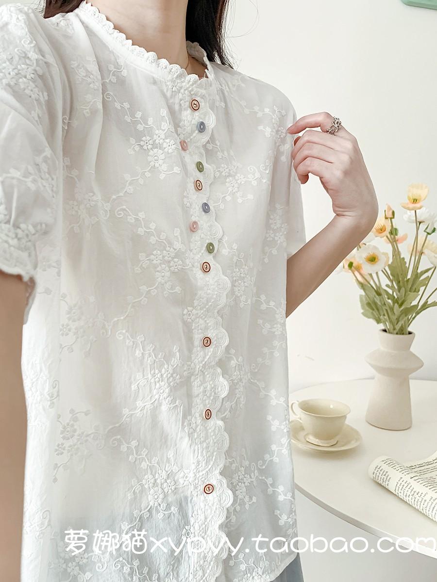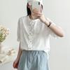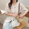 Camisa de Encaje Estilo Francés de Manga Corta para Mujer Verano Bordada con Relieve Chic Color Botón Algodón Top