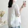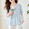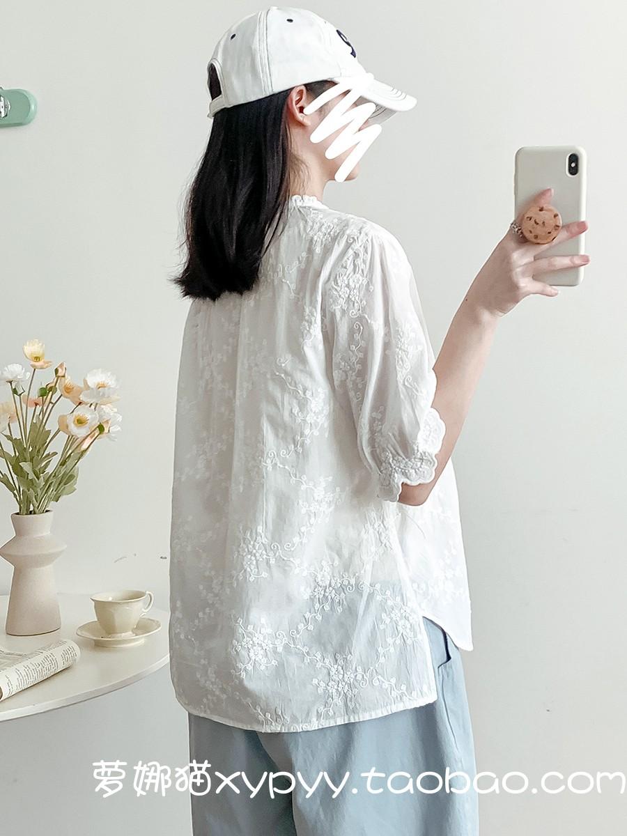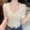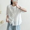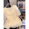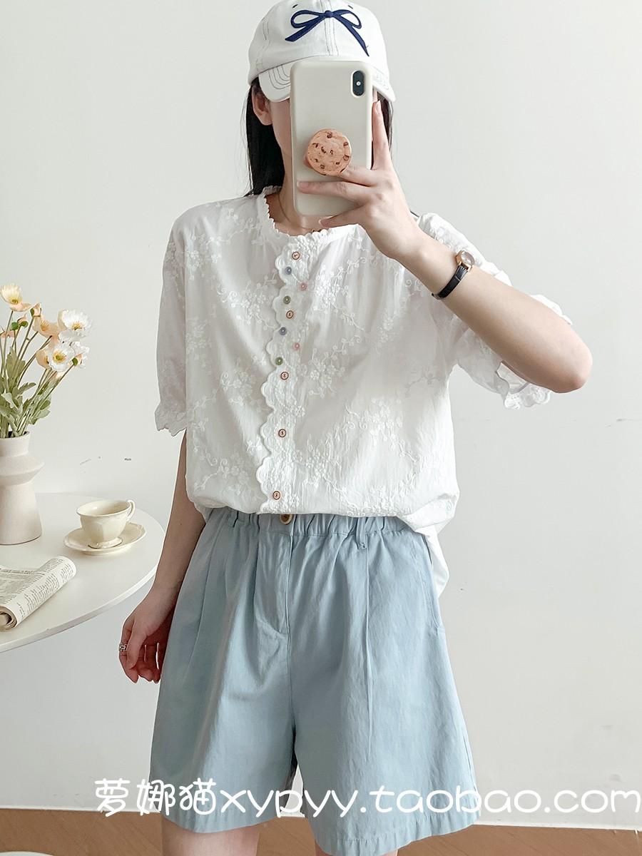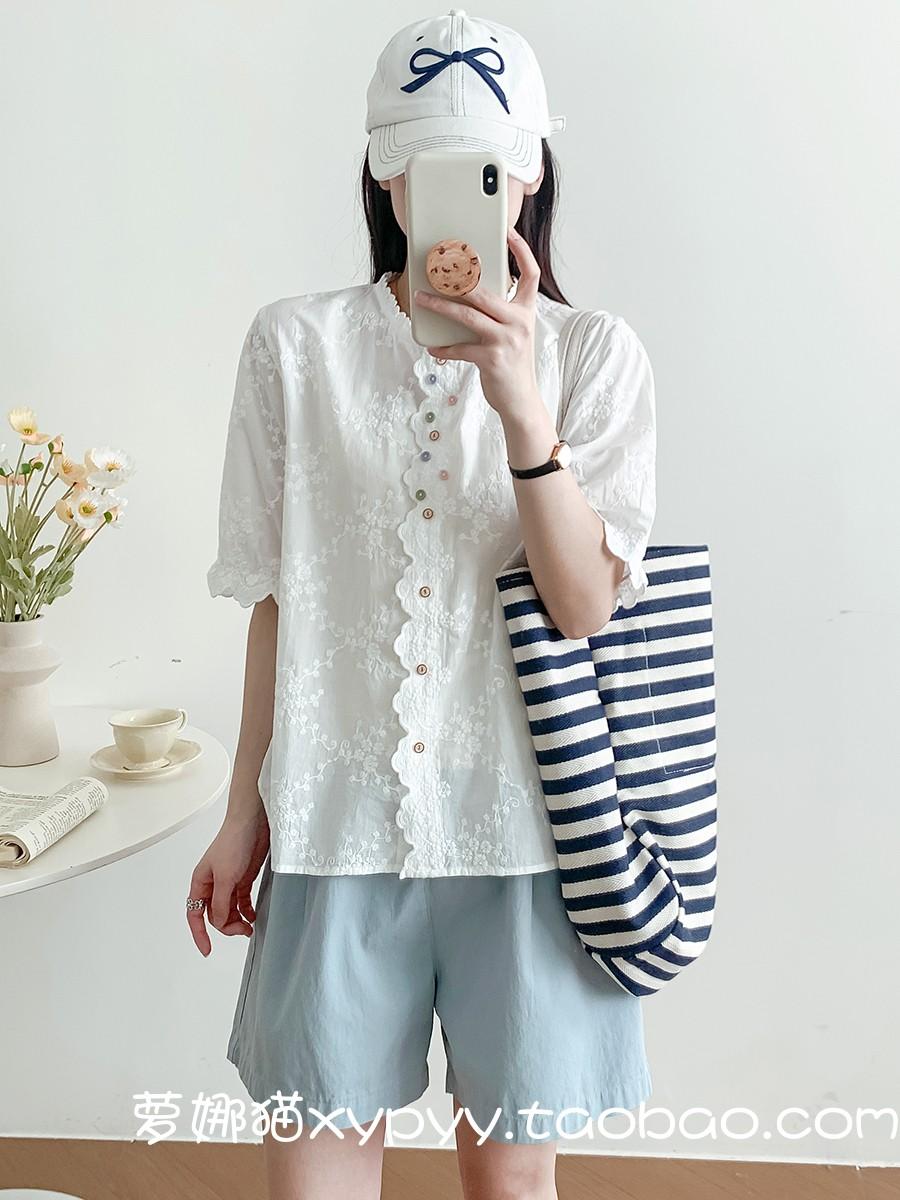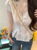 Camisa de Encaje Estilo Francés de Manga Corta para Mujer Verano Bordada con Relieve Chic Color Botón Algodón Top