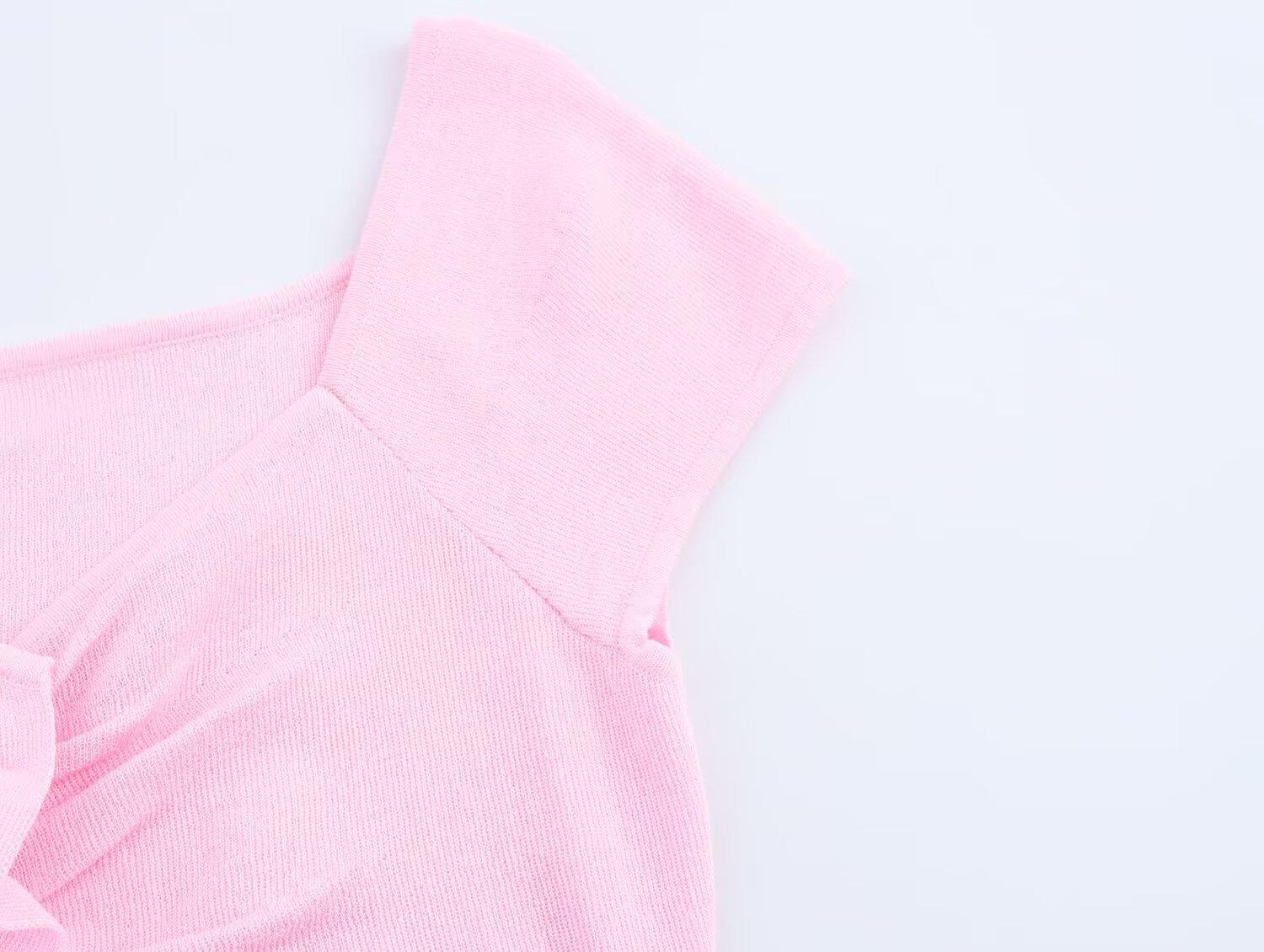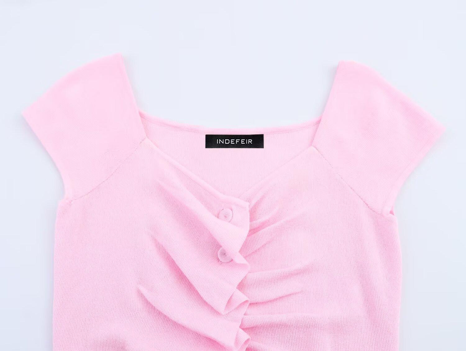 Estilo Europeo y Americano para Mujer Verano 2025 Color Sólido Manga Plisada Moda Ajustado Decorativo Plisado Top de Punto
