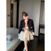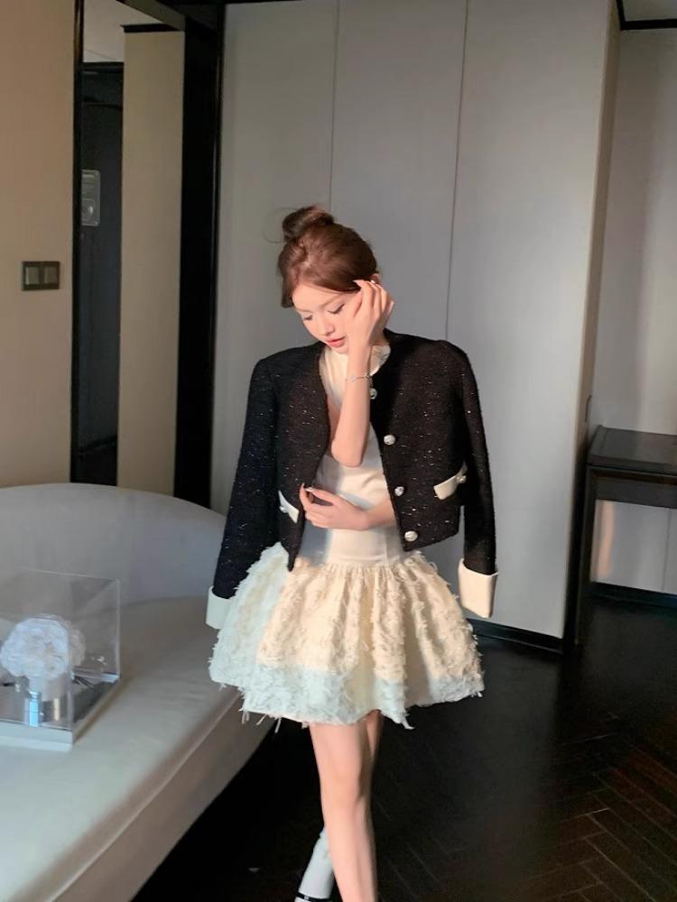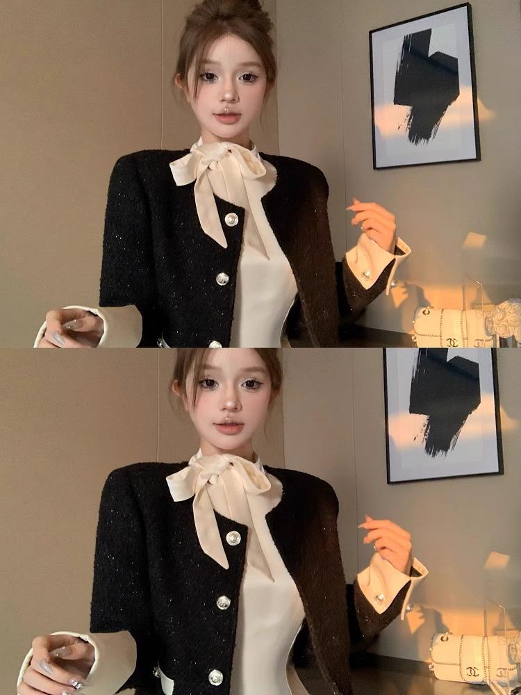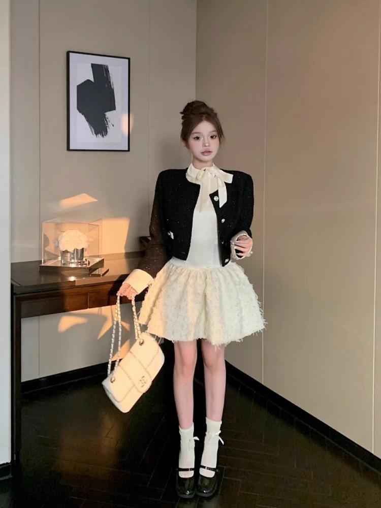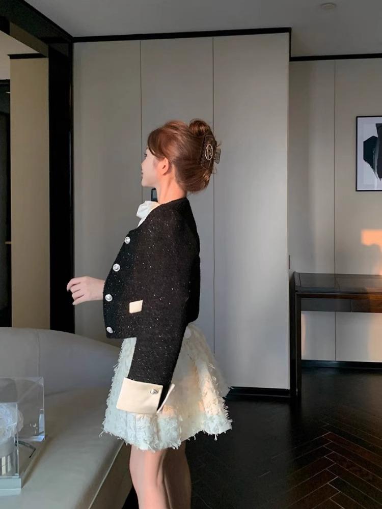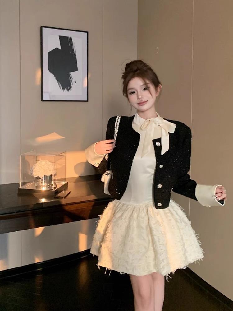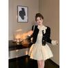 Traje elegante de socialité estilo francés Vestido chaleco con lazo Chaqueta corta estilo Chanel para mujer Primavera y otoño Vestido de dos piezas
