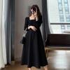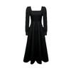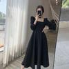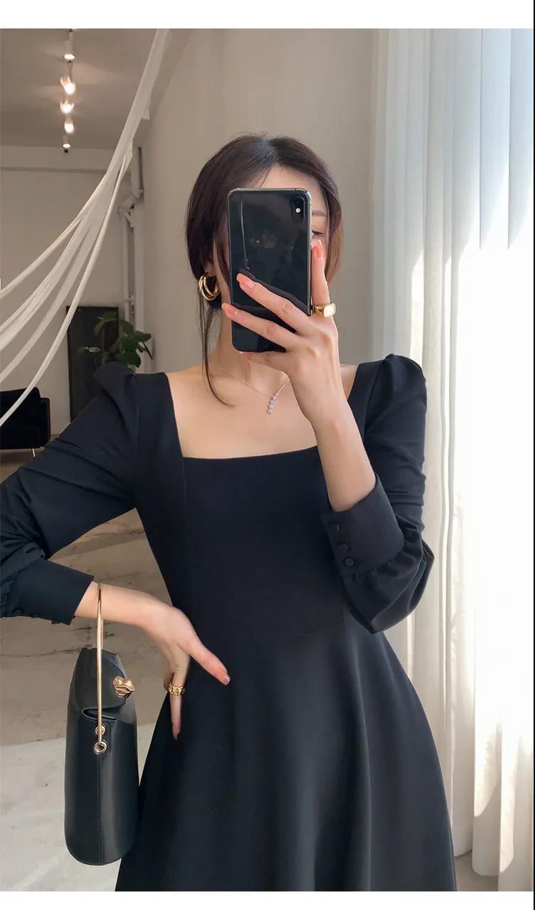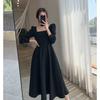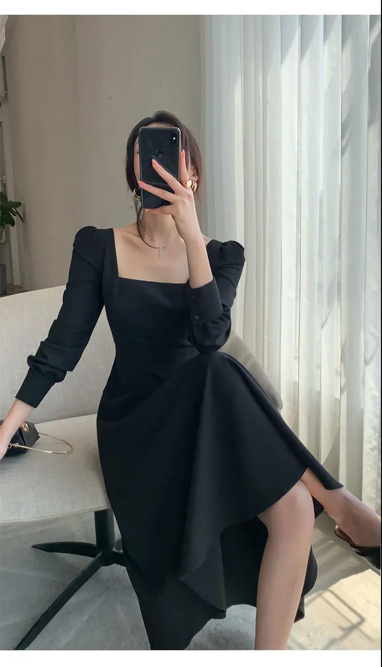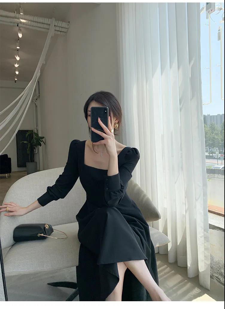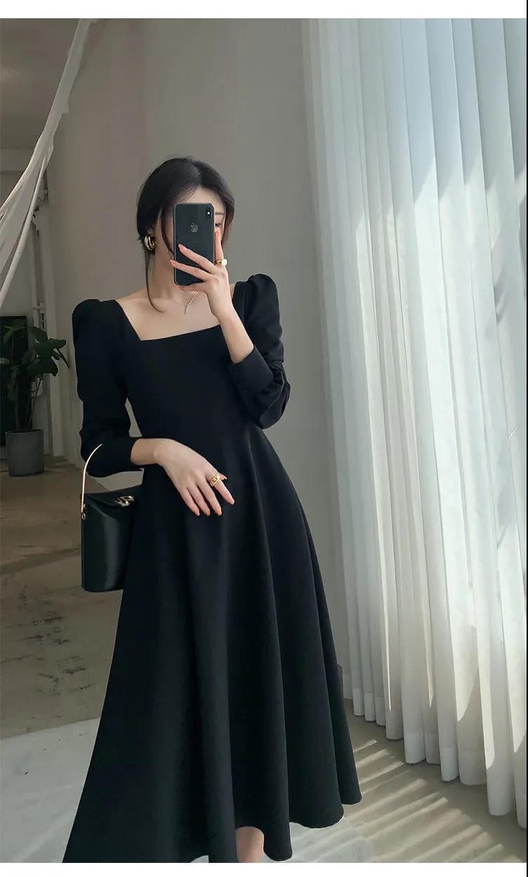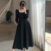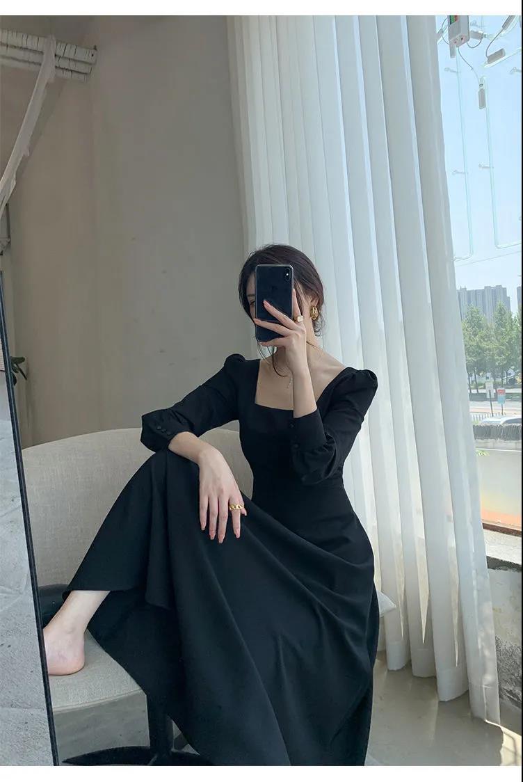 Vestido Negro Cuello Cuadrado Talla Grande para Mujer Nuevo Otoño Temprano Estilo Francés Cintura Ajustada Adelgazante Elegante Estilo Hepburn Falda Larga Moderna