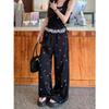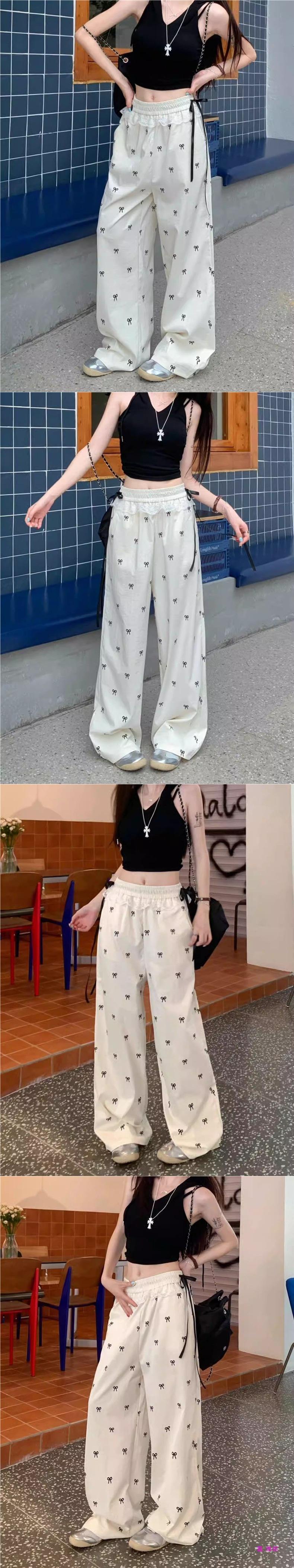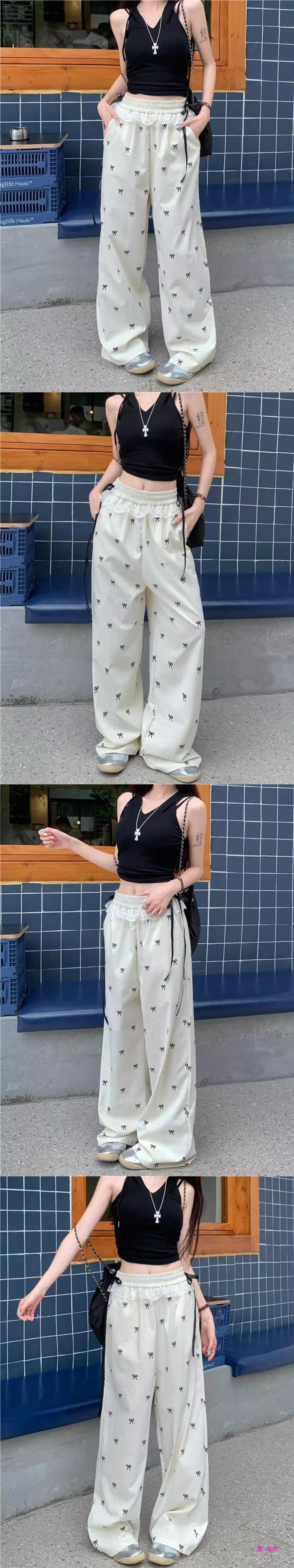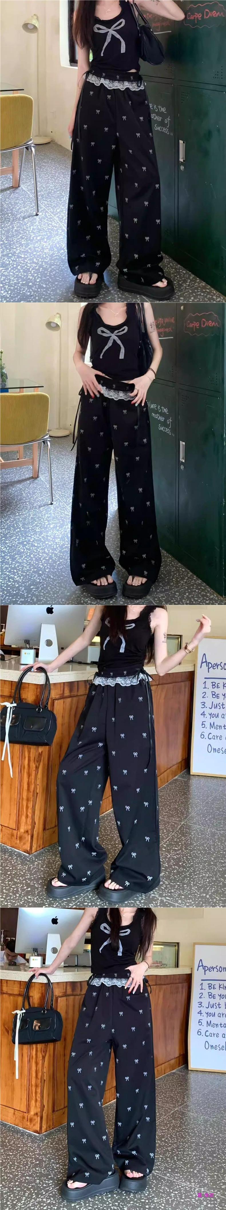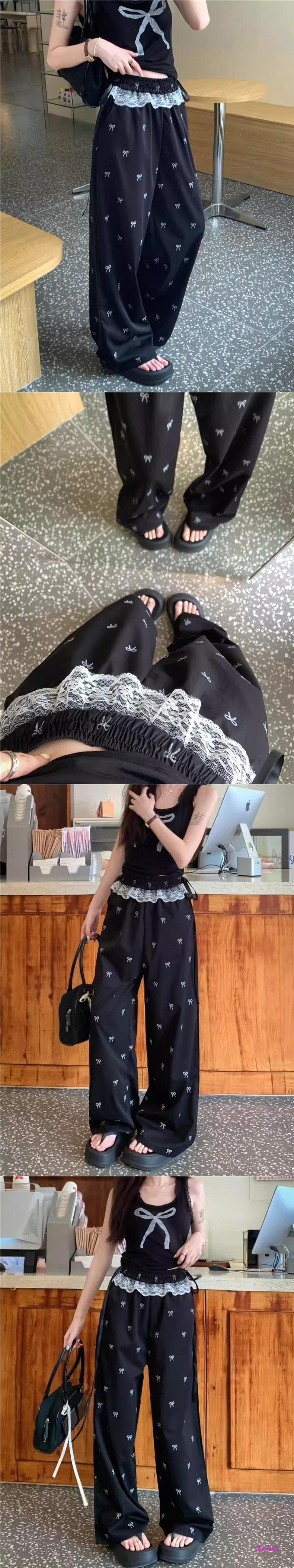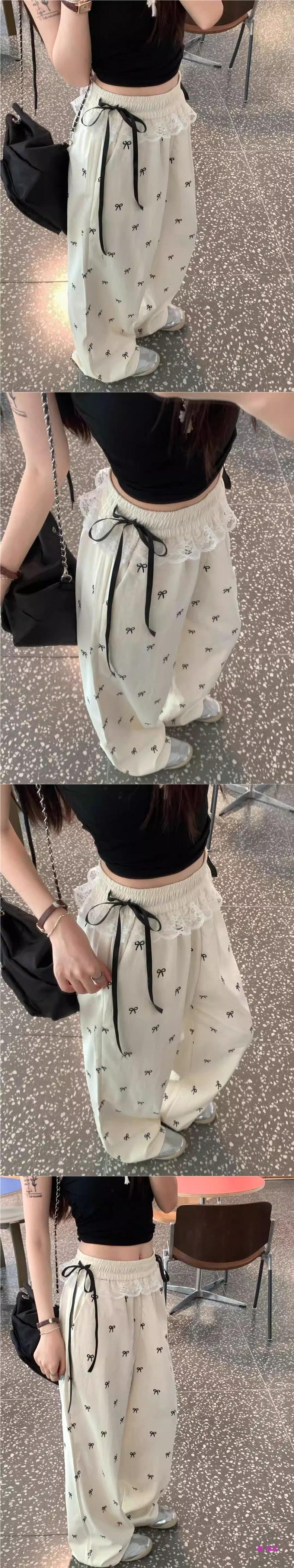 Pantalones casuales con costuras de encaje Sweet Spice Girl, pantalones con lazo, pantalones holgados de verano para mujer, pantalones de pierna ancha y cintura recta.