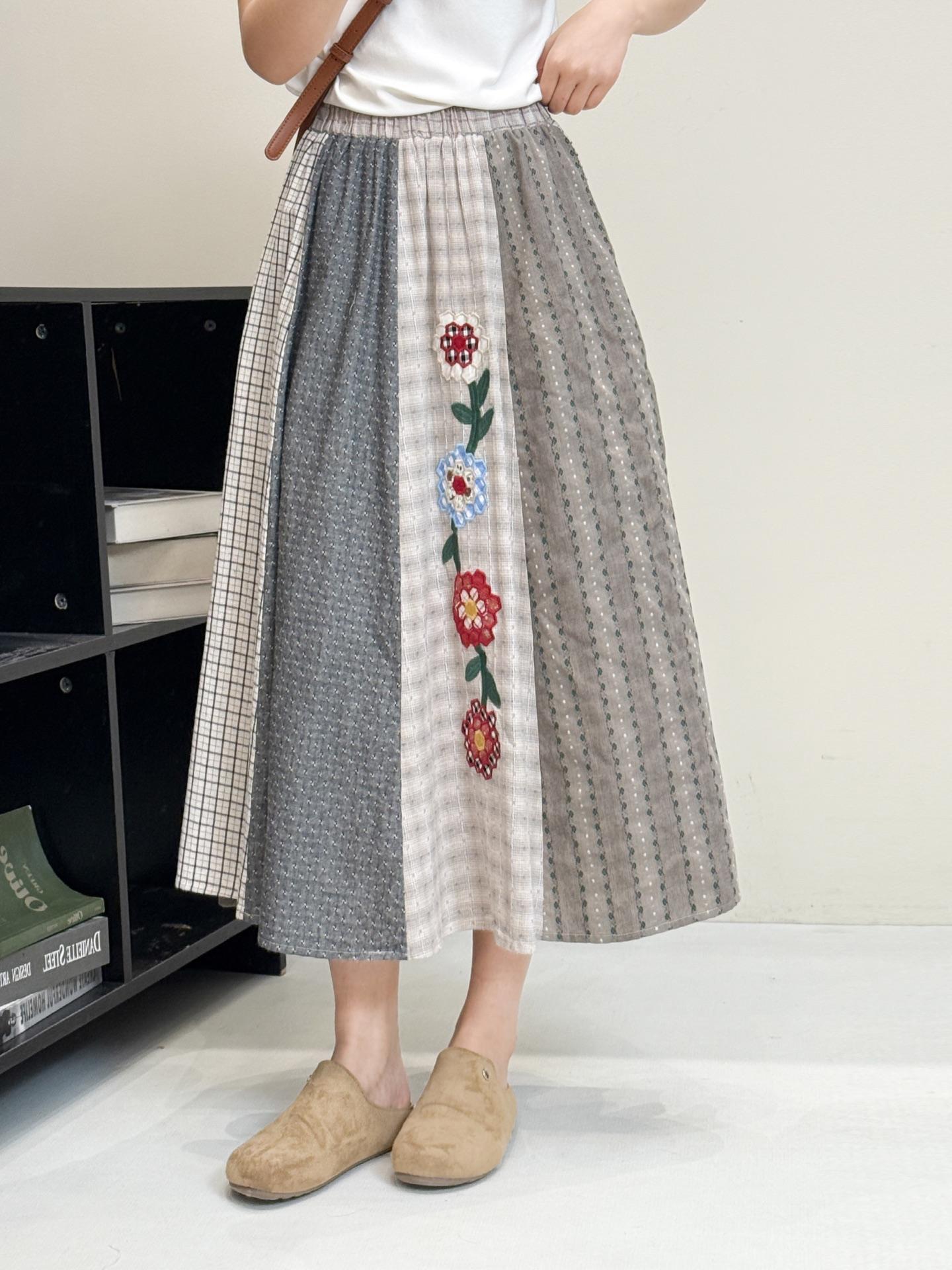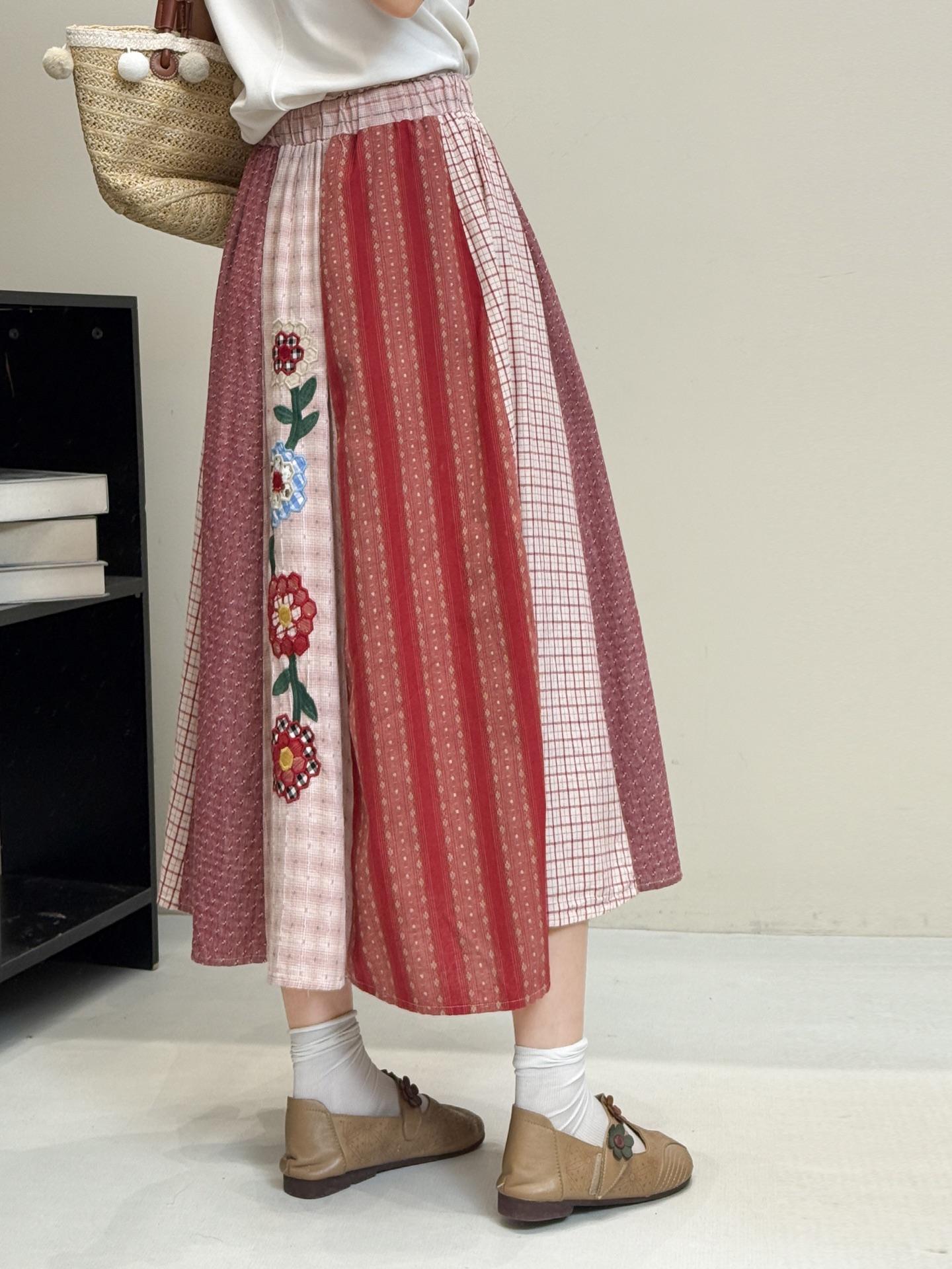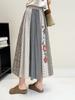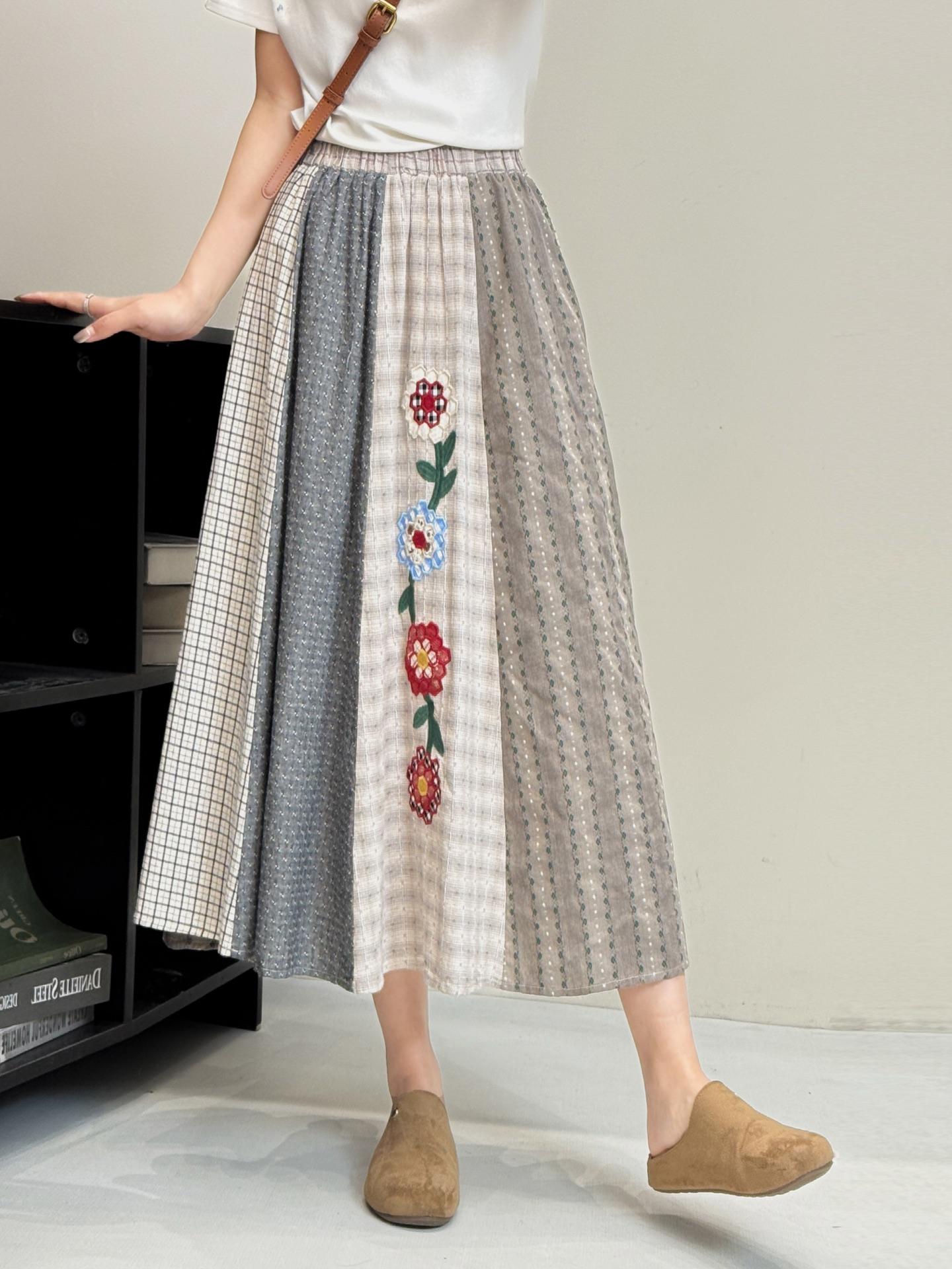 2025 Nueva Falda Midi de Algodón y Lino con Empalme Retro Bordado para Chica Mori, Adelgazante y Dulce, Versátil