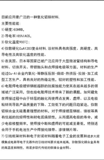 5) Se ha utilizado ampliamente en estructuras de tubos de microondas grandes y materiales conductores, interruptores de conmutación, contactos de plata y electrodos de soldadura por puntos en los Estados Unidos, Japón y otros países. El material se produce mediante el proceso de oxidación interna de aleación Cu-Al, prensado isostático-sinterización-extrusión en caliente-trefilado-procesamiento y conformado. Tiene buena estabilidad térmica, buena plasticidad y rendimiento de procesamiento.