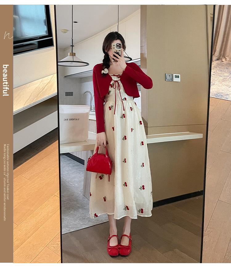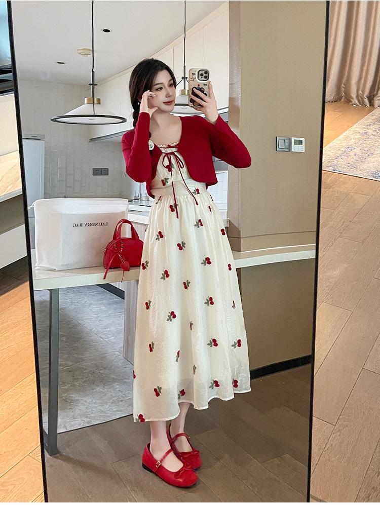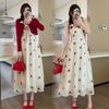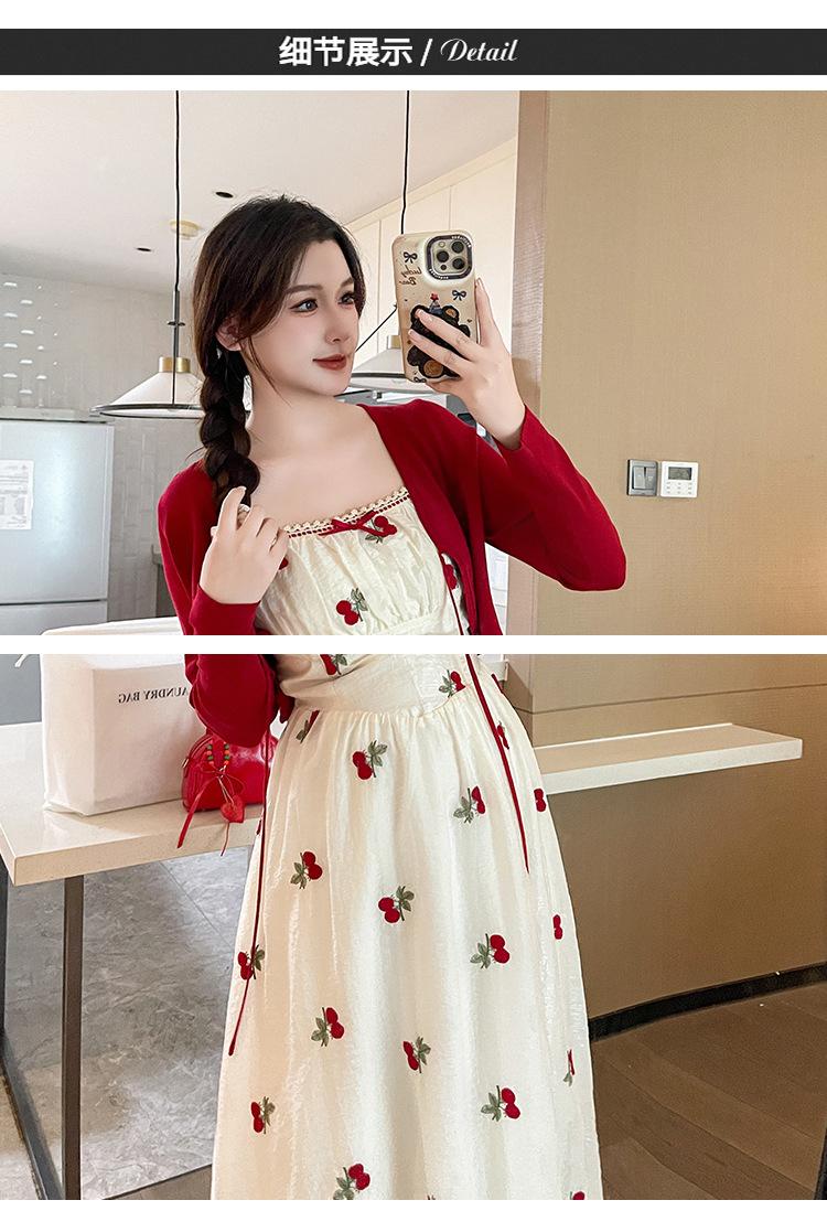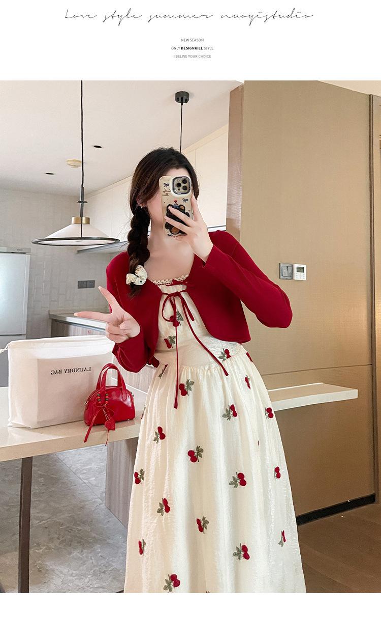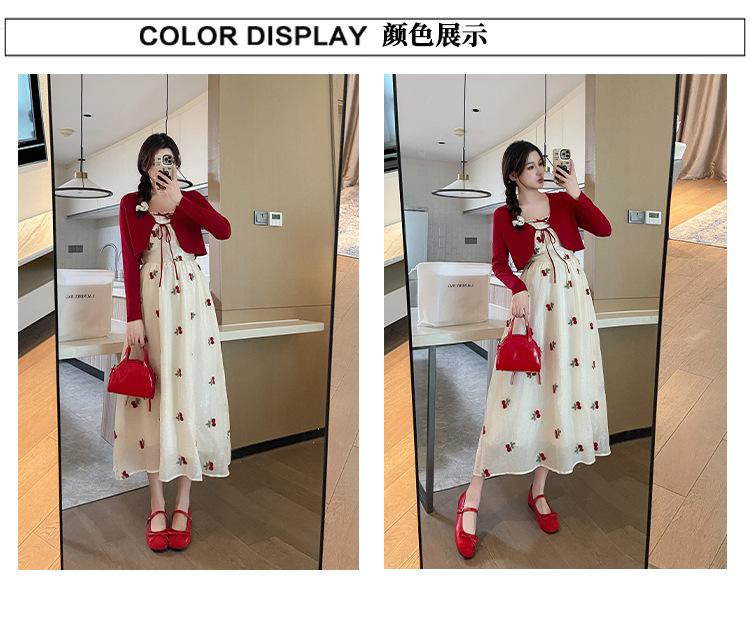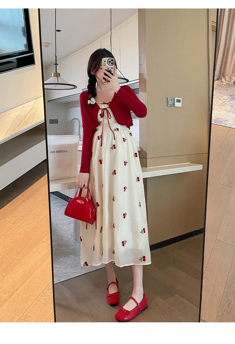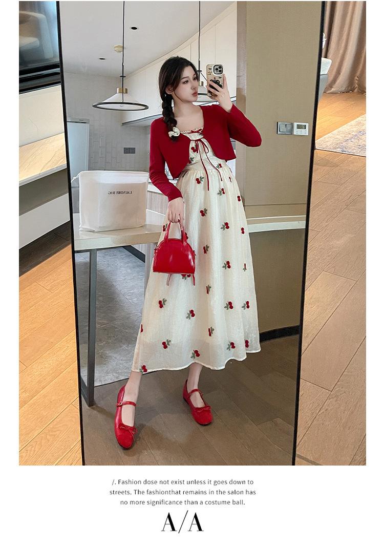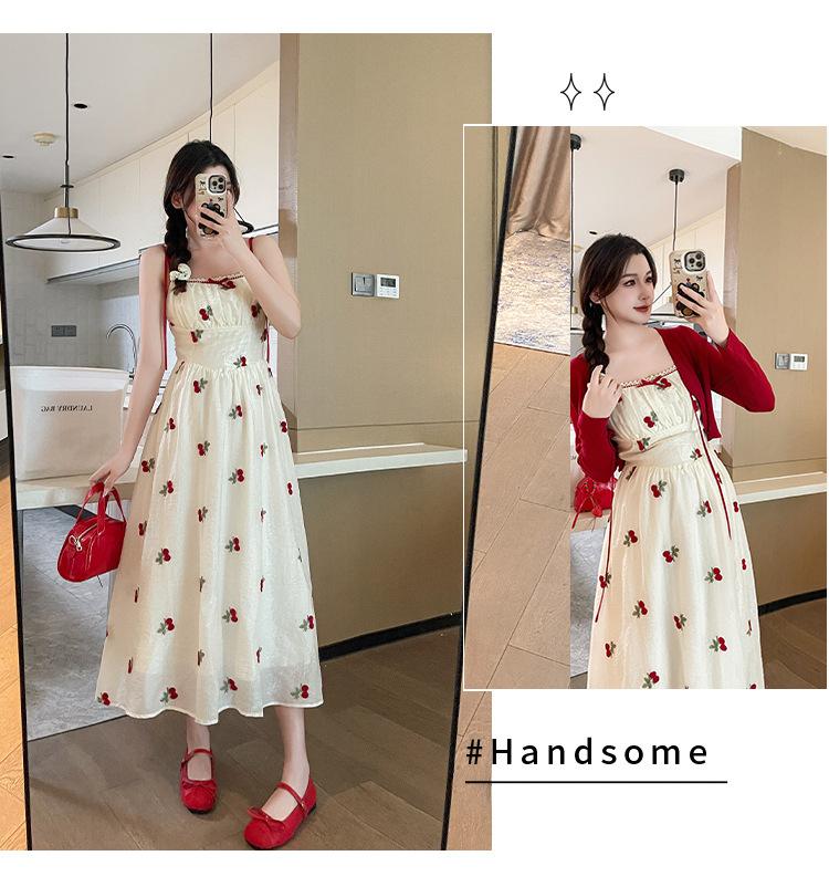 Maternidad 2025 Verano Nuevo Dulce Estilo Francés Elegante Slim Bordado Vestido de Tirantes Cárdigan Conjunto de Dos Piezas