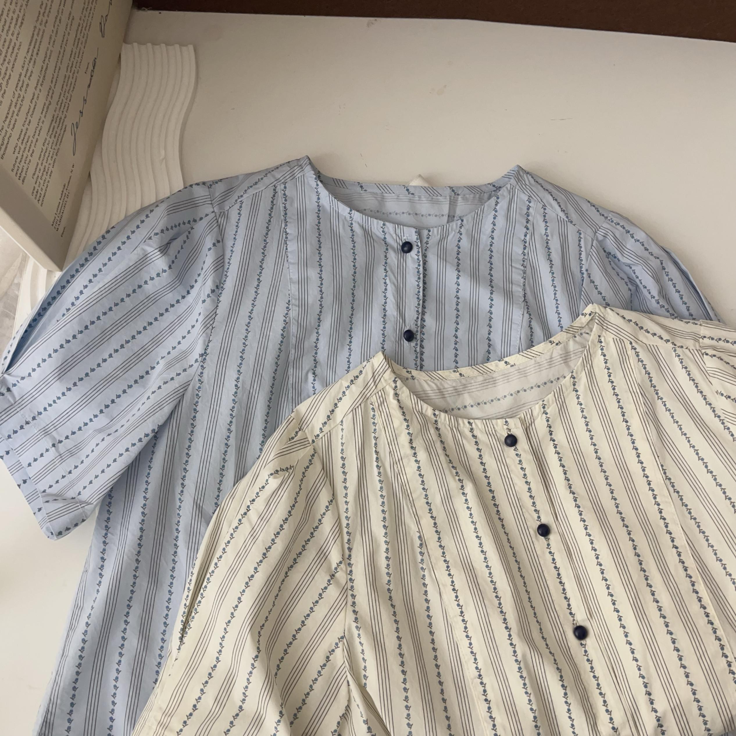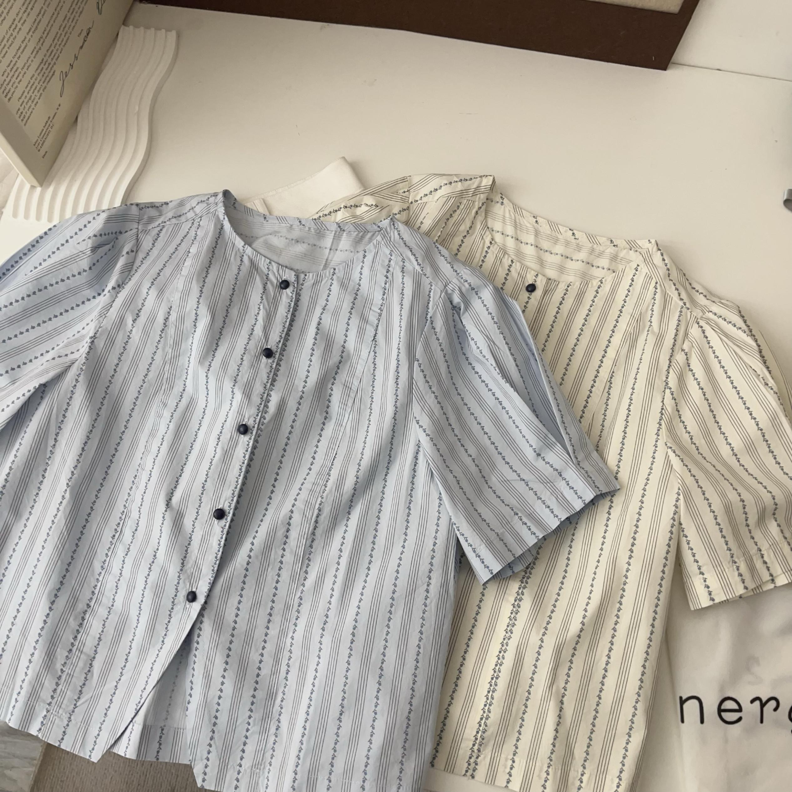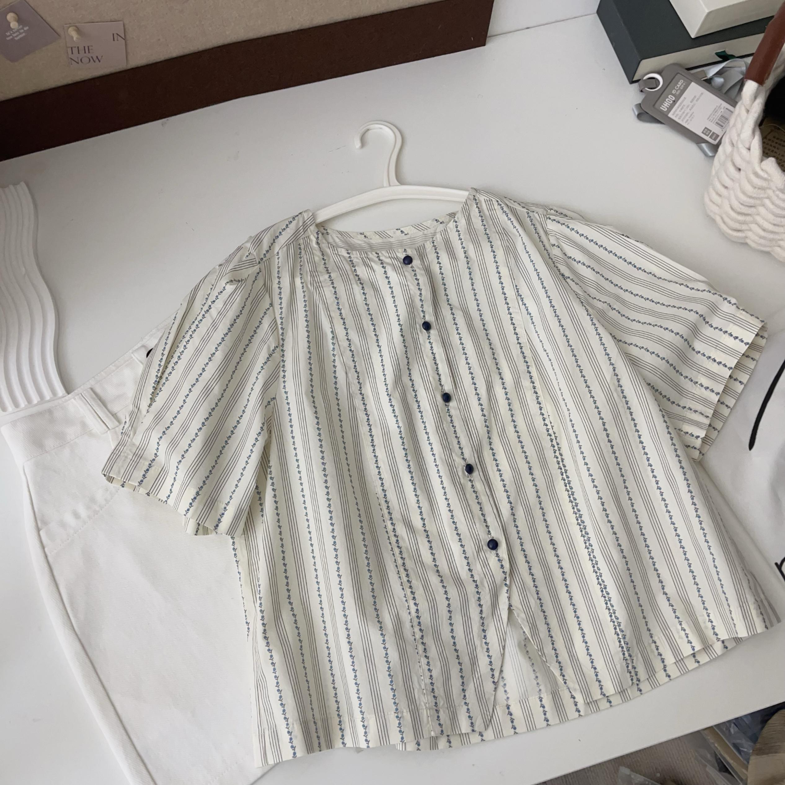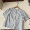 2025 Nuevo Verano Estilo Coreano Moda Cuello Redondo Rayas Verticales Camisa de Manga Corta para Mujer Aspecto Adelgazante Holgado Camisa Estampada Top