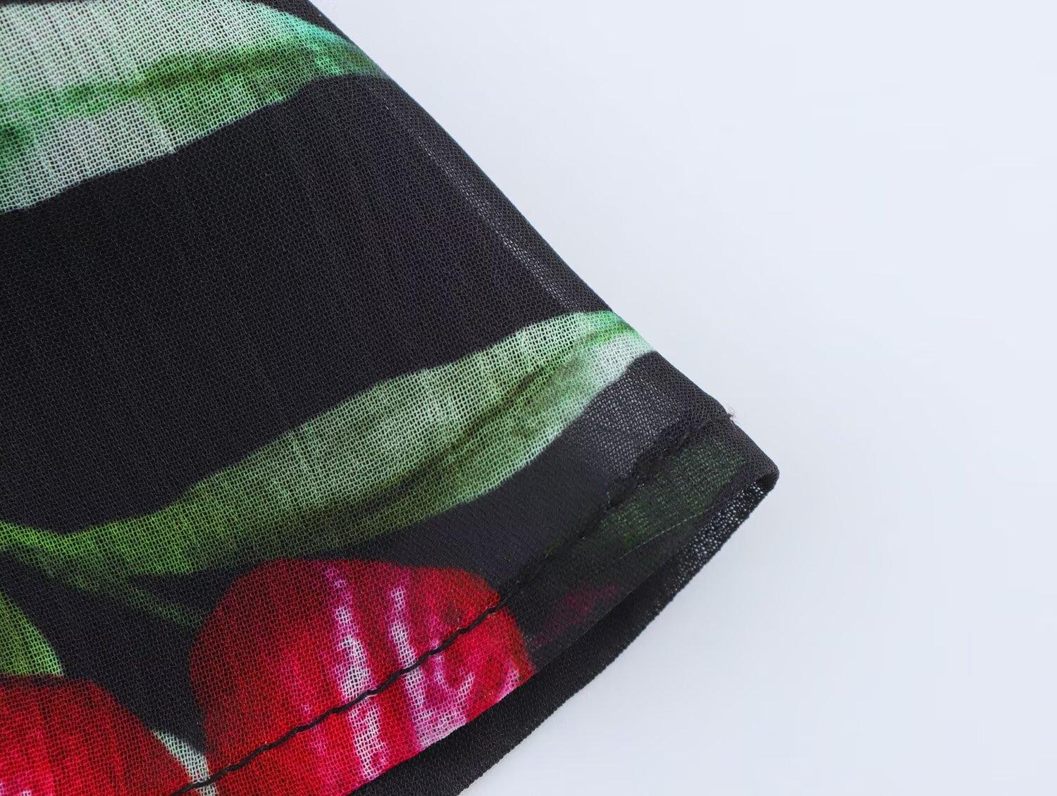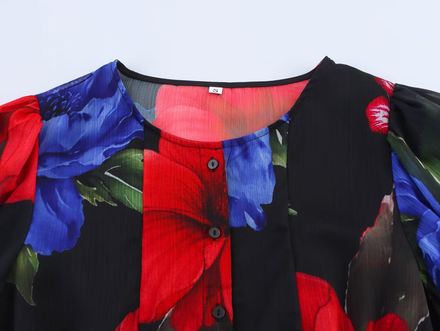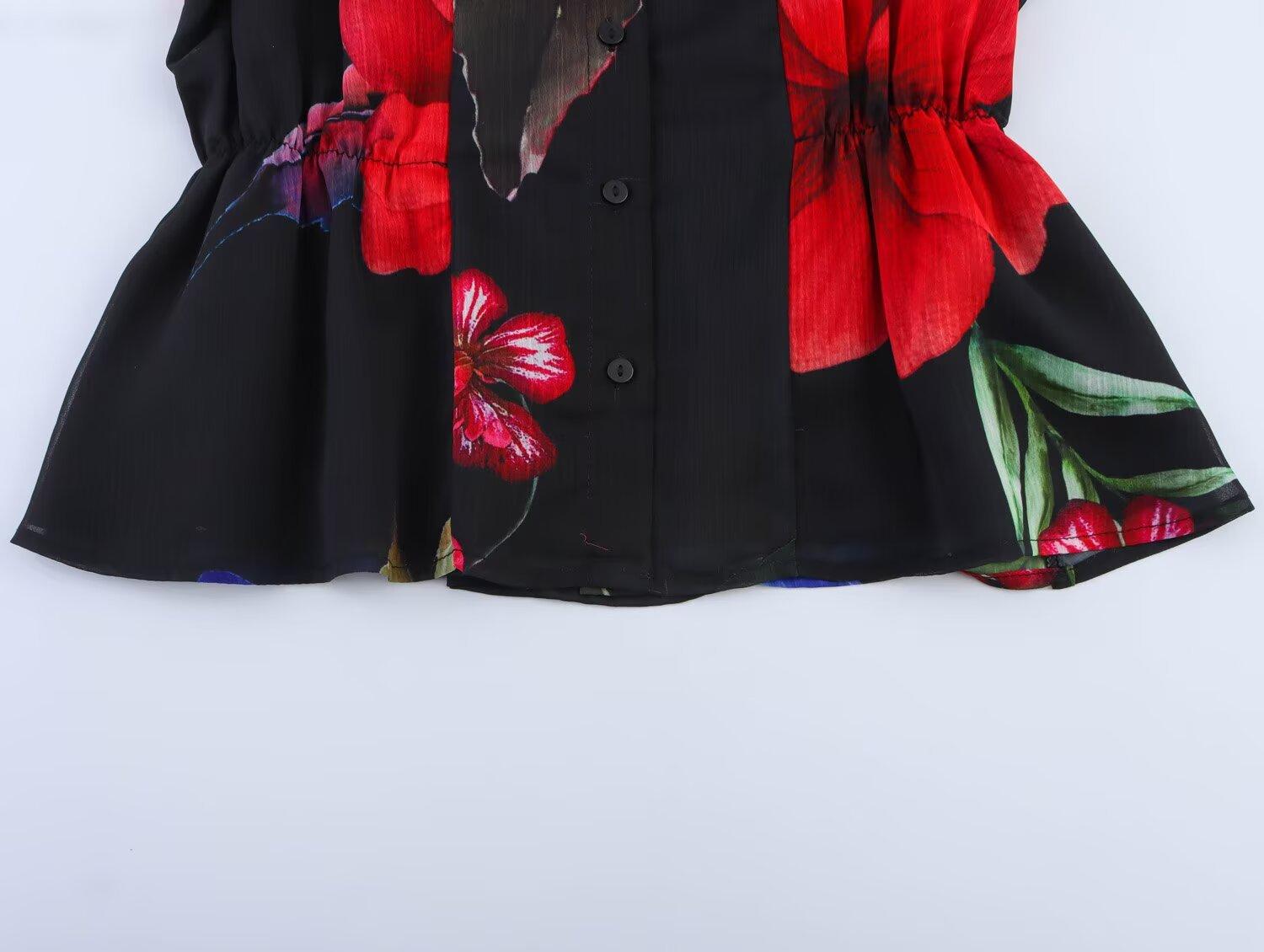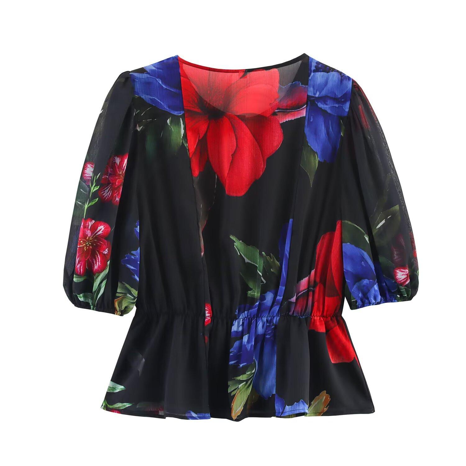 2025 Nueva Ropa de Verano para Mujer Estilo Europeo y Americano Moda Sencilla Versátil Chifón Estampado Cintura Cuello Redondo Top