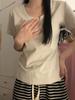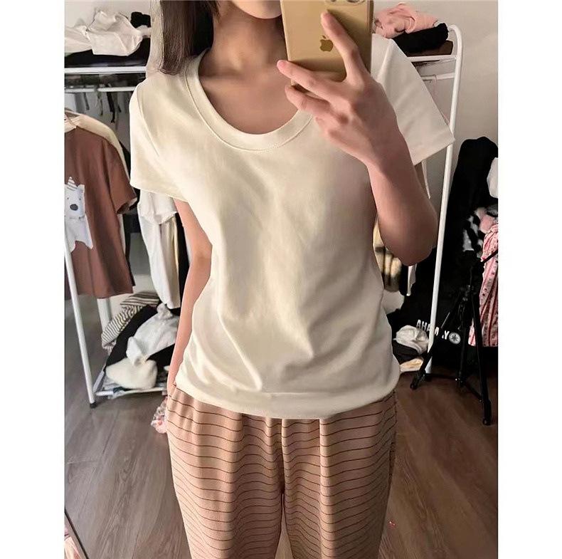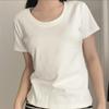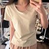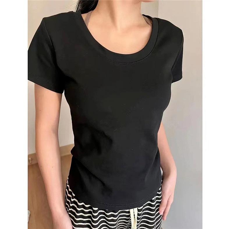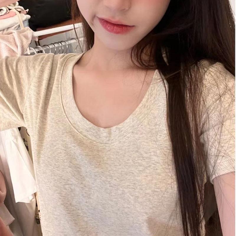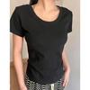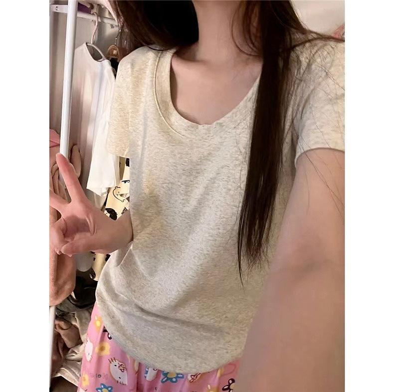 Verano 2025 Nueva Camiseta de Hombro para Mujer Manga Corta Ajustada Adelgazante Cuello U Estilo Coreano Gris Cuello Redondo Top Básico