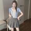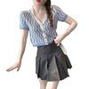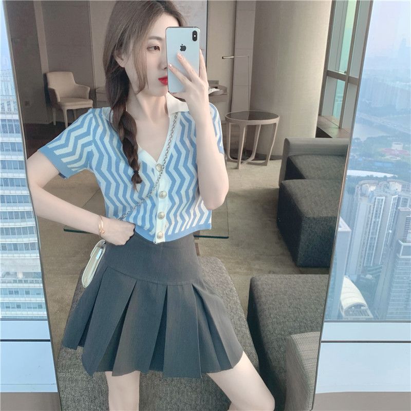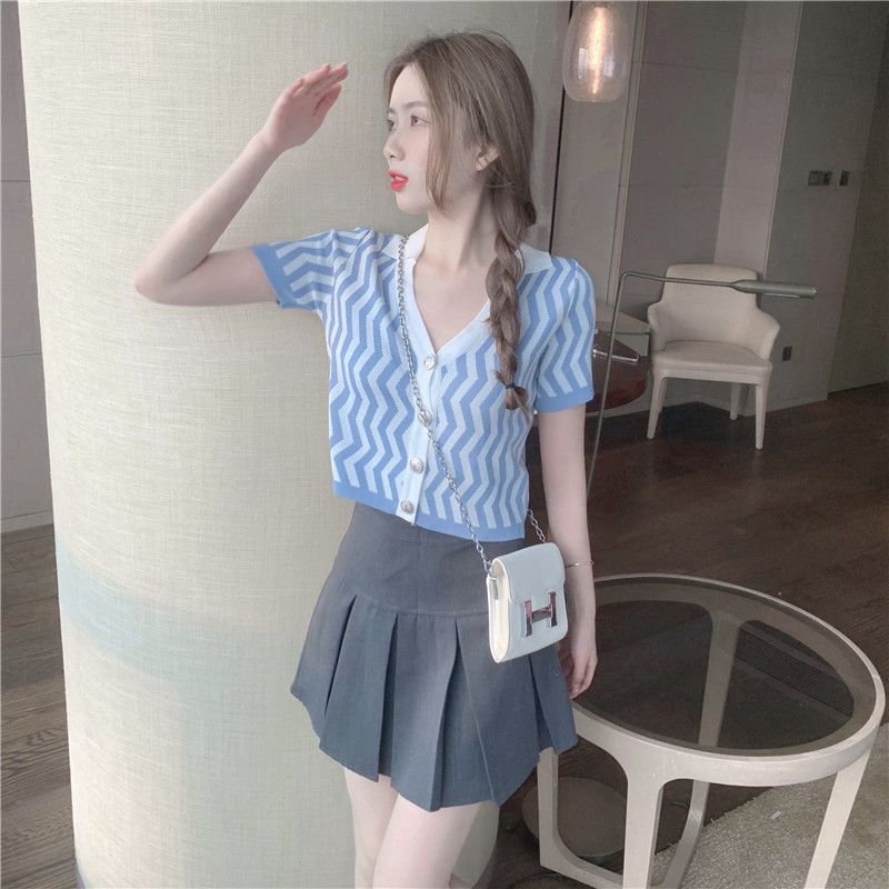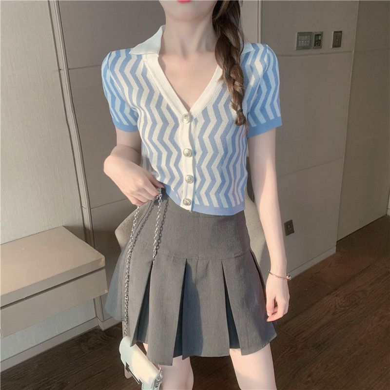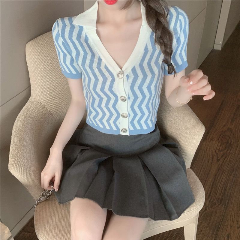 Playera de Manga Corta con Cuello Polo a Rayas Estilo Francés 2025 Verano Nuevo Chic Cuello en V Dulce Reductora de Edad Tejido de Punto Corto Versátil