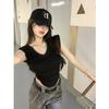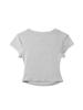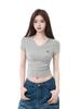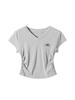 Playera Gris Corta con Cuello en V Manga Corta Hombro Derecho Descubierto para Mujer Verano Sexy Cintura Ajustada Look Adelgazante Top 2025 Nuevo Estilo