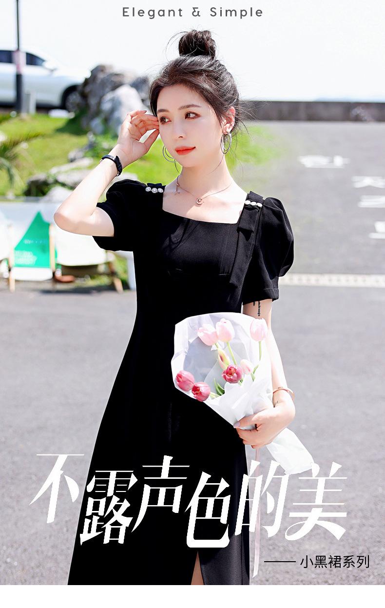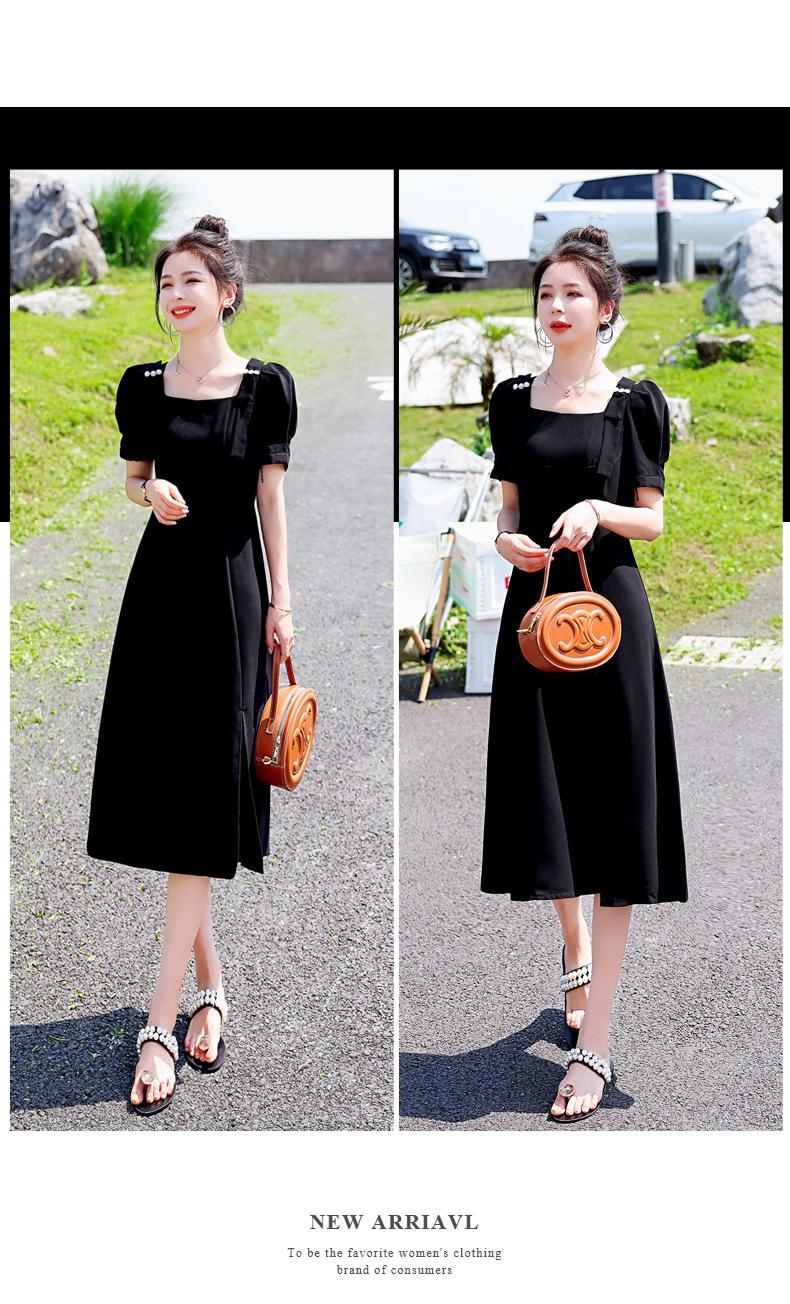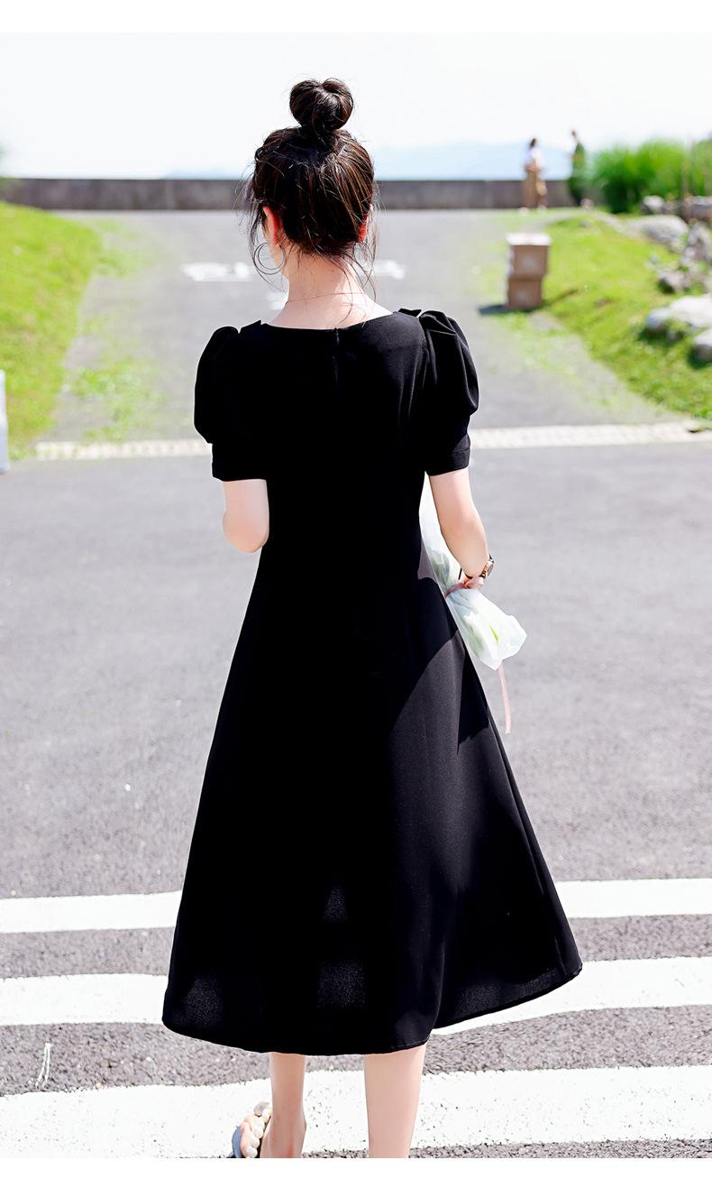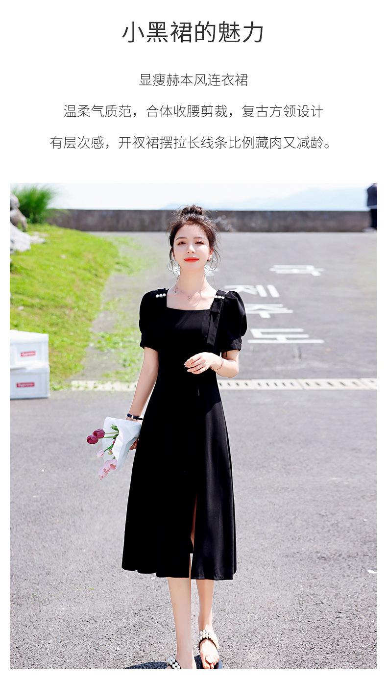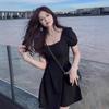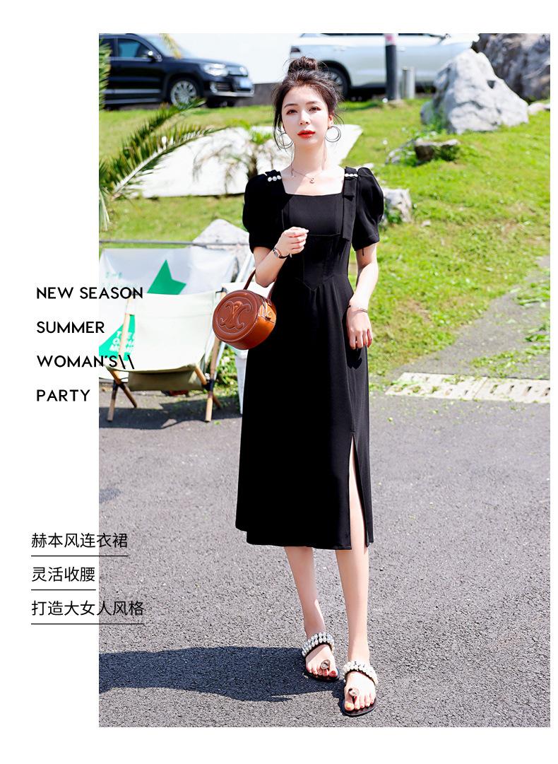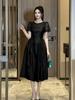 Vestido Negro de Verano 2025 Estilo Hepburn Vestidito Negro con Cintura Adelgazante y Cuello Francés Cuadrado Más Alto Manga Abullonada Vestido Negro Trendy