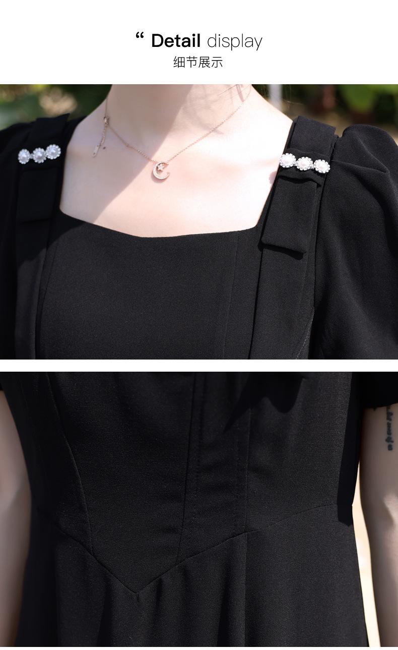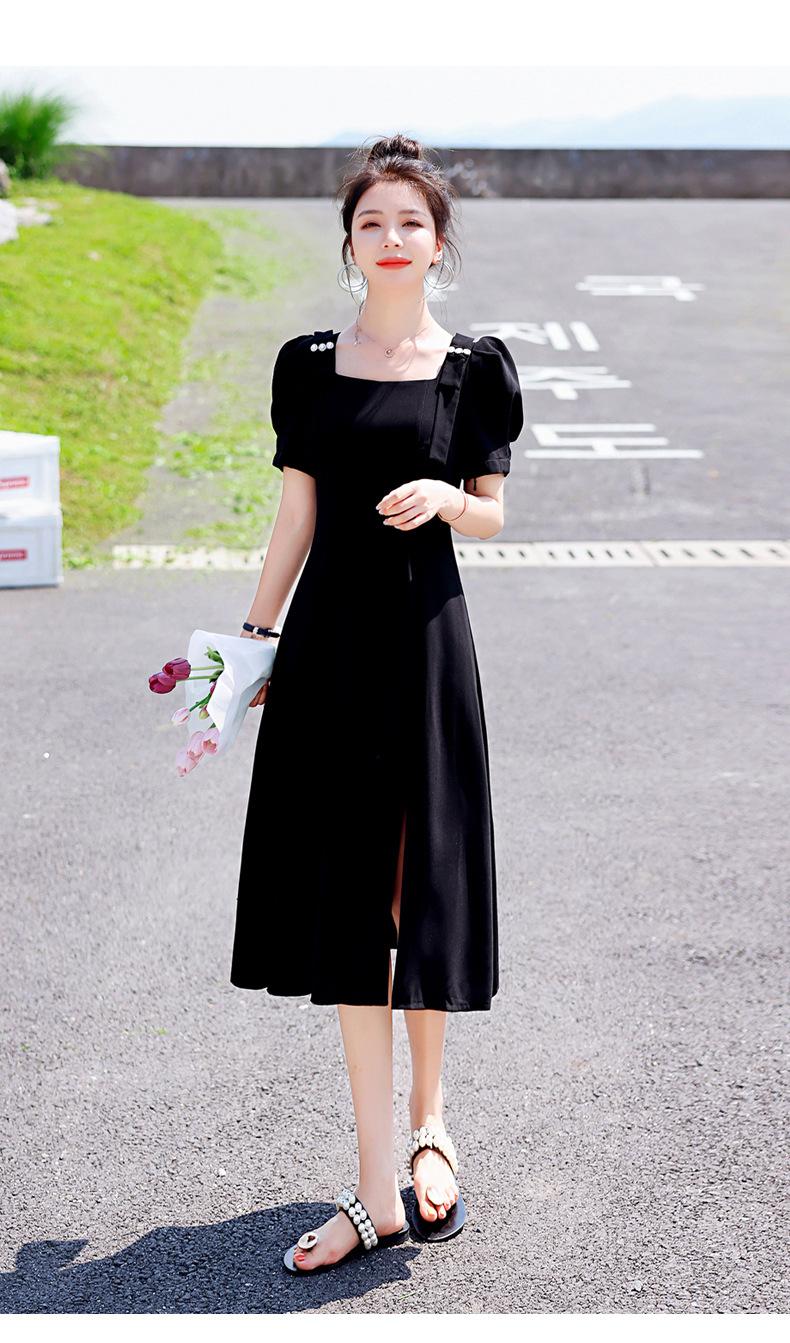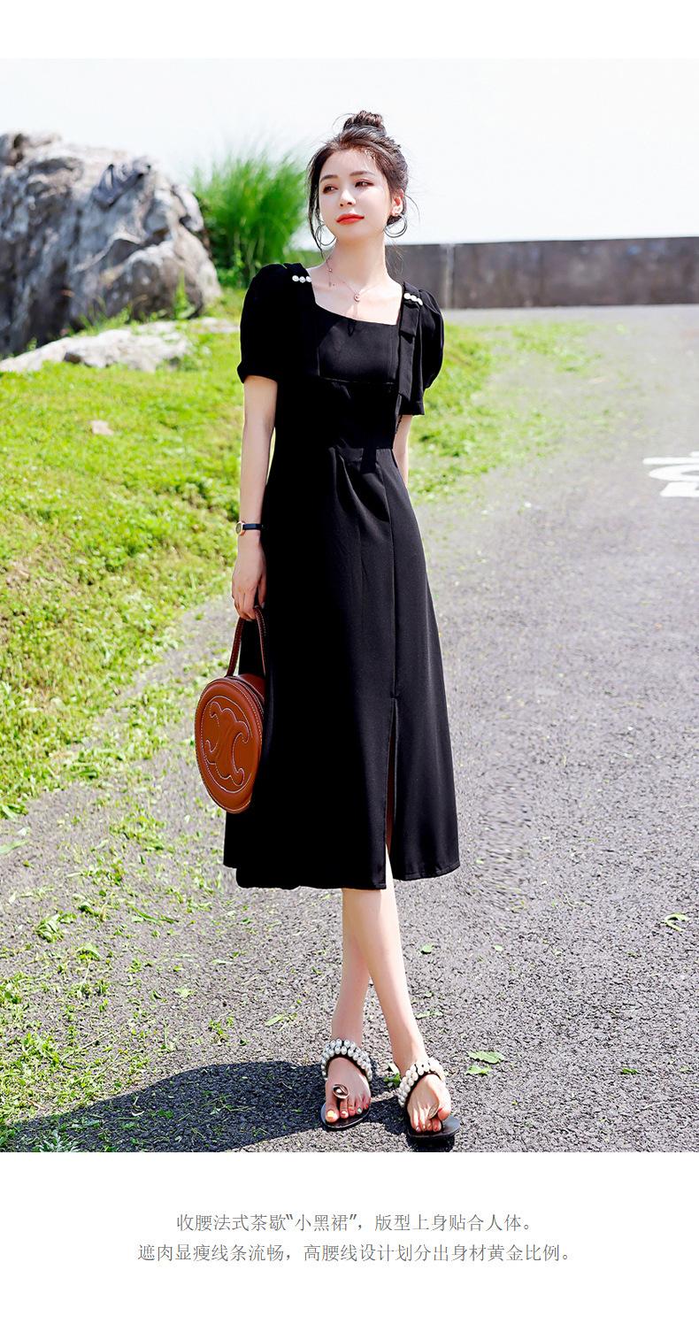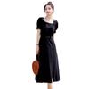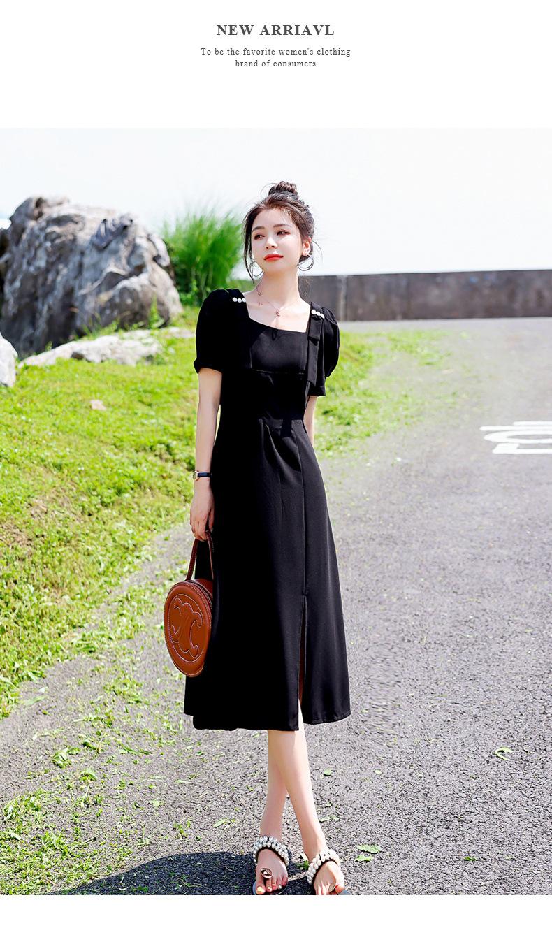 Vestido Negro de Verano 2025 Estilo Hepburn Vestidito Negro con Cintura Adelgazante y Cuello Francés Cuadrado Más Alto Manga Abullonada Vestido Negro Trendy