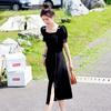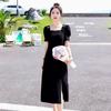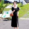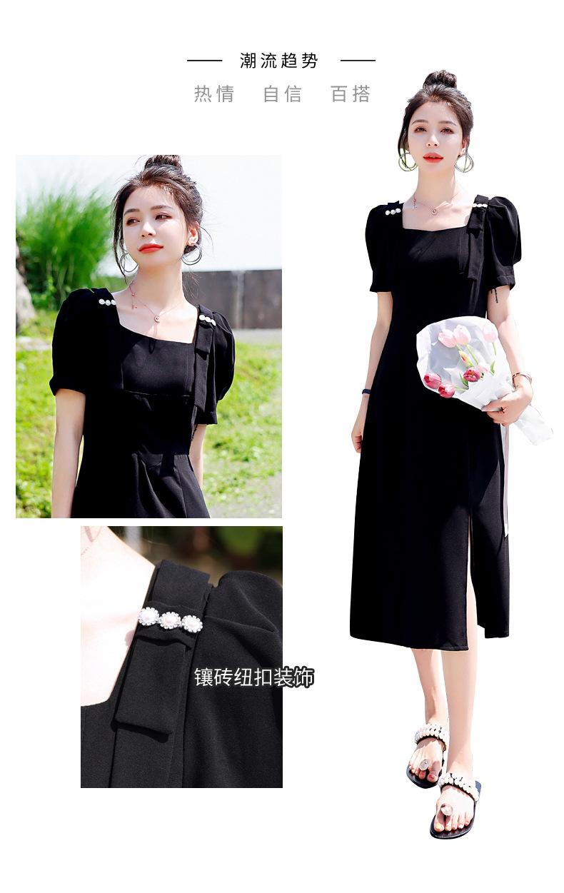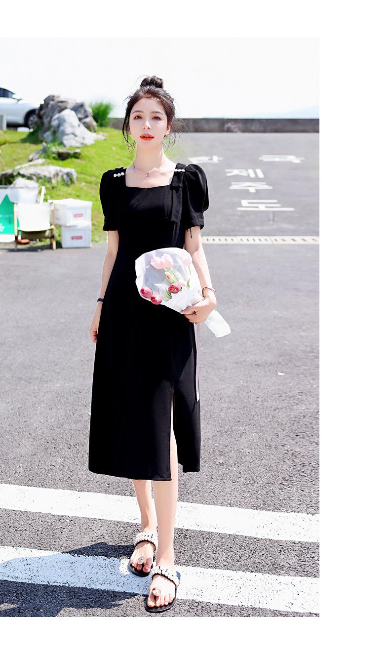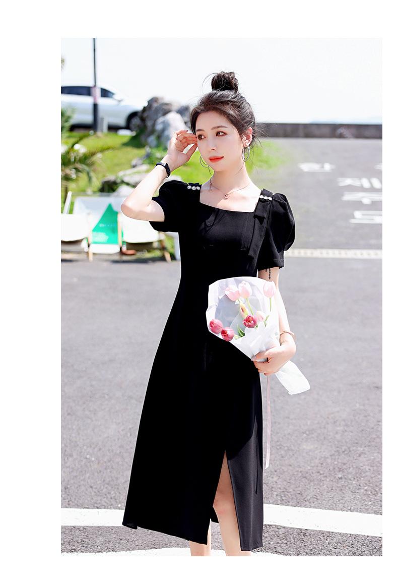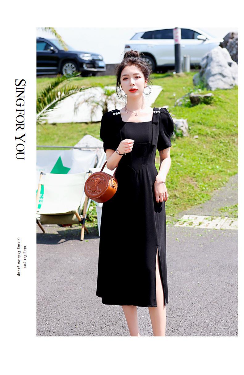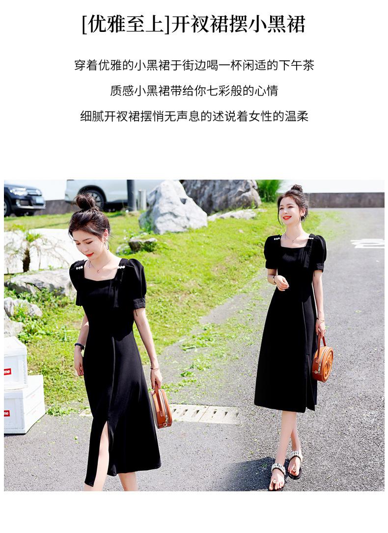 Vestido Negro de Verano 2025 Estilo Hepburn Vestidito Negro con Cintura Adelgazante y Cuello Francés Cuadrado Más Alto Manga Abullonada Vestido Negro Trendy