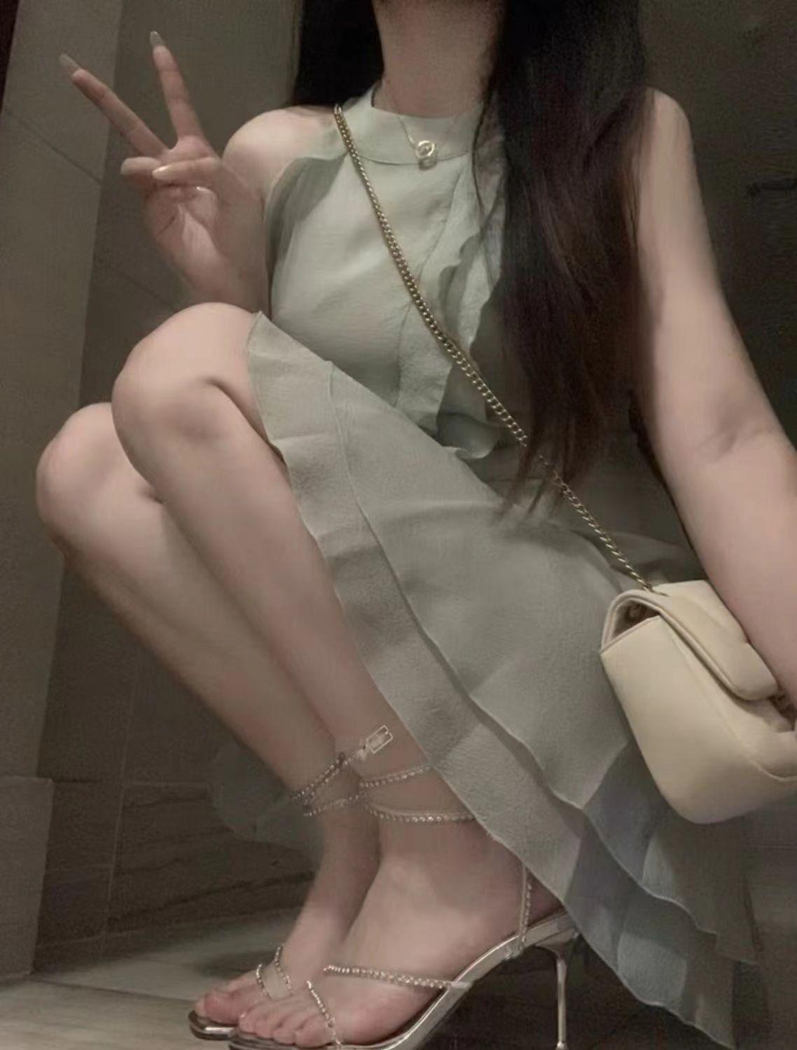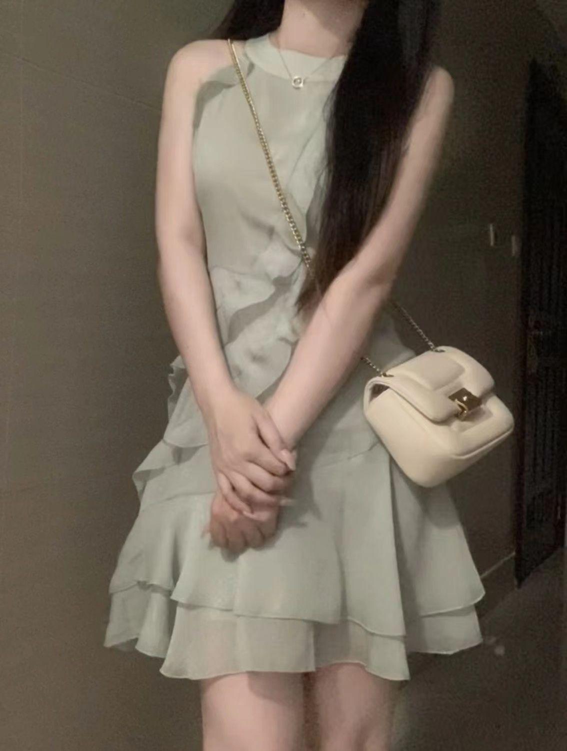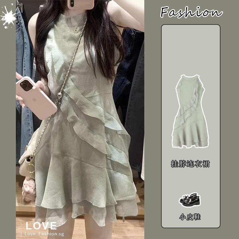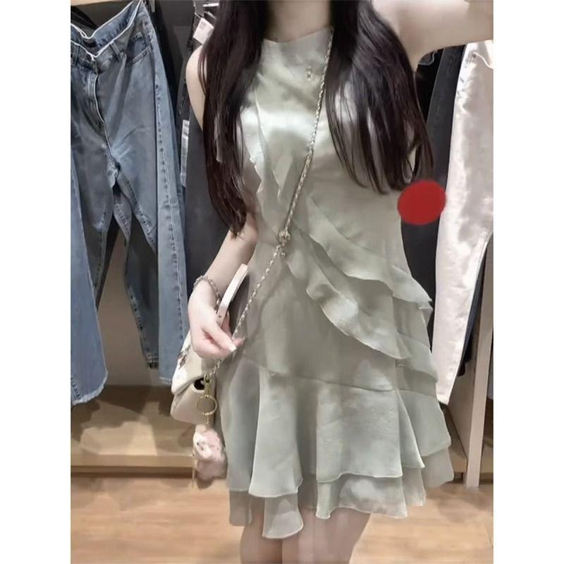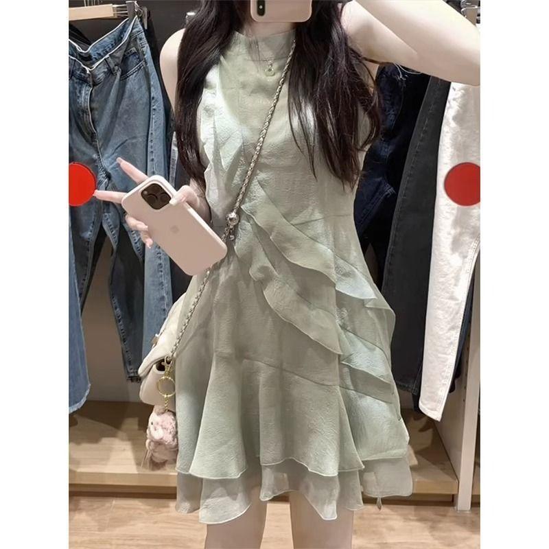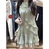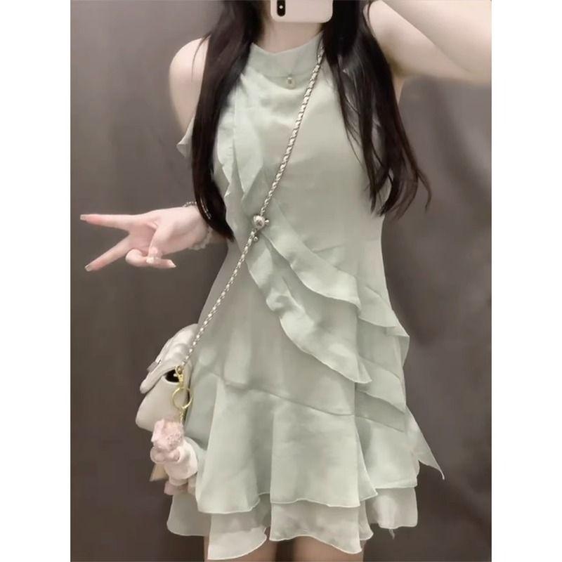 Vestido Francés Delicado con Volantes Fuera del Hombro Halter Verano 2025 Nuevo Look Niche Adelgazante Verde Claro Dulce Falda A-Línea