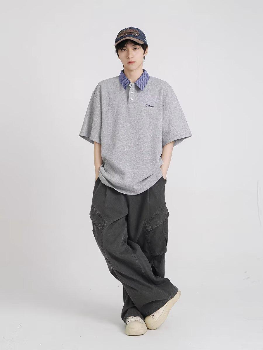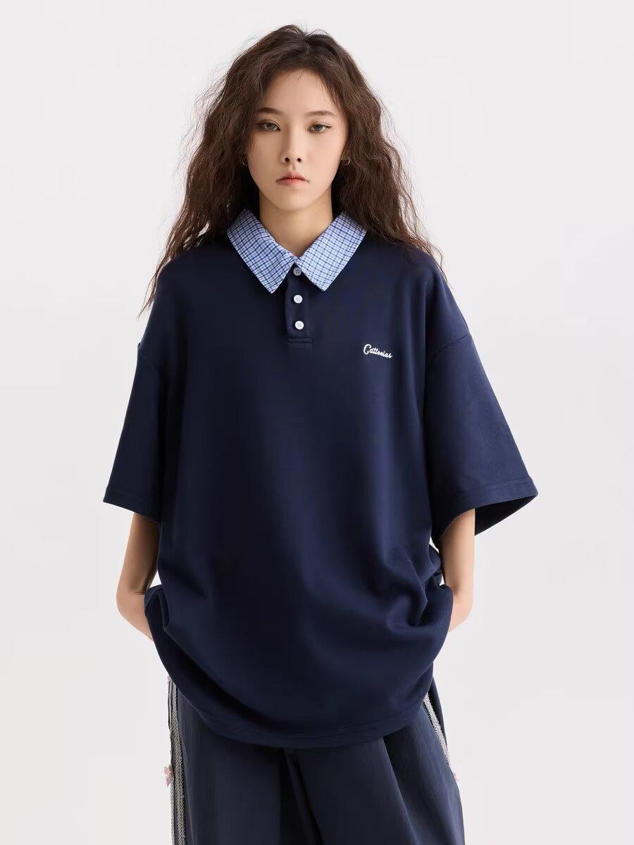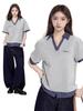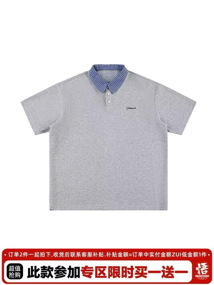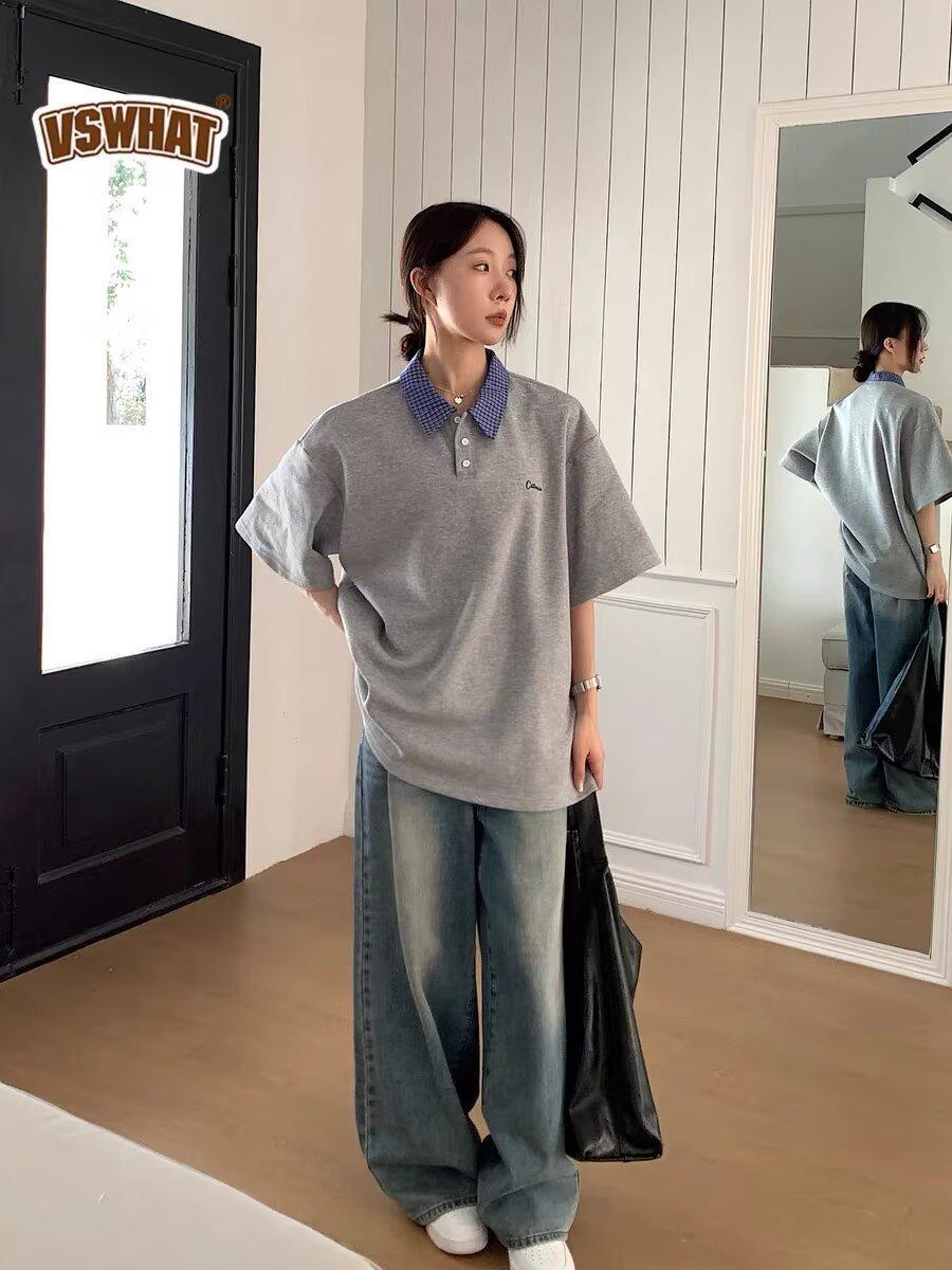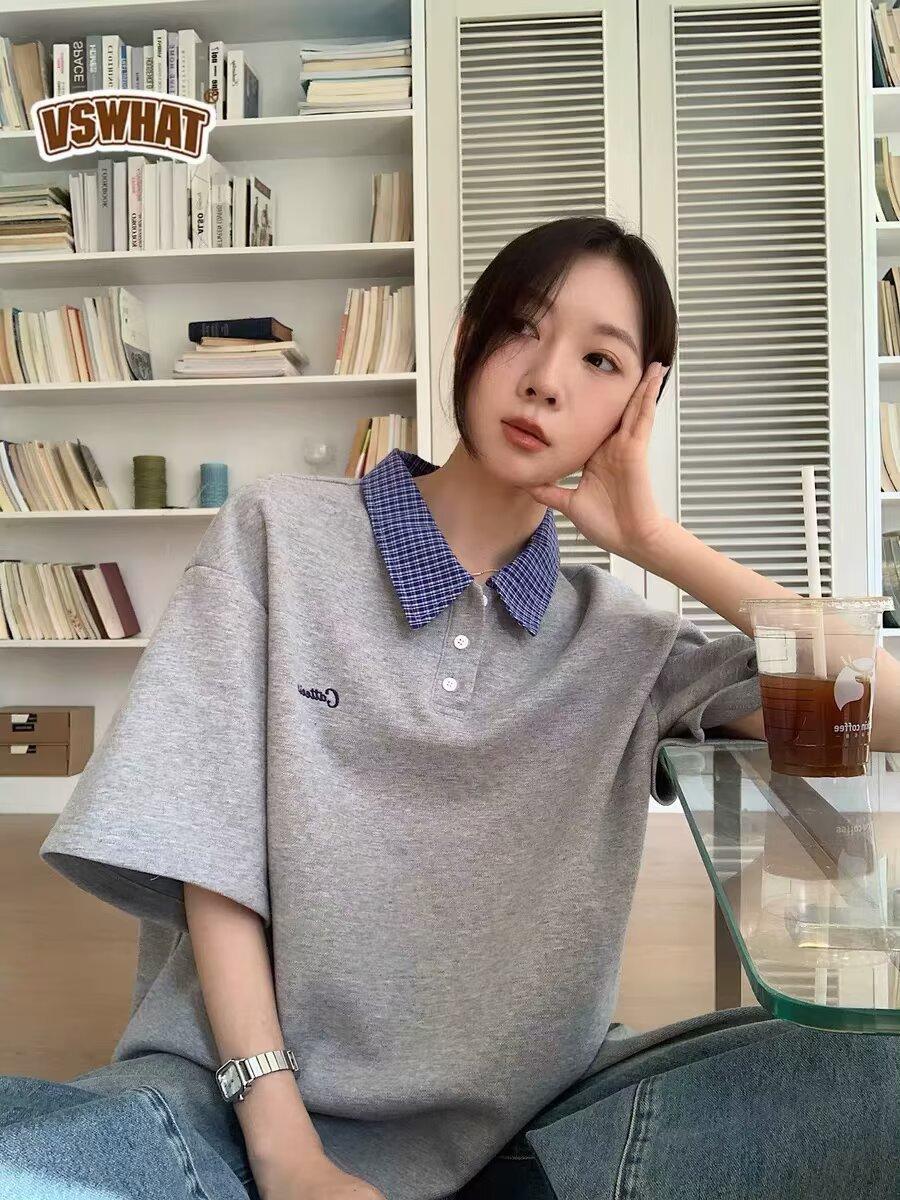 Polo a cuadros gris retro americano con solapa y manga corta, camiseta de verano para mujer con diseño holgado, top falso de dos piezas