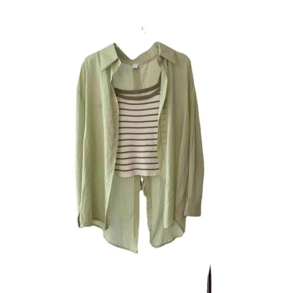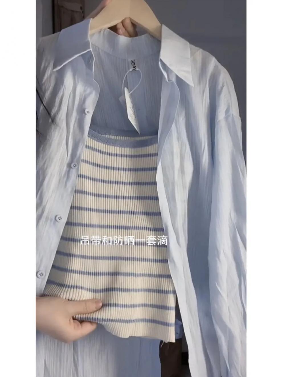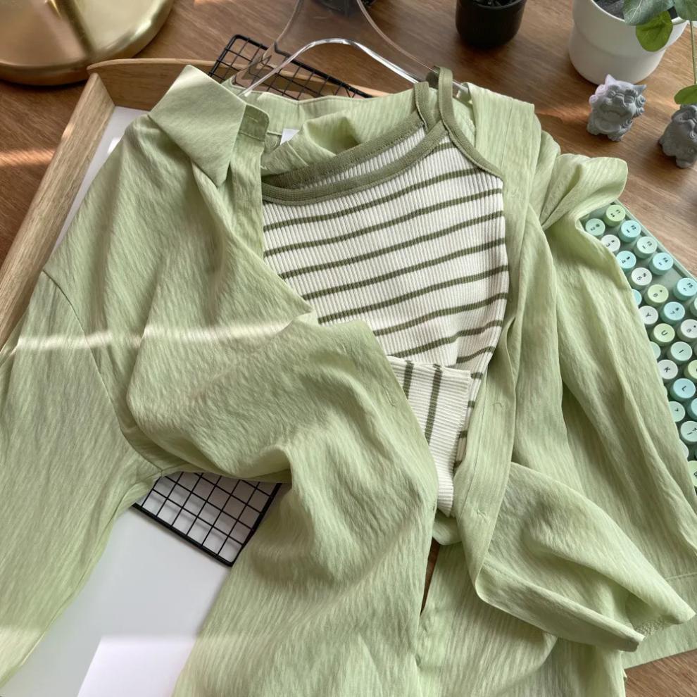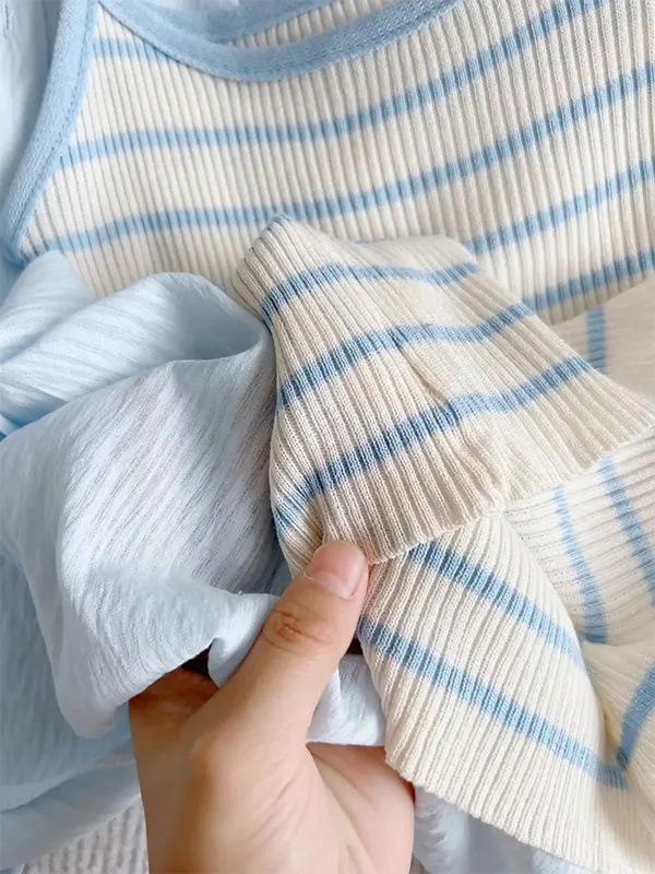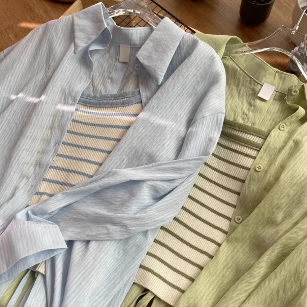 Sky blue strappy shirt + blue striped vest [suit], Sky pink strappy shirt + pink striped vest [suit], Green st...