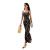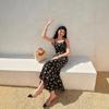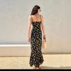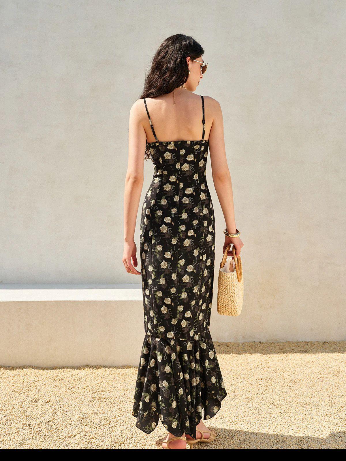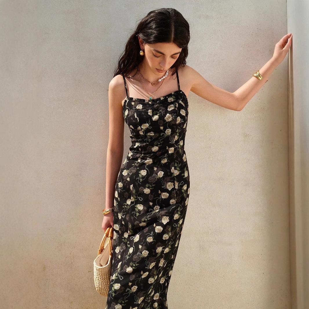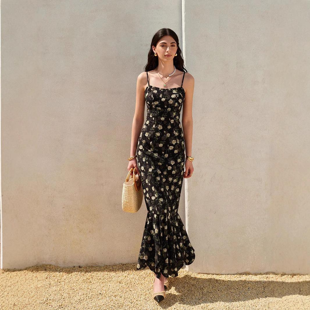 Vestido de Tirantes Floral Negro Nuevo para Vacaciones 2025 para Mujer Transfronterizo Europeo y Americano Vestido Francés Retro de Corte Ajustado