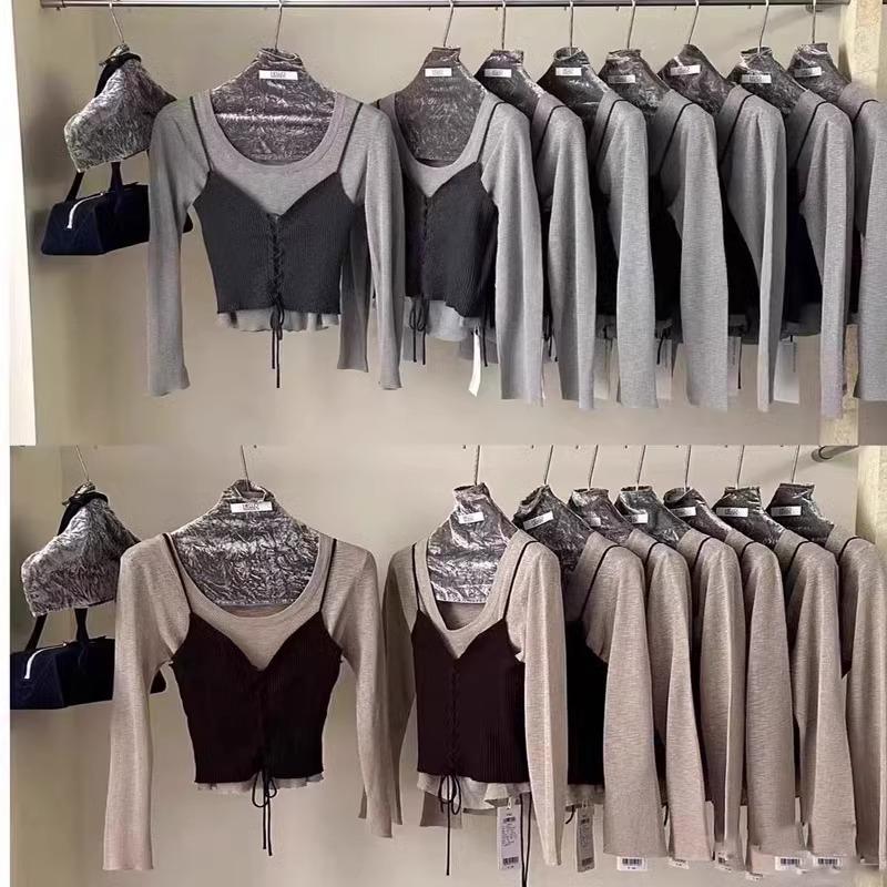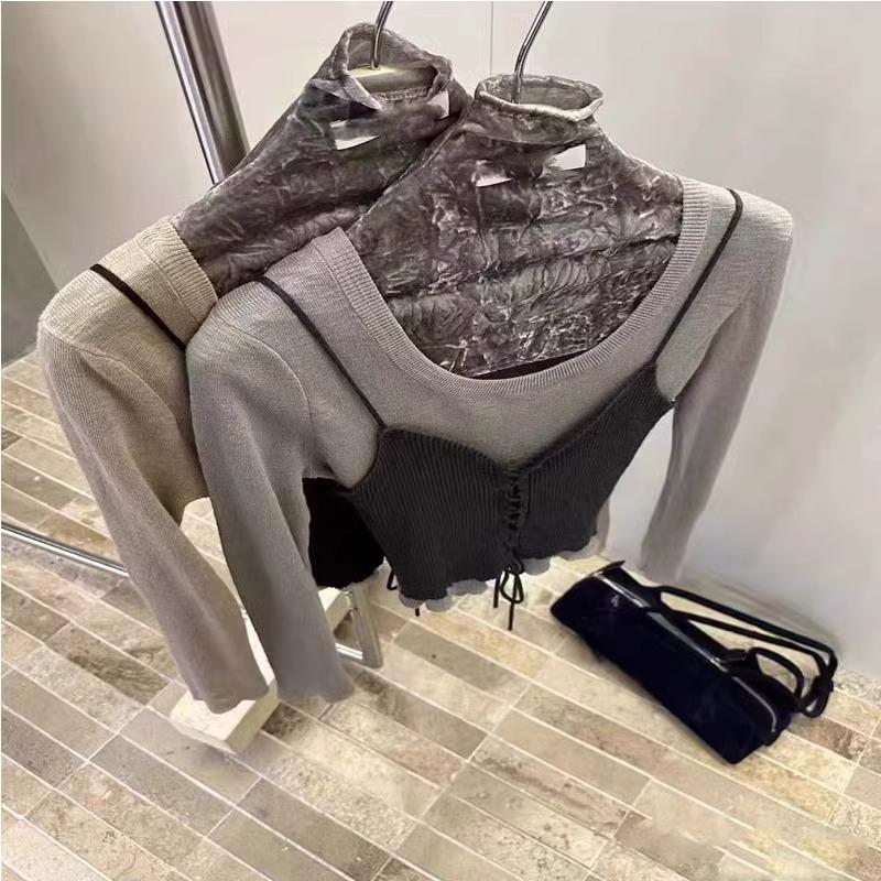 Otoño 2024 Nuevo Estilo Coreano Ajustado Moda Sling Color Sólido Suéter de Manga Larga Jersey Top de Dos Piezas Trendy