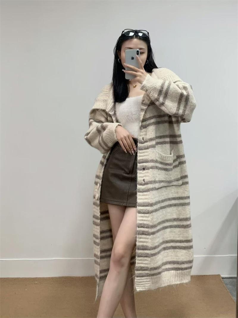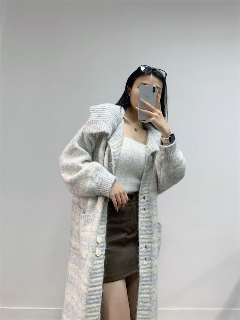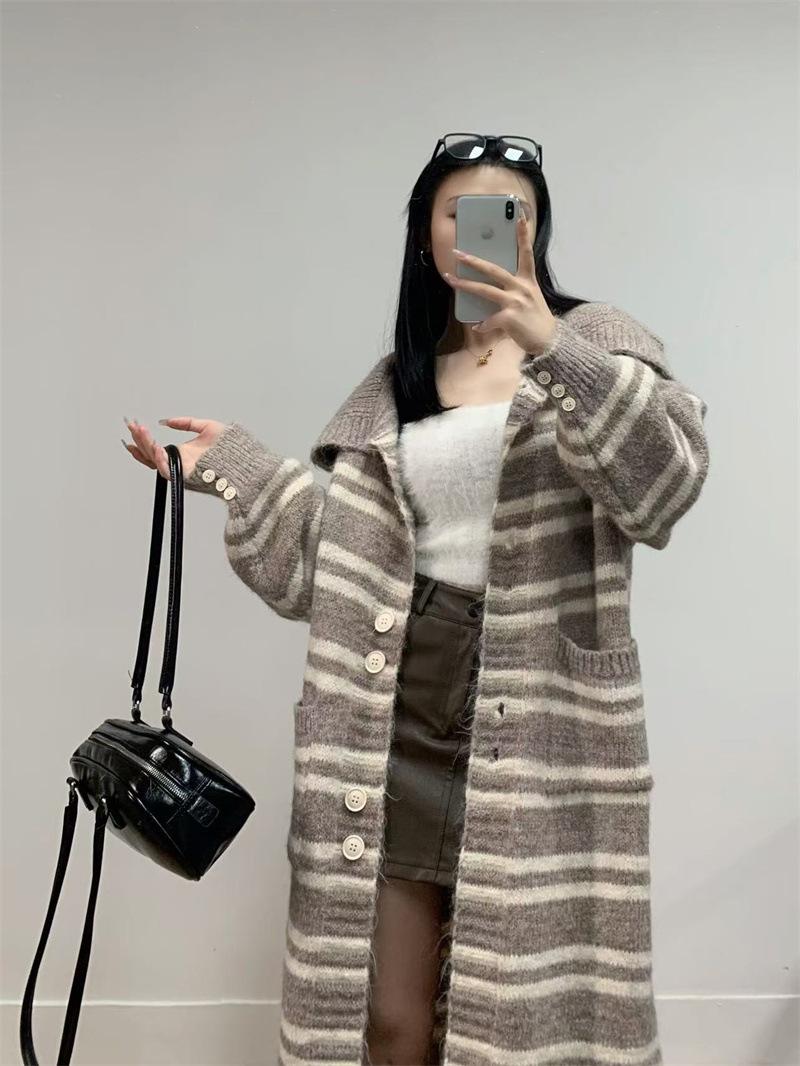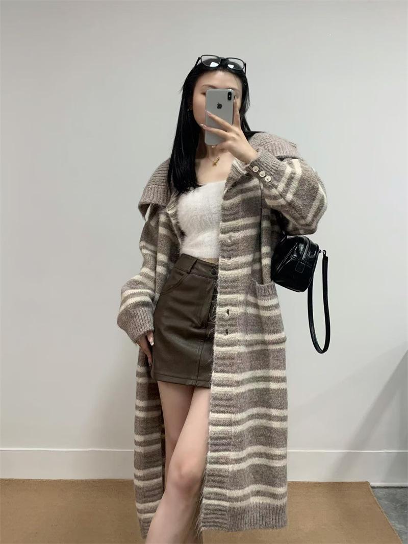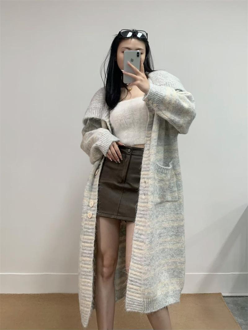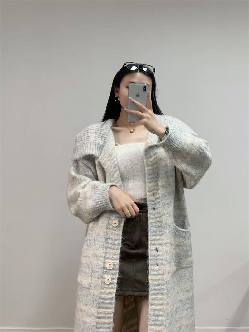 Estilo Coreano Otoño e Invierno Nuevo Cárdigan de Suéter Tejido Holgado para Mujer Estilo Lazy Solapa Grande Casual Color de Contraste Abrigo Largo de Suéter