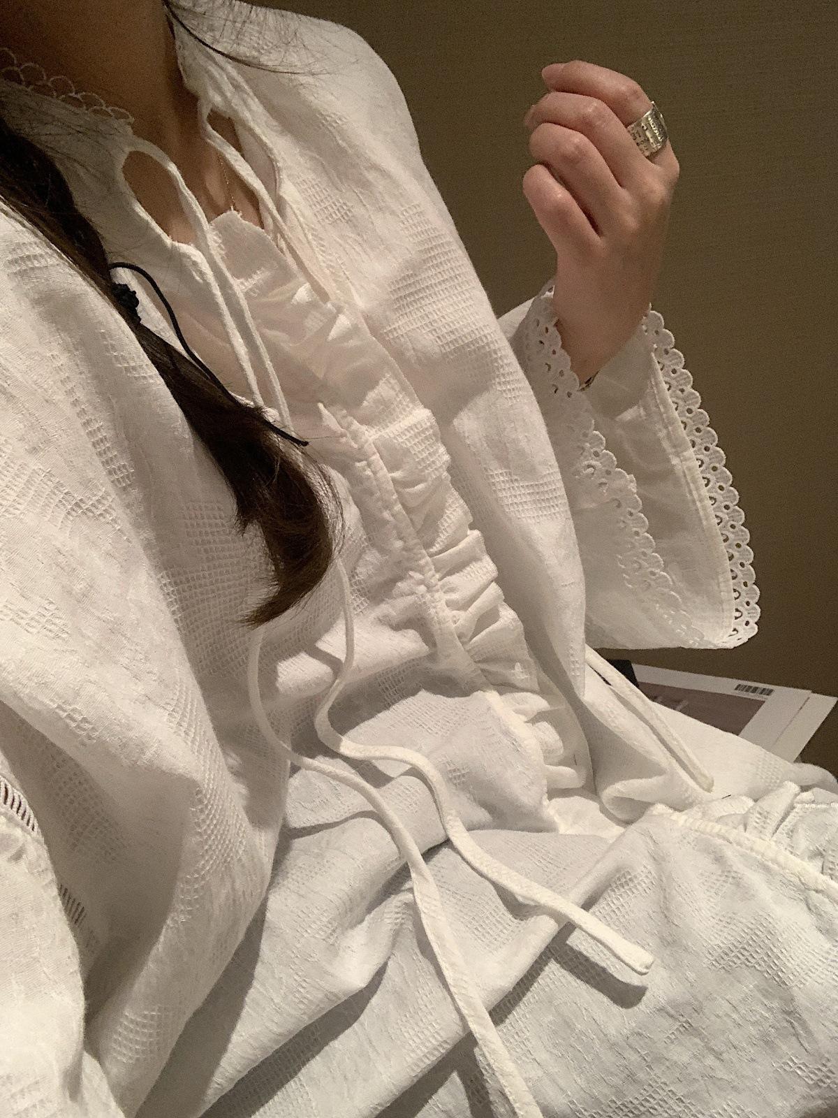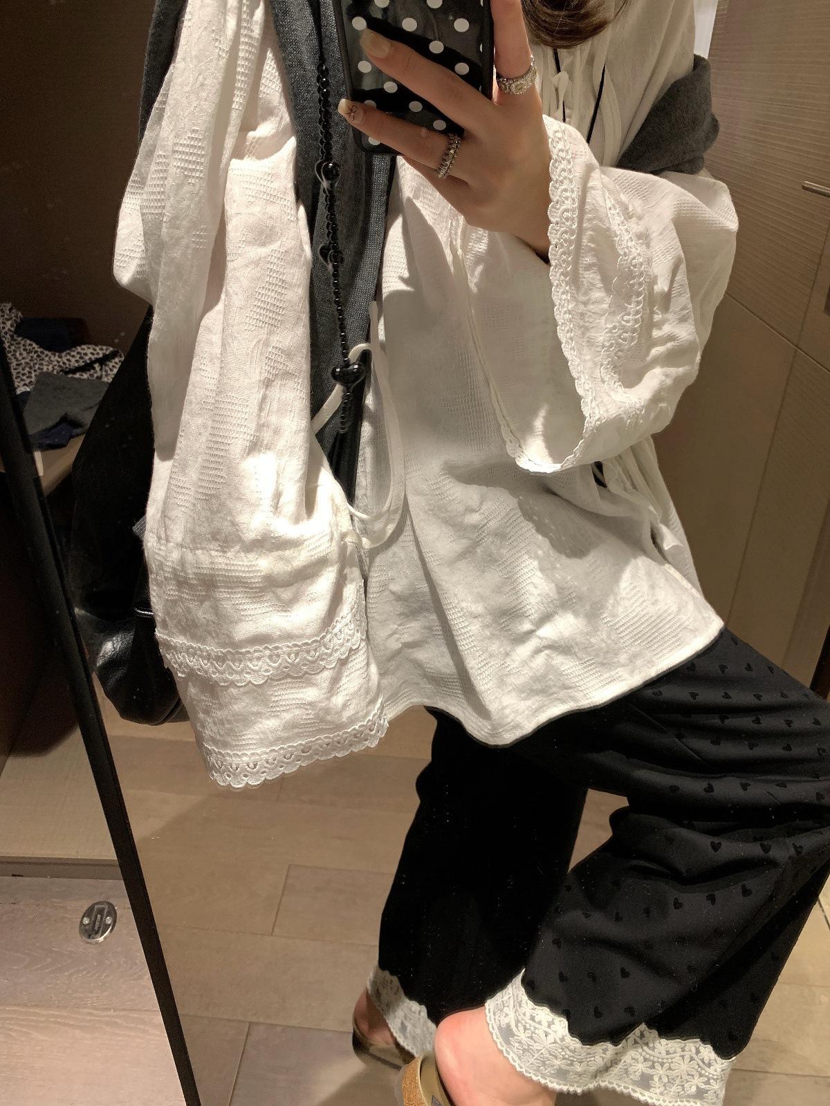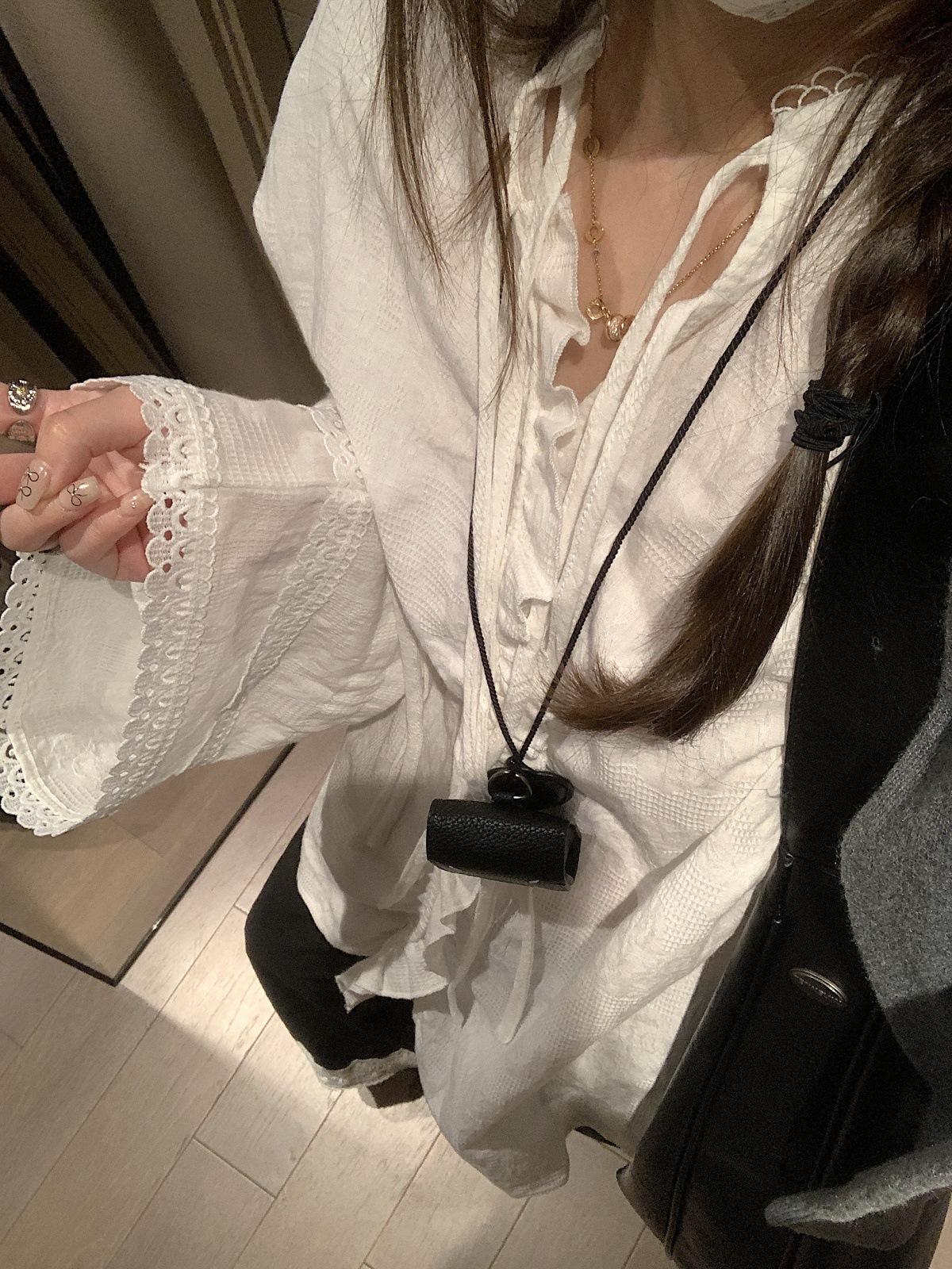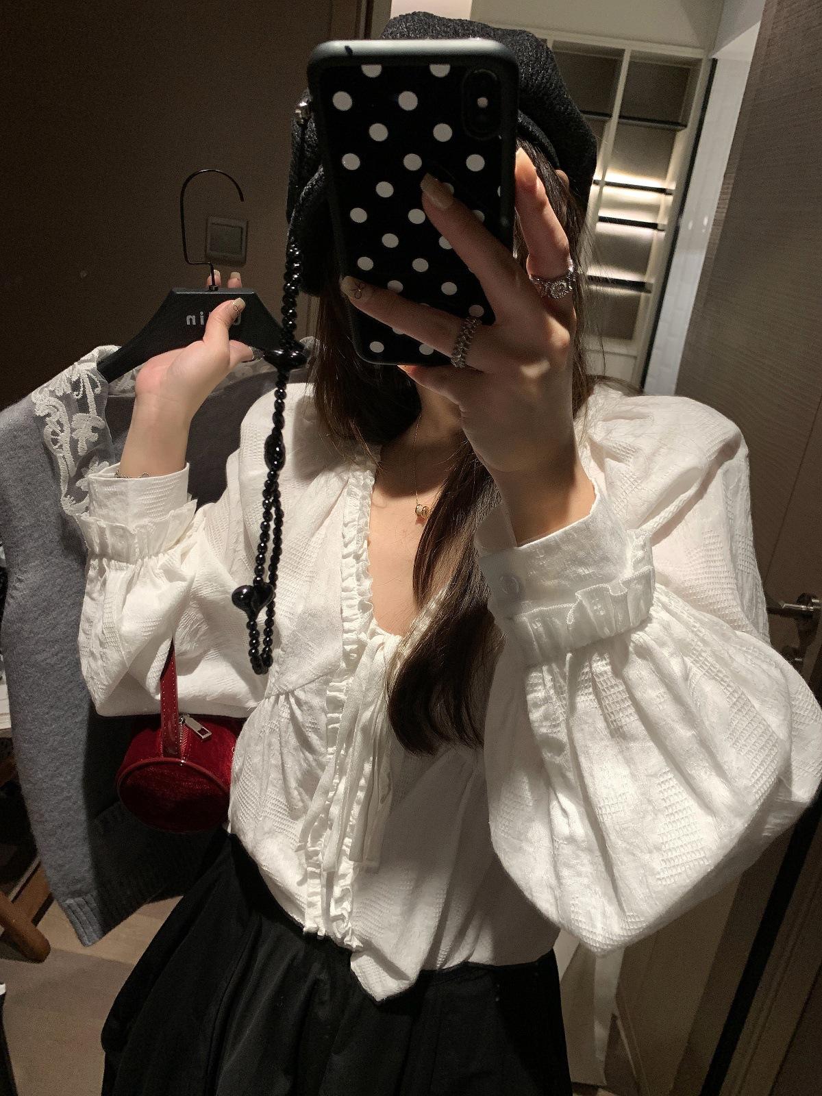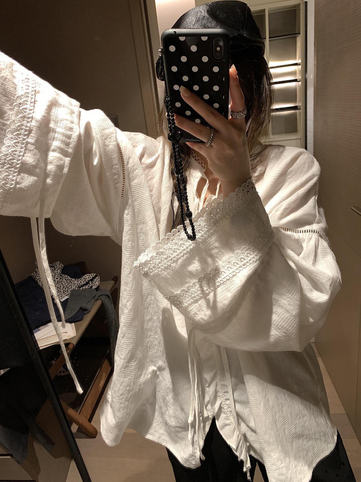 OHLABABY Camisa Elegante de Encaje de Manga Larga con Cuello en V Estilo Francés para Mujer Primavera Suelta Midi de Alta Calidad Top Blanco