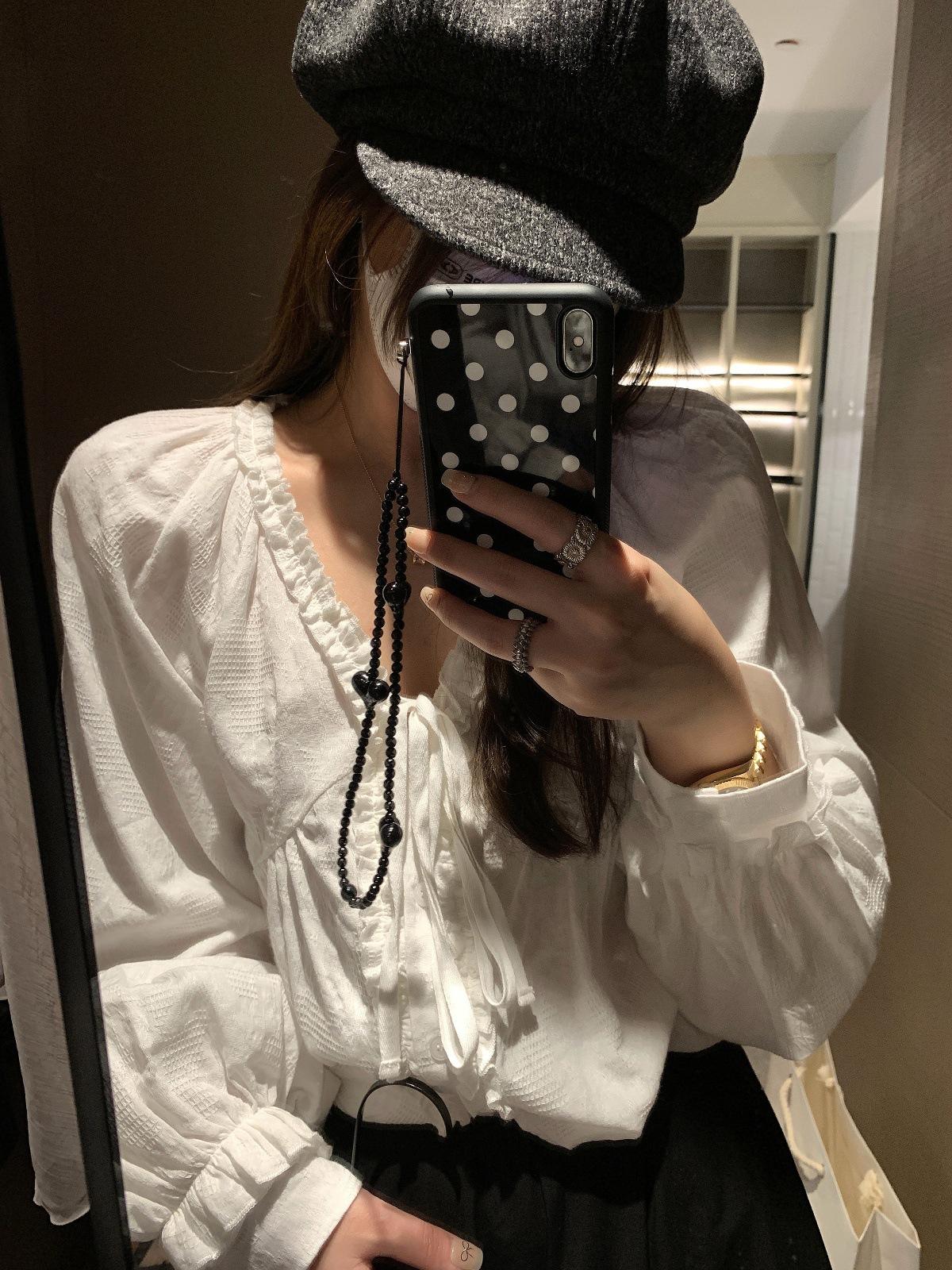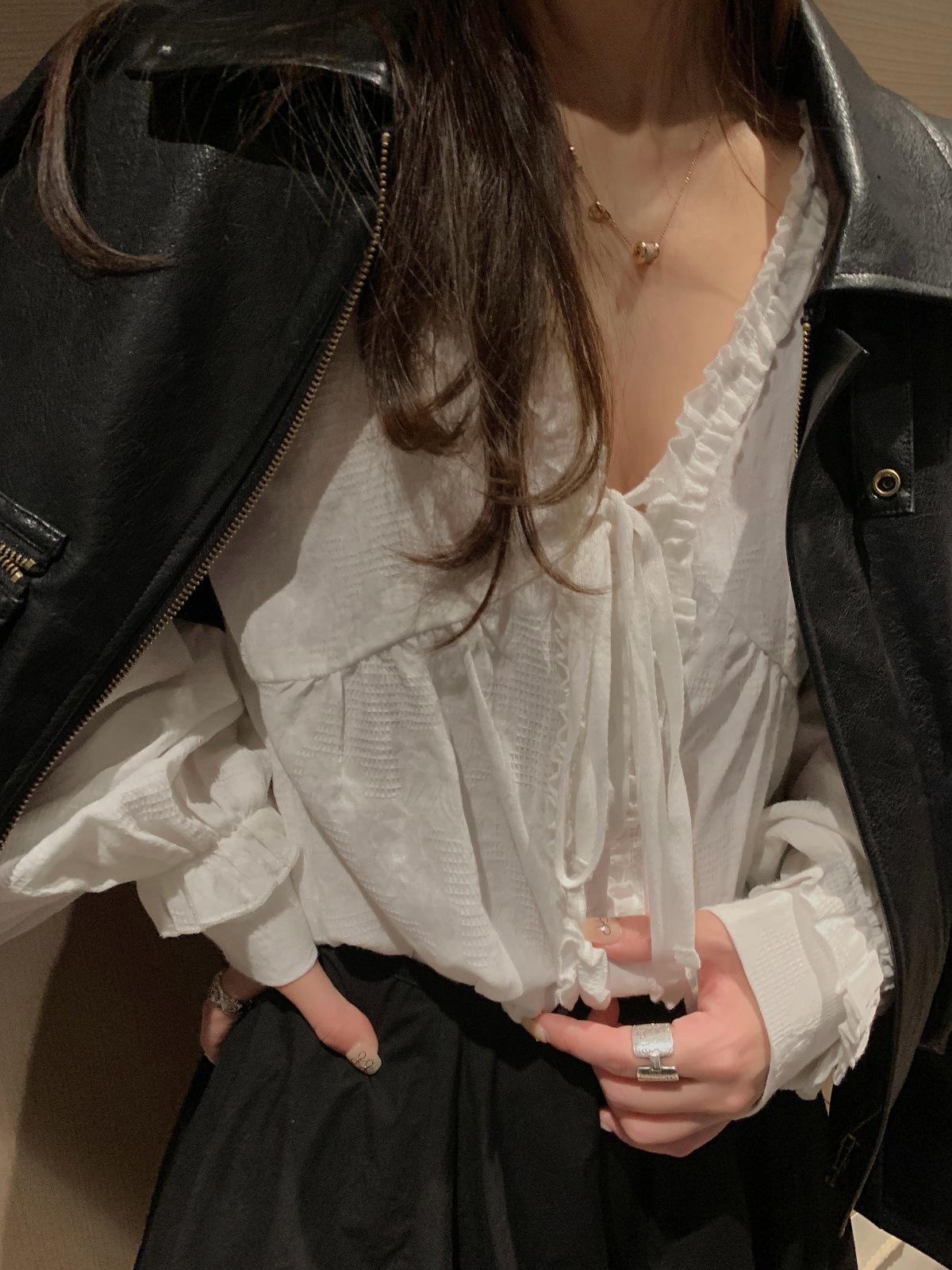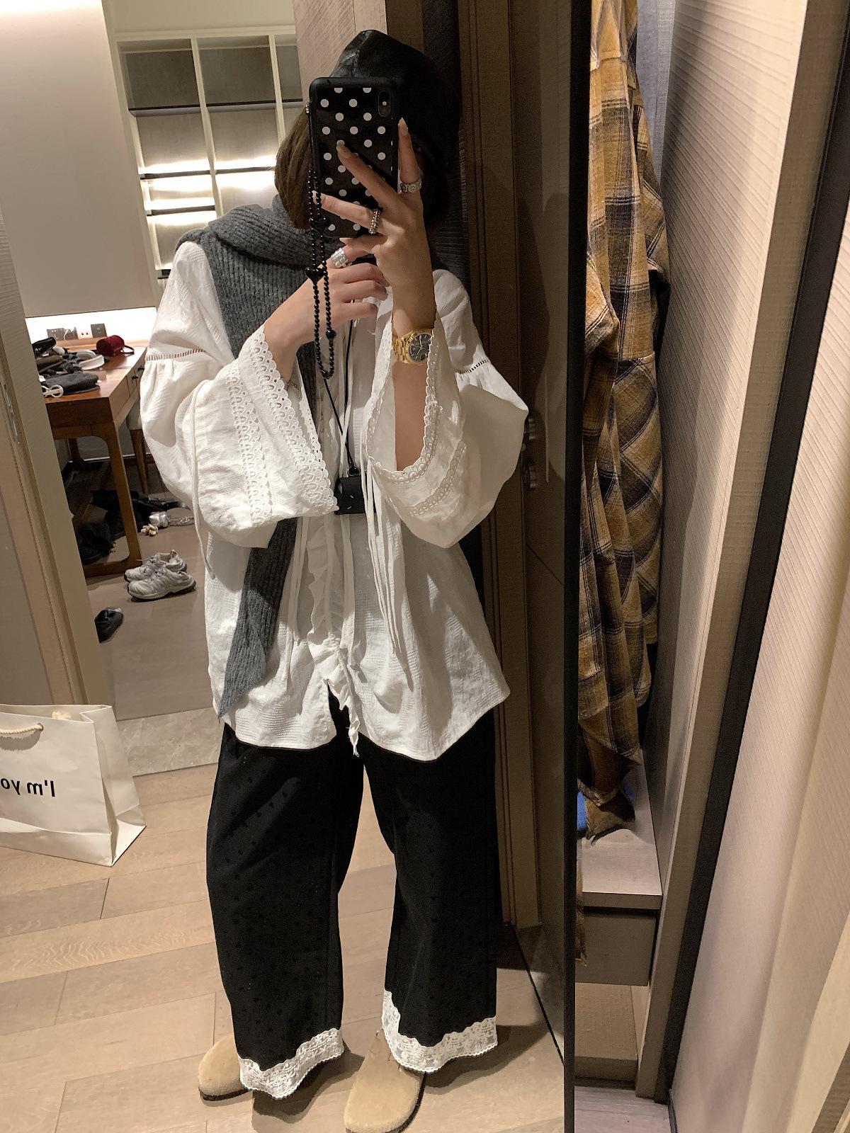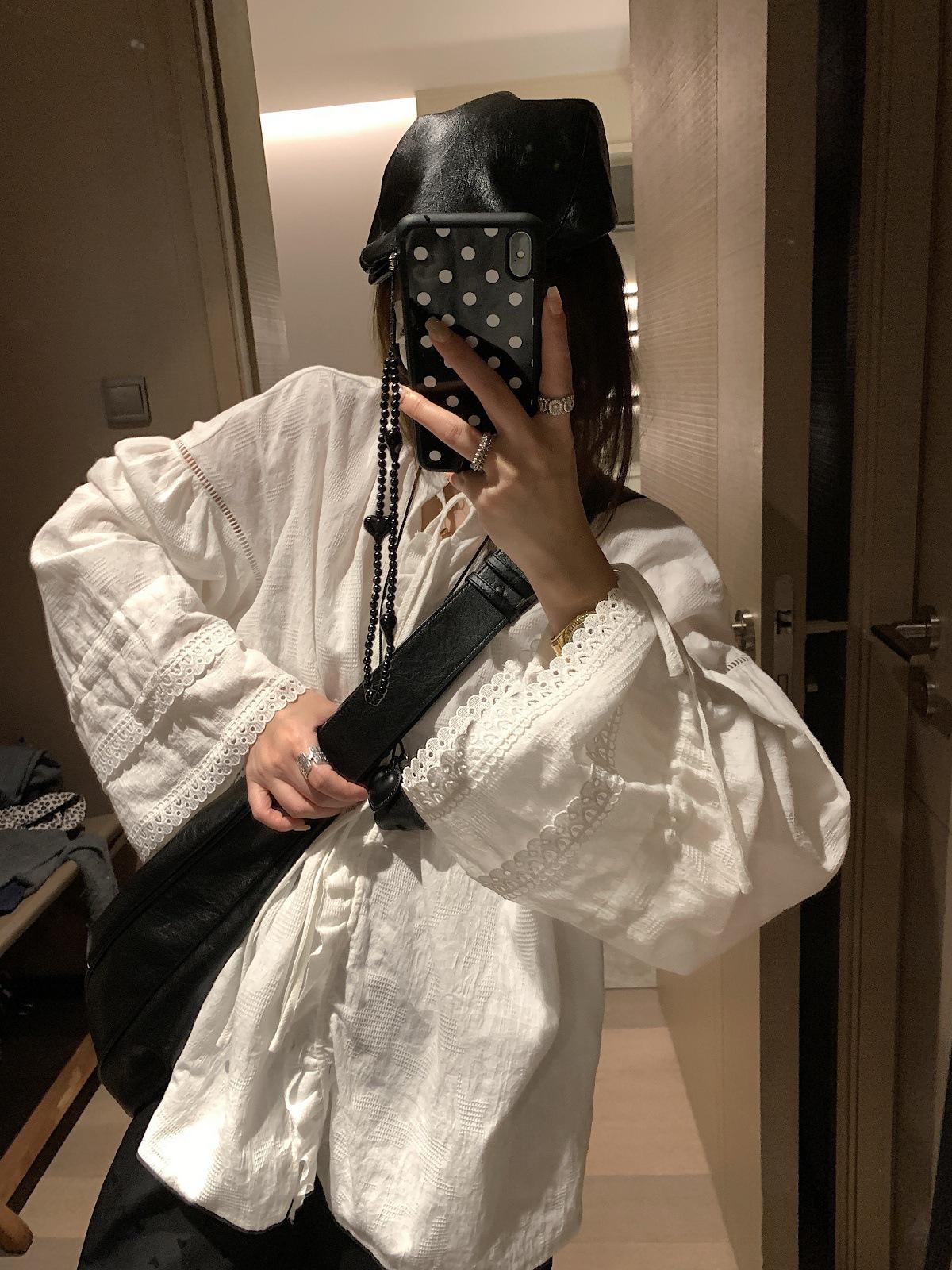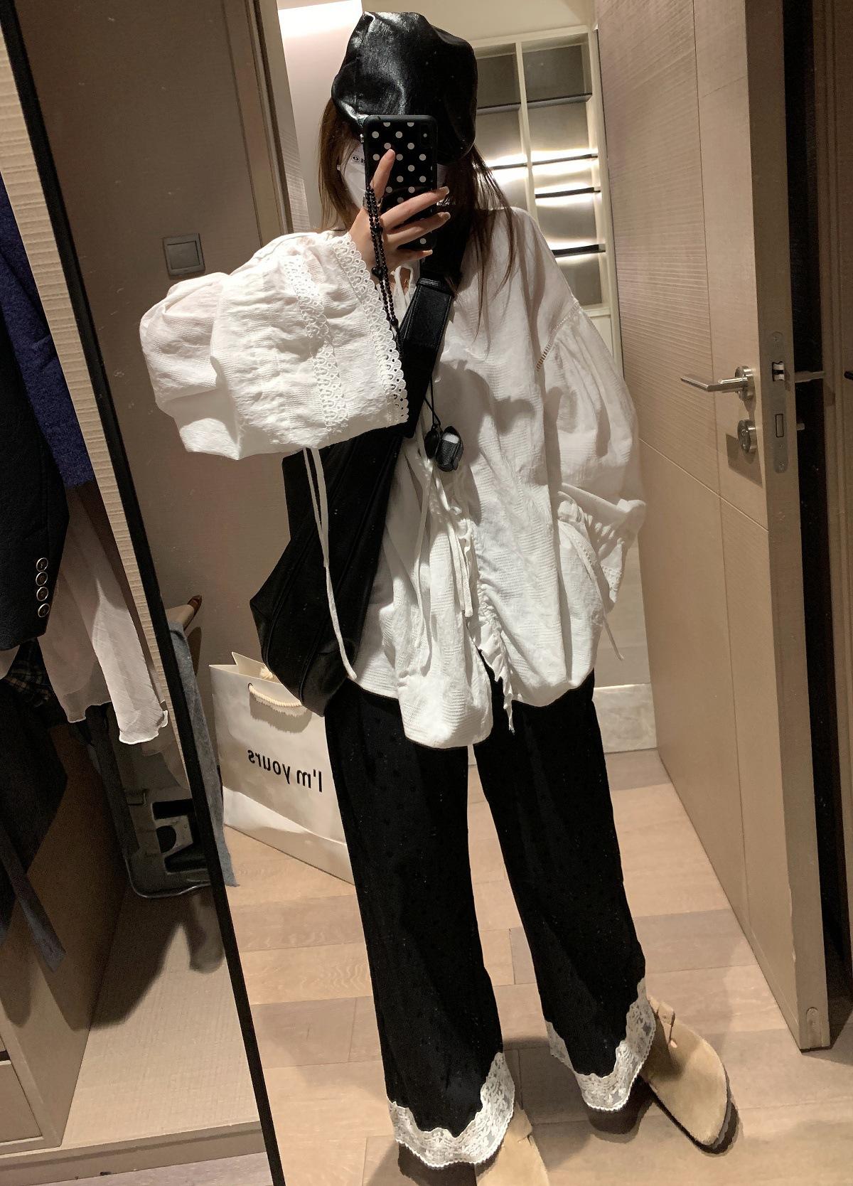 OHLABABY Camisa Elegante de Encaje de Manga Larga con Cuello en V Estilo Francés para Mujer Primavera Suelta Midi de Alta Calidad Top Blanco
