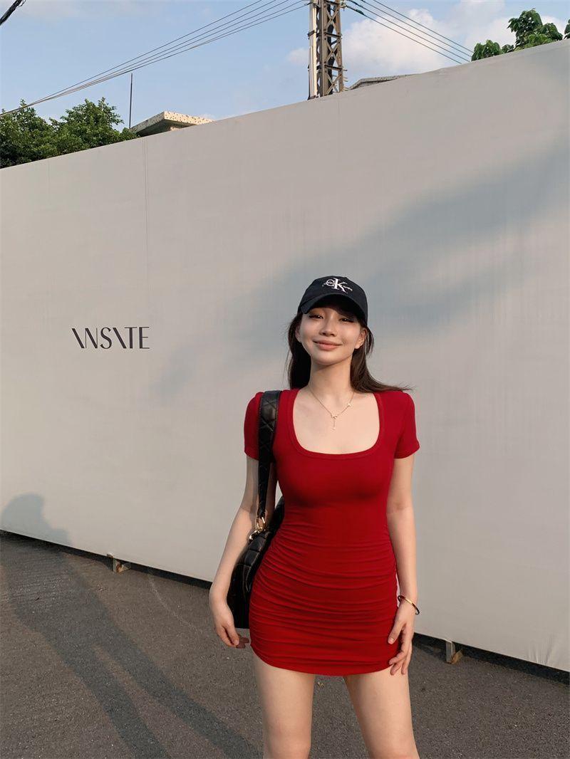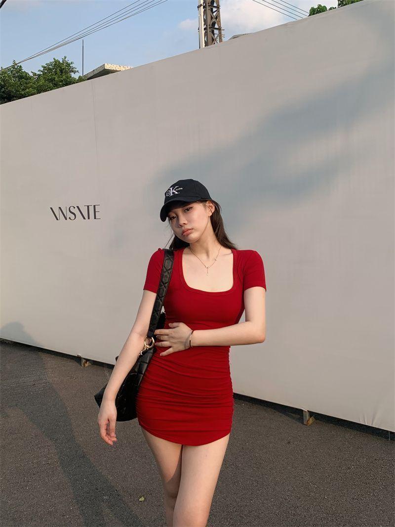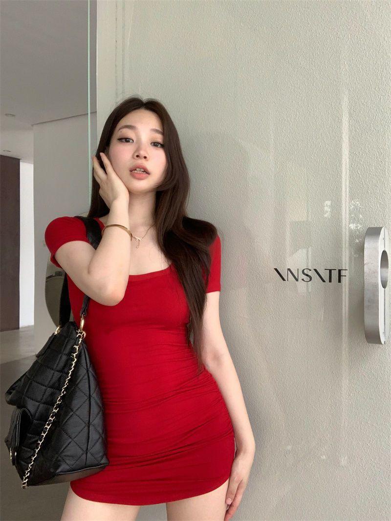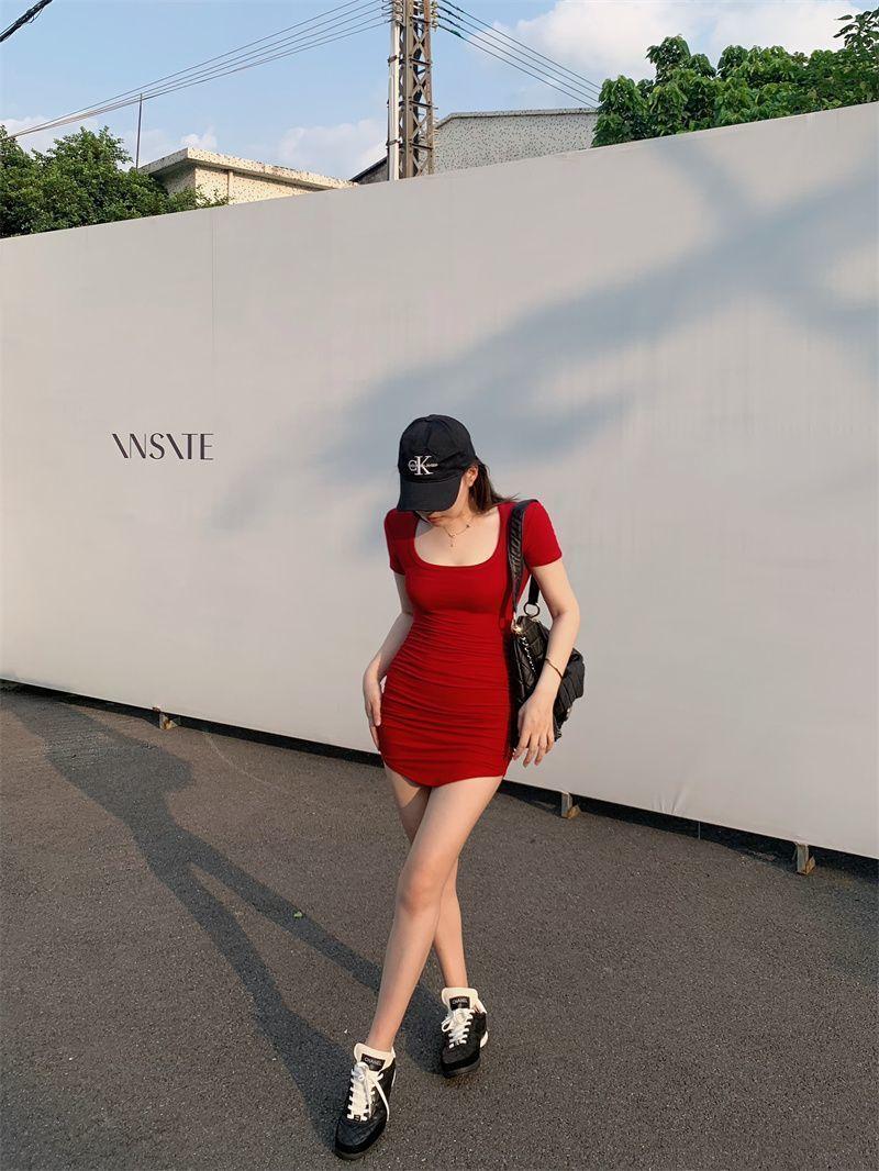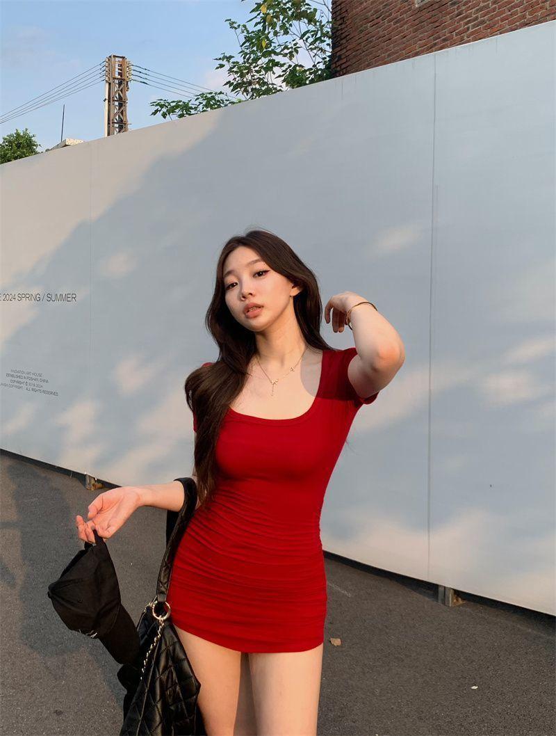 [20 Piezas Envío Gratis] Vestido Camiseta de Manga Corta para Mujer, Falda Corta Verano Pura Lujuria, Falda que Resalta la Figura, Falda Ajustada que Abraza las Caderas