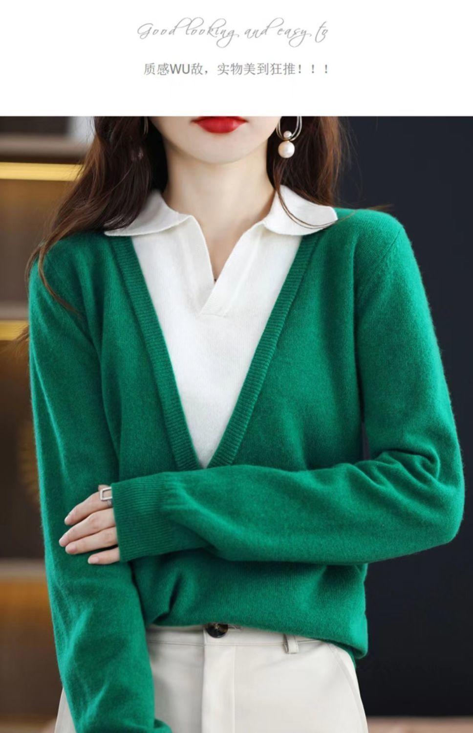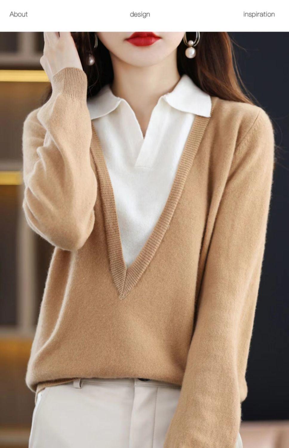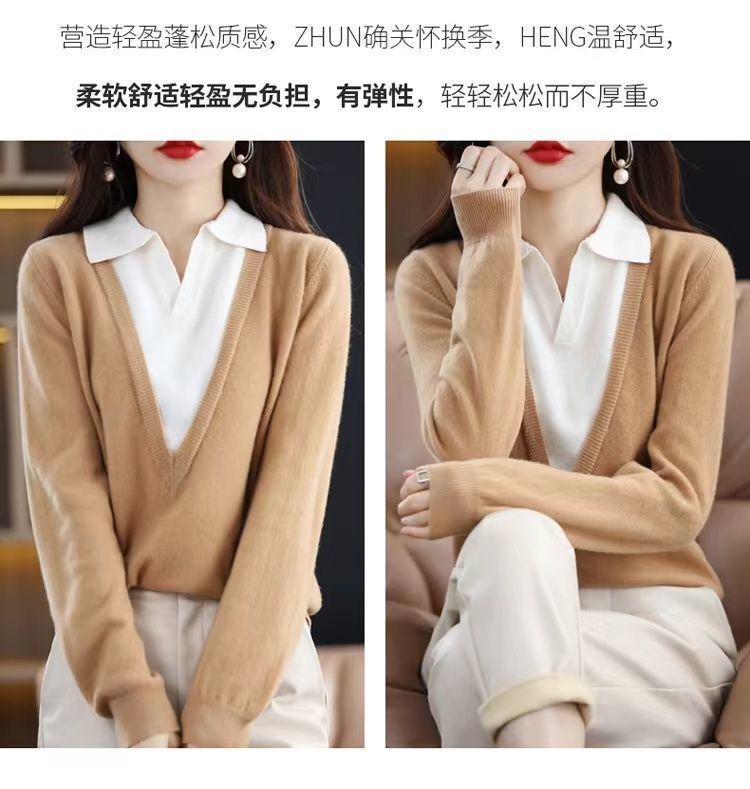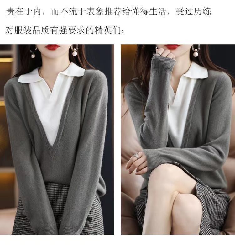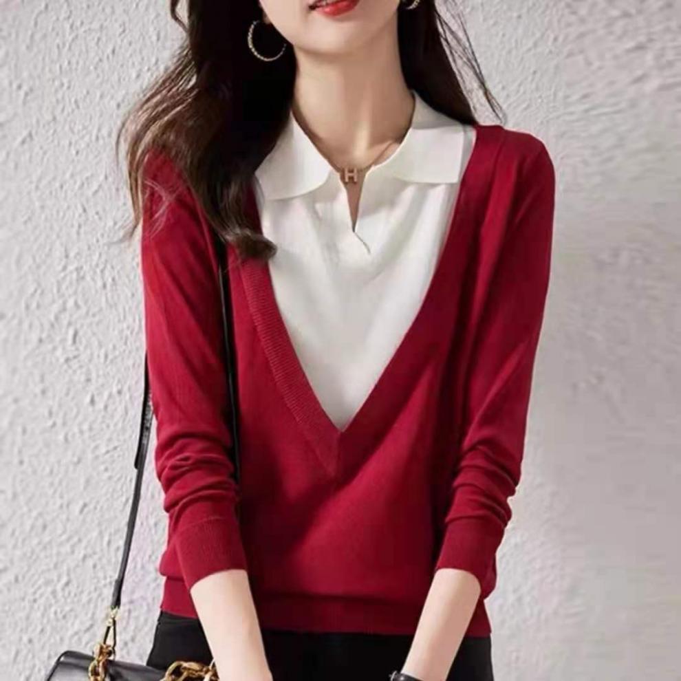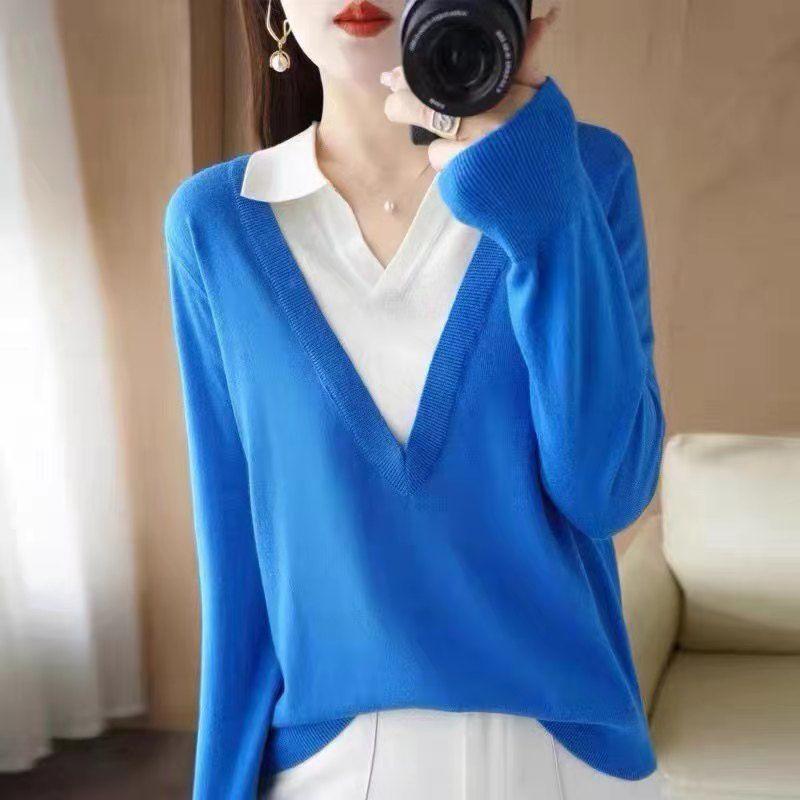 Otoño e Invierno Nuevo Tejido de Punto Falso de Dos Piezas Elegante Top con Cuello Polo Tejido de Punto de Moda para Mujer Mangas Largas Sueltas Versátiles para Mujer