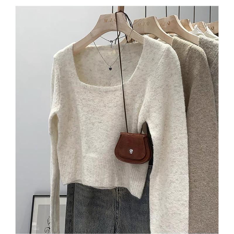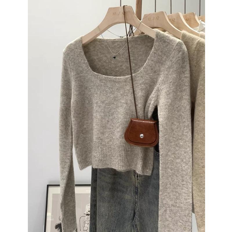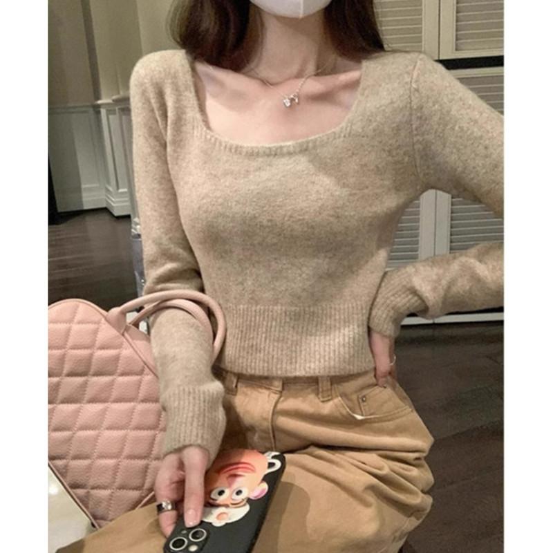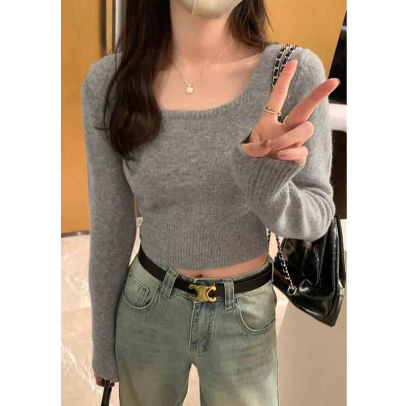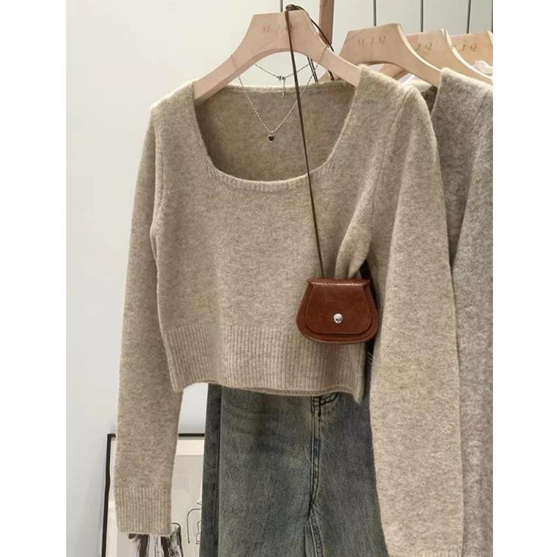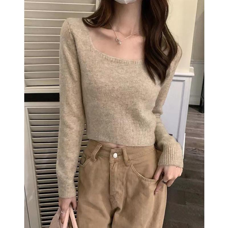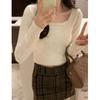 Jersey corto de punto suave y encerado con cuello cuadrado para mujer, otoño 2023, nuevo jersey de manga larga, camiseta básica que combina con todo.