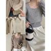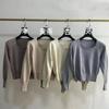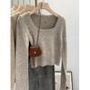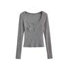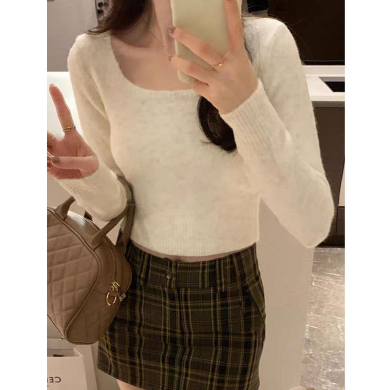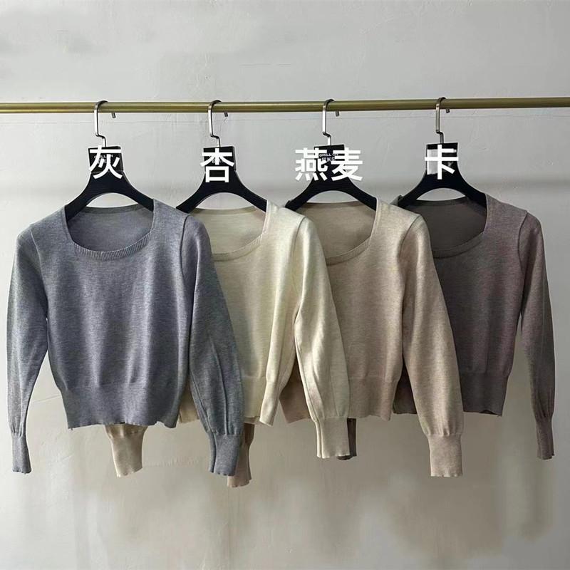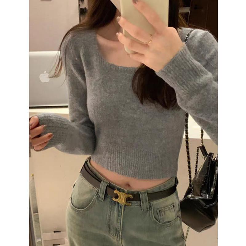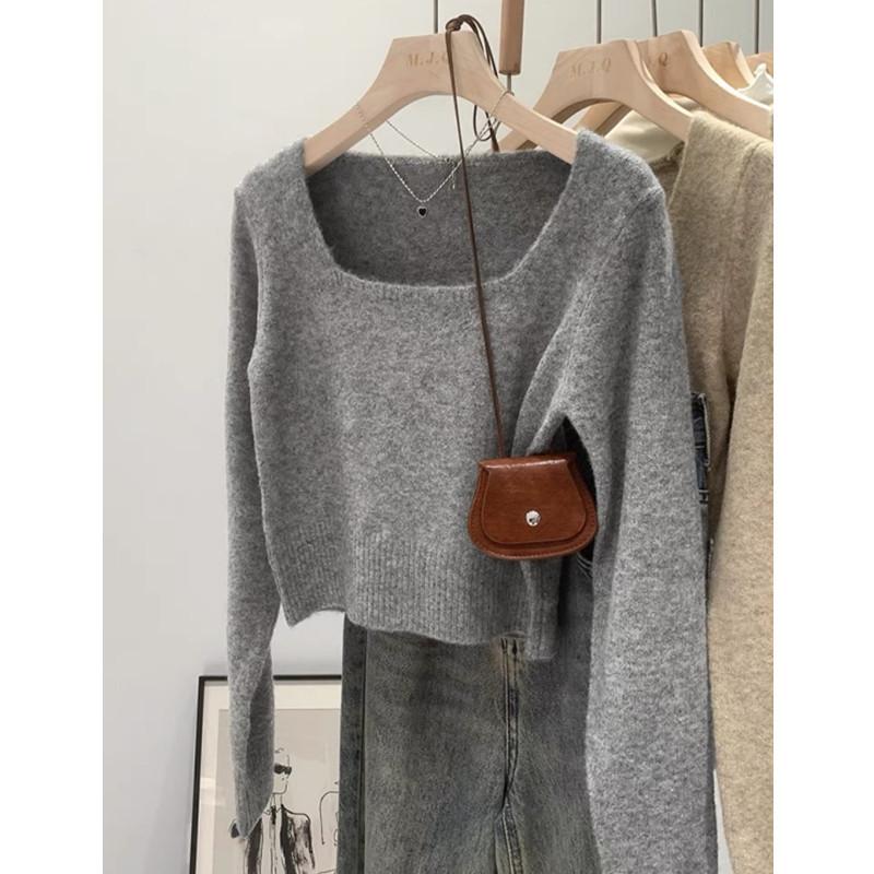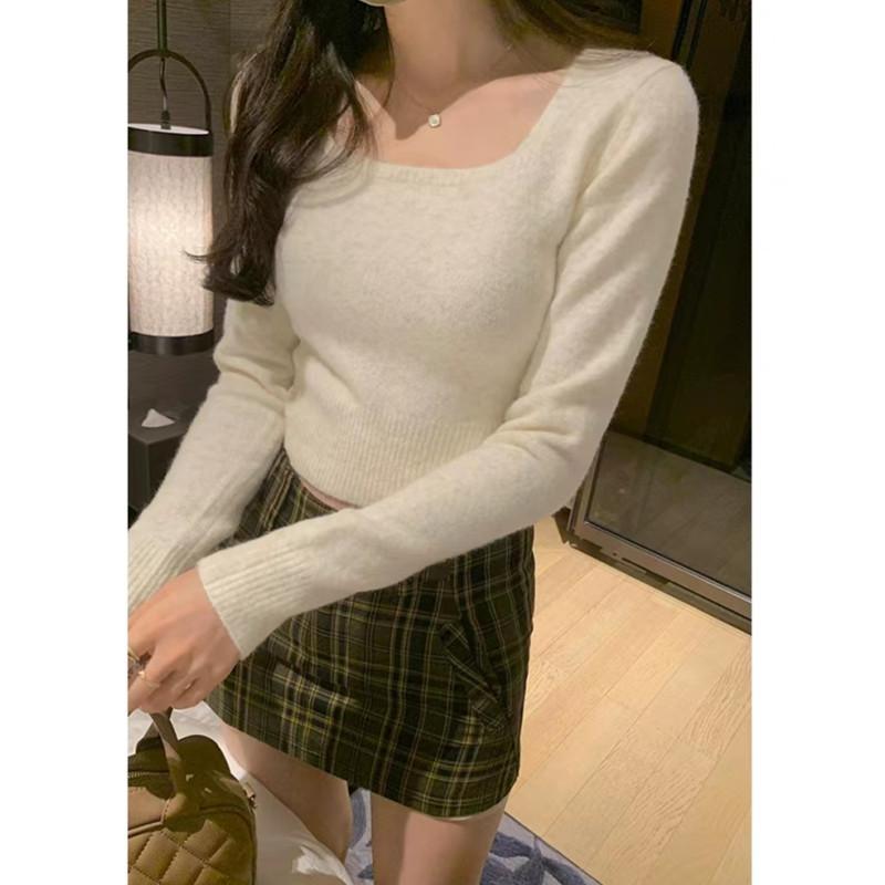 Jersey corto de punto suave y encerado con cuello cuadrado para mujer, otoño 2023, nuevo jersey de manga larga, camiseta básica que combina con todo.