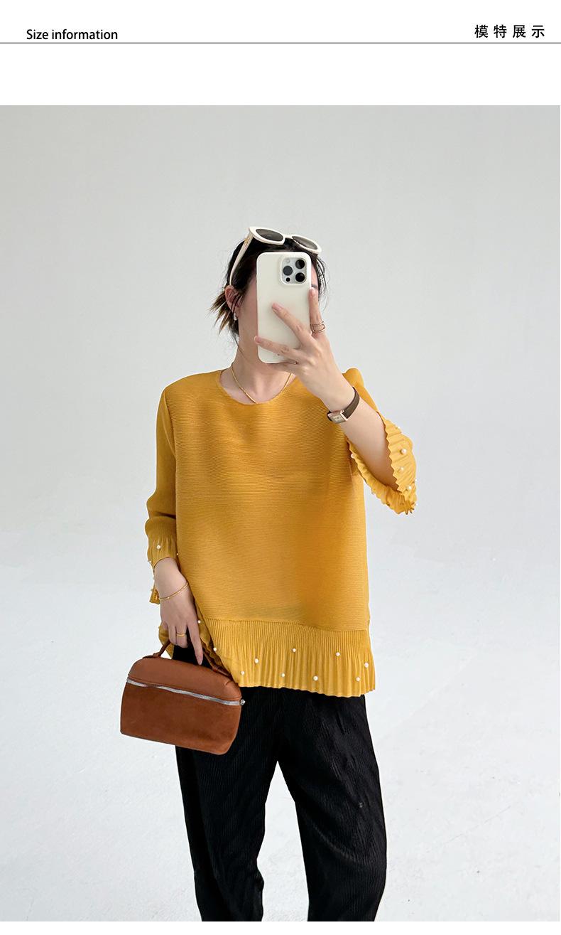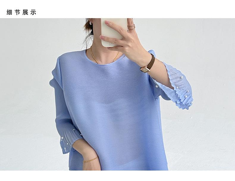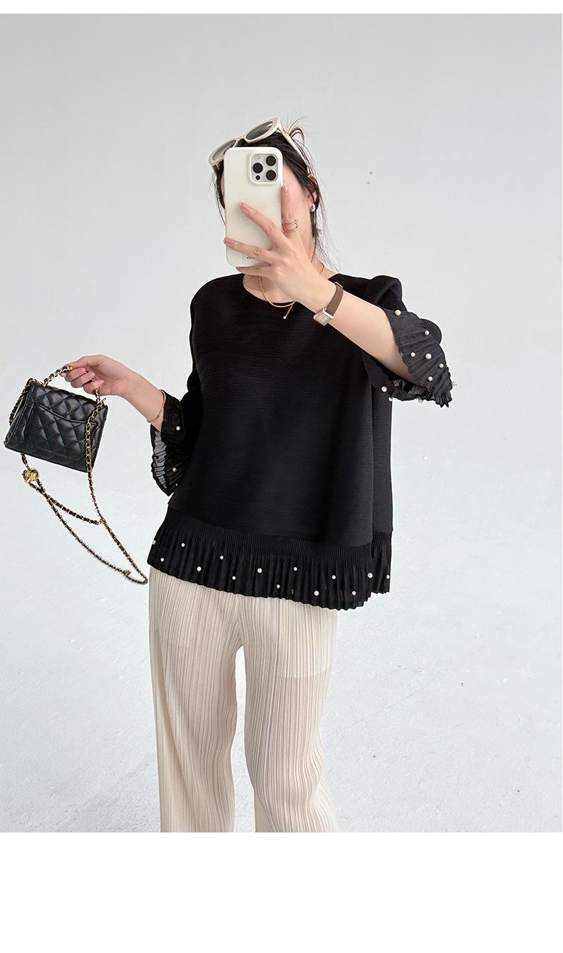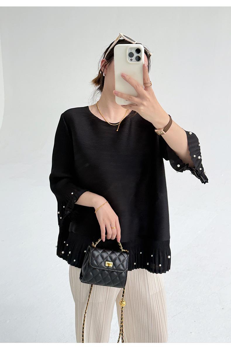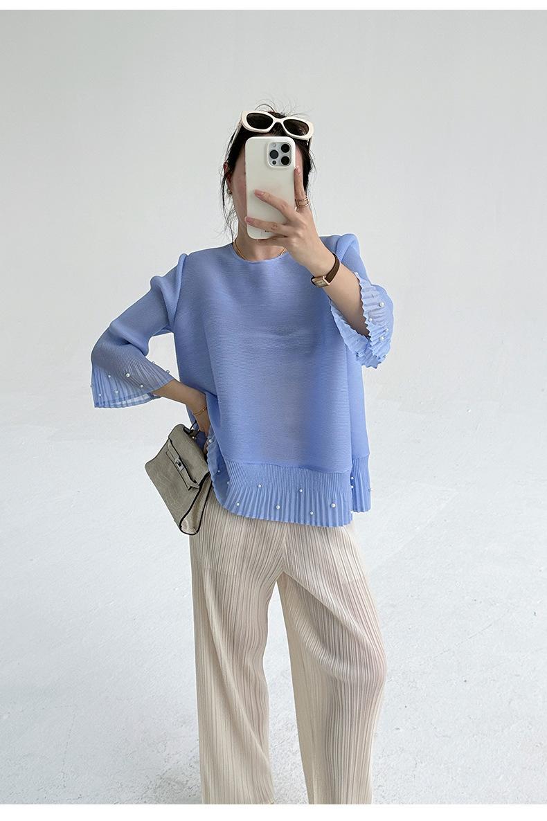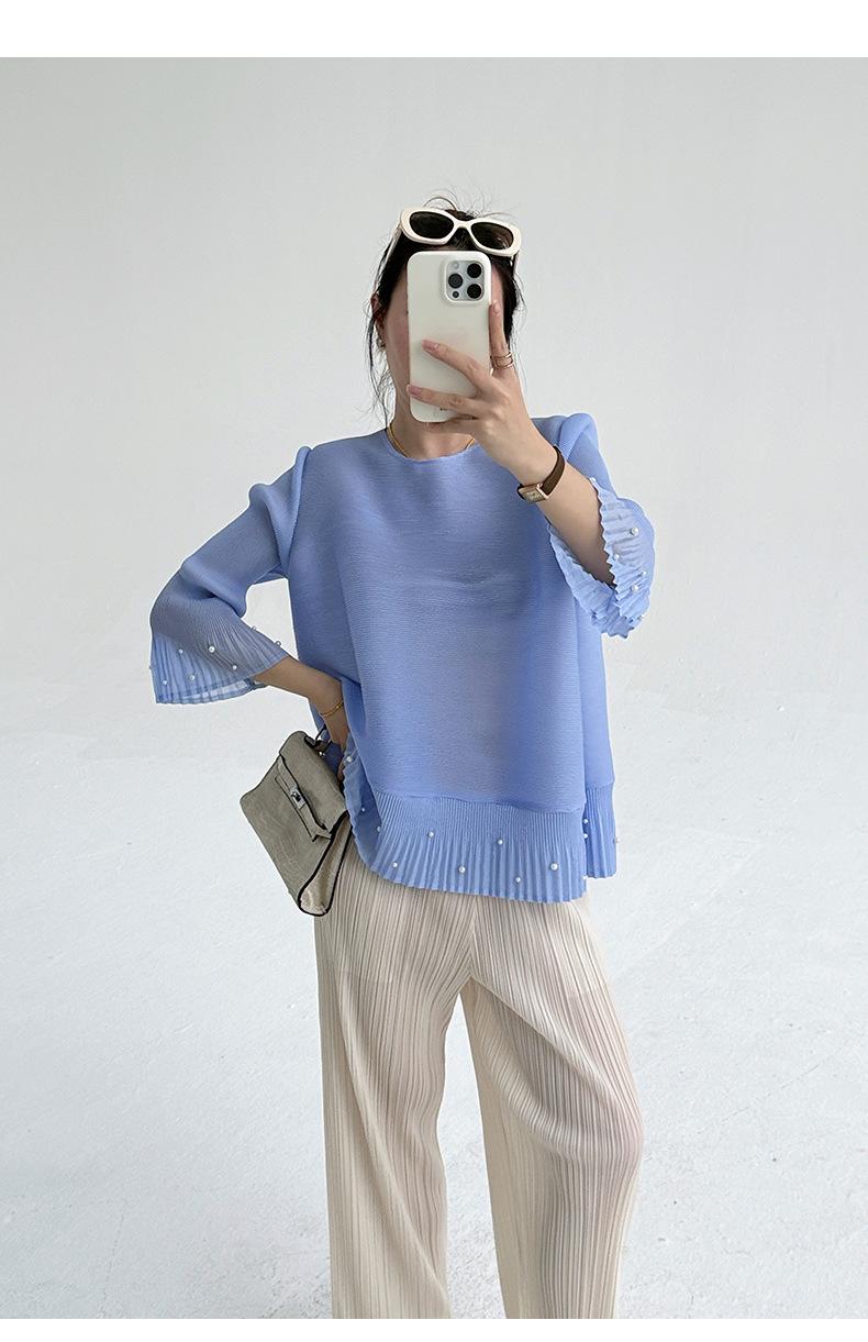 2025 Principios de Otoño Nueva Blusa Delgada Plisada de Cuello Redondo y Manga Acampanada con Cuentas Elegante Combinable Camiseta de Manga Siete Cuartos para Mujer