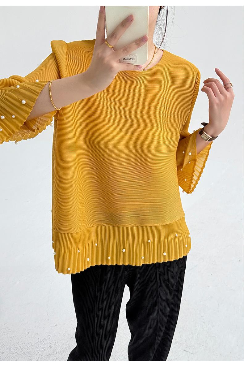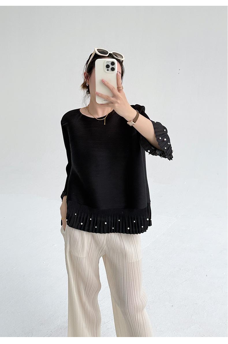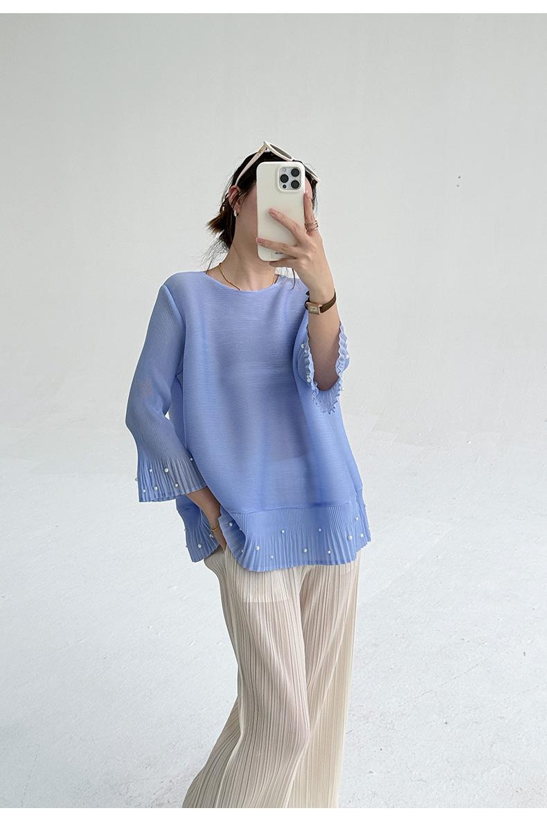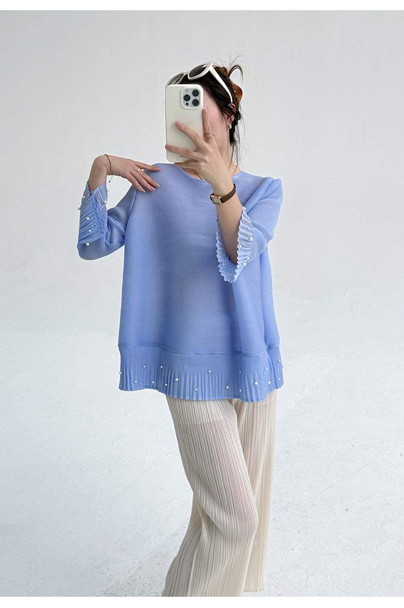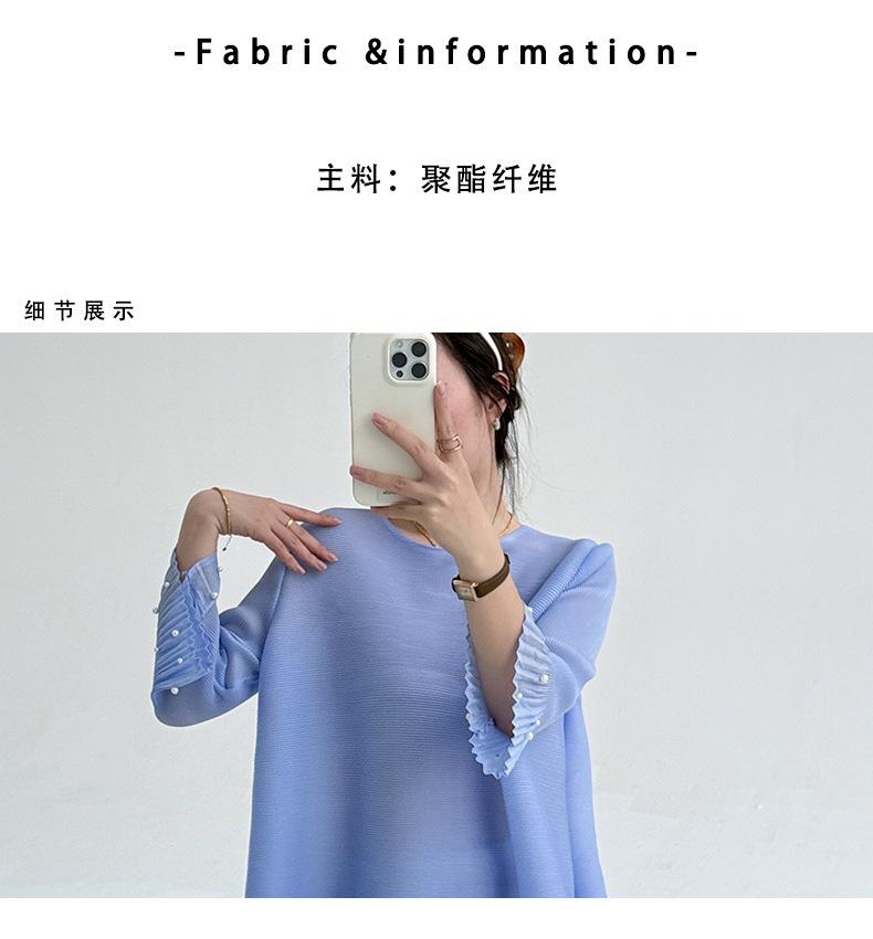2025 Principios de Otoño Nueva Blusa Delgada Plisada de Cuello Redondo y Manga Acampanada con Cuentas Elegante Combinable Camiseta de Manga Siete Cuartos para Mujer