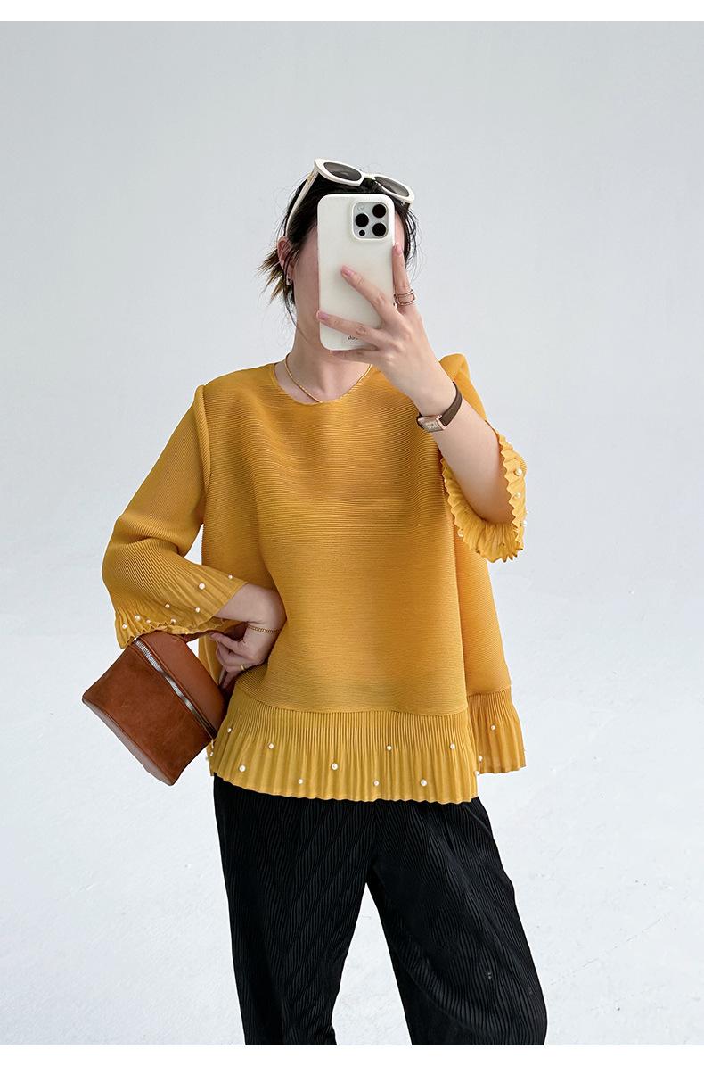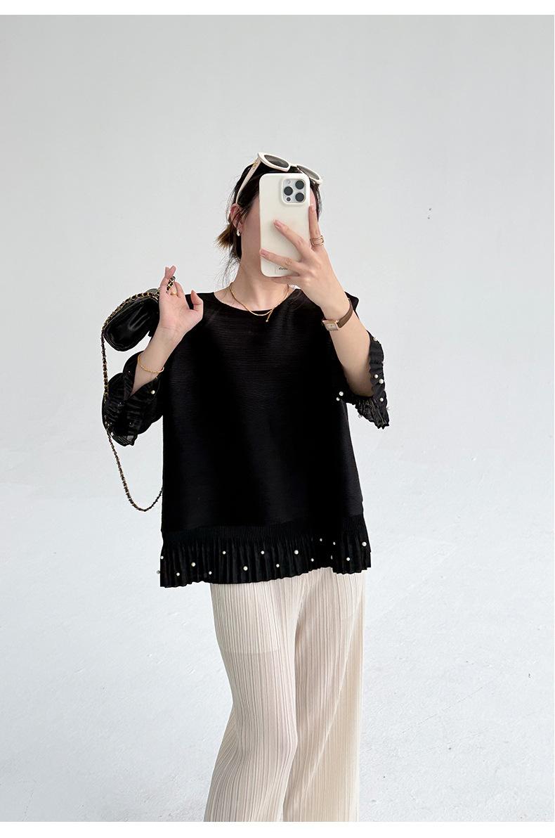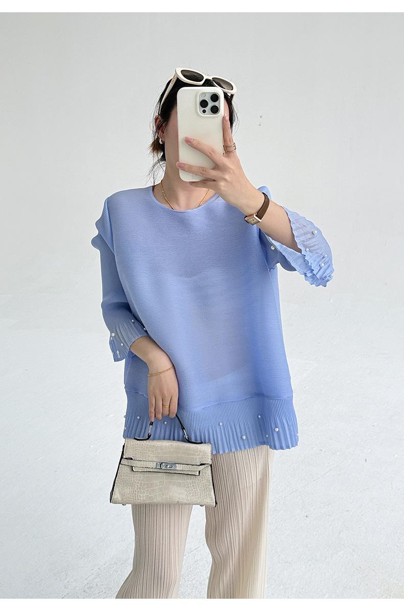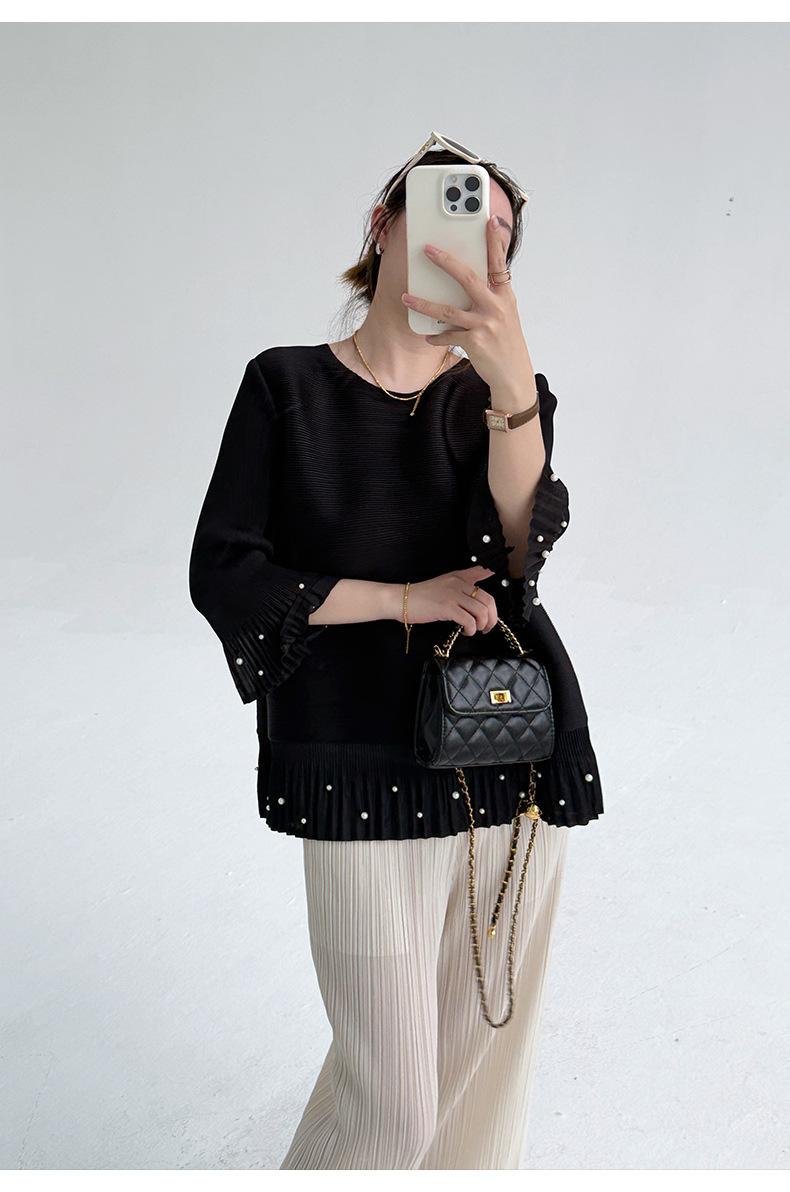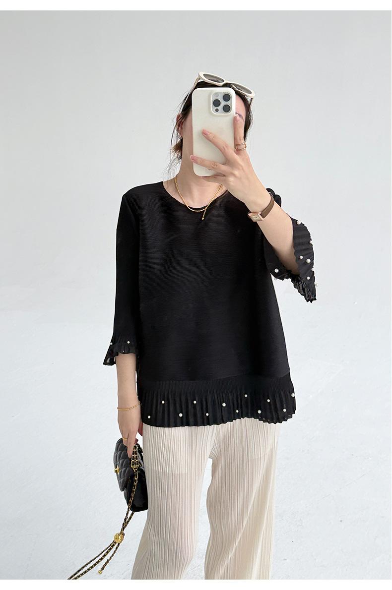 2025 Principios de Otoño Nueva Blusa Delgada Plisada de Cuello Redondo y Manga Acampanada con Cuentas Elegante Combinable Camiseta de Manga Siete Cuartos para Mujer