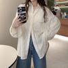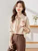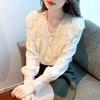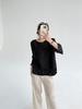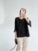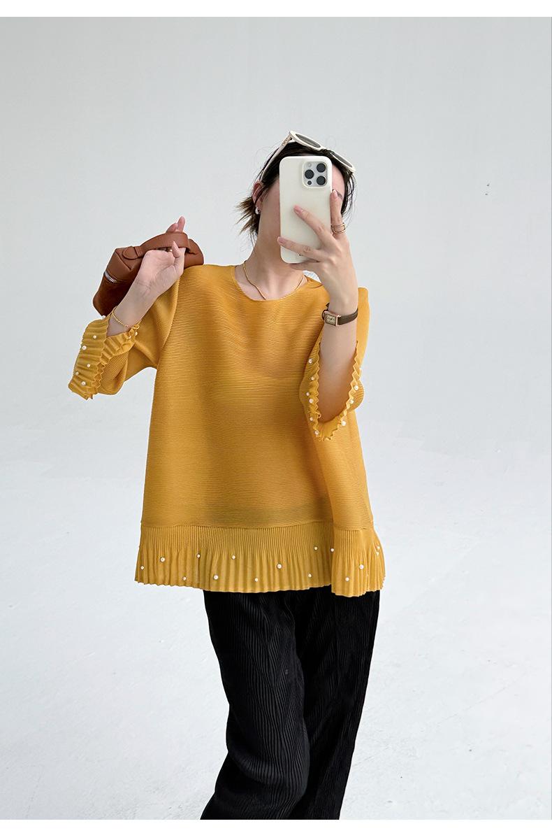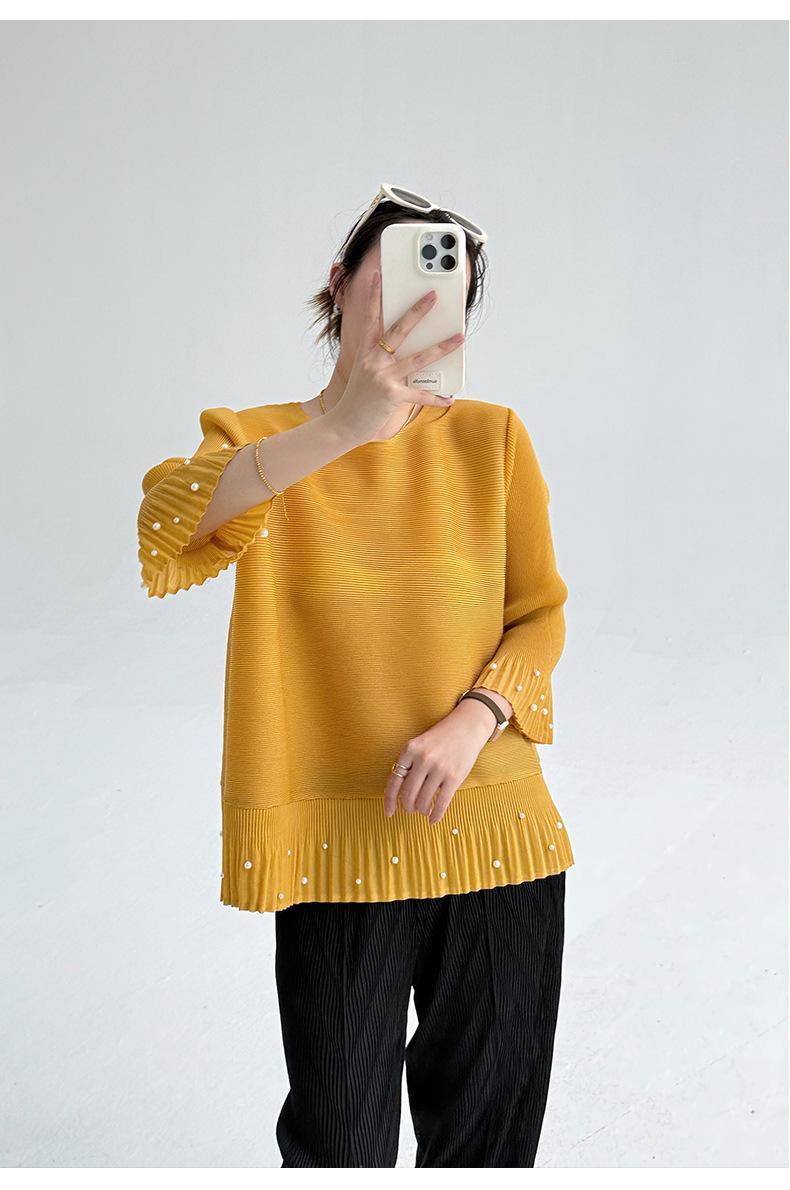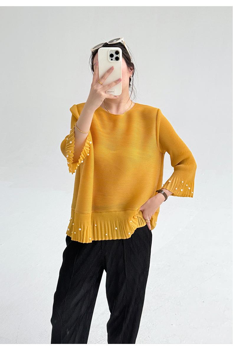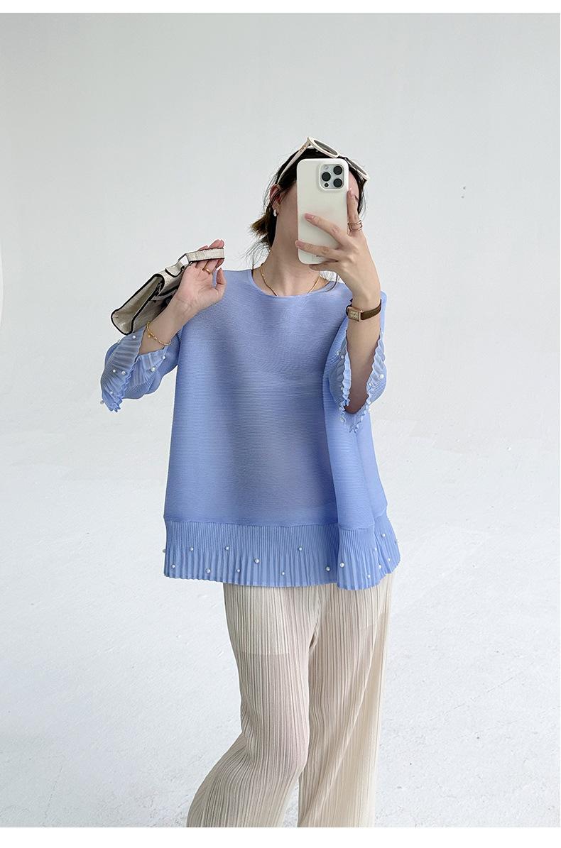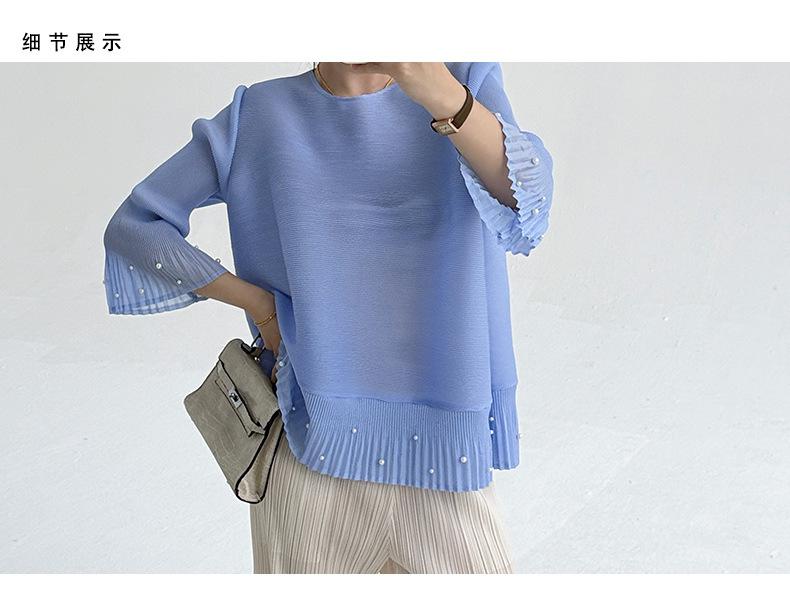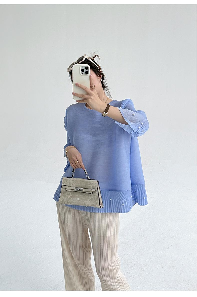 2025 Principios de Otoño Nueva Blusa Delgada Plisada de Cuello Redondo y Manga Acampanada con Cuentas Elegante Combinable Camiseta de Manga Siete Cuartos para Mujer