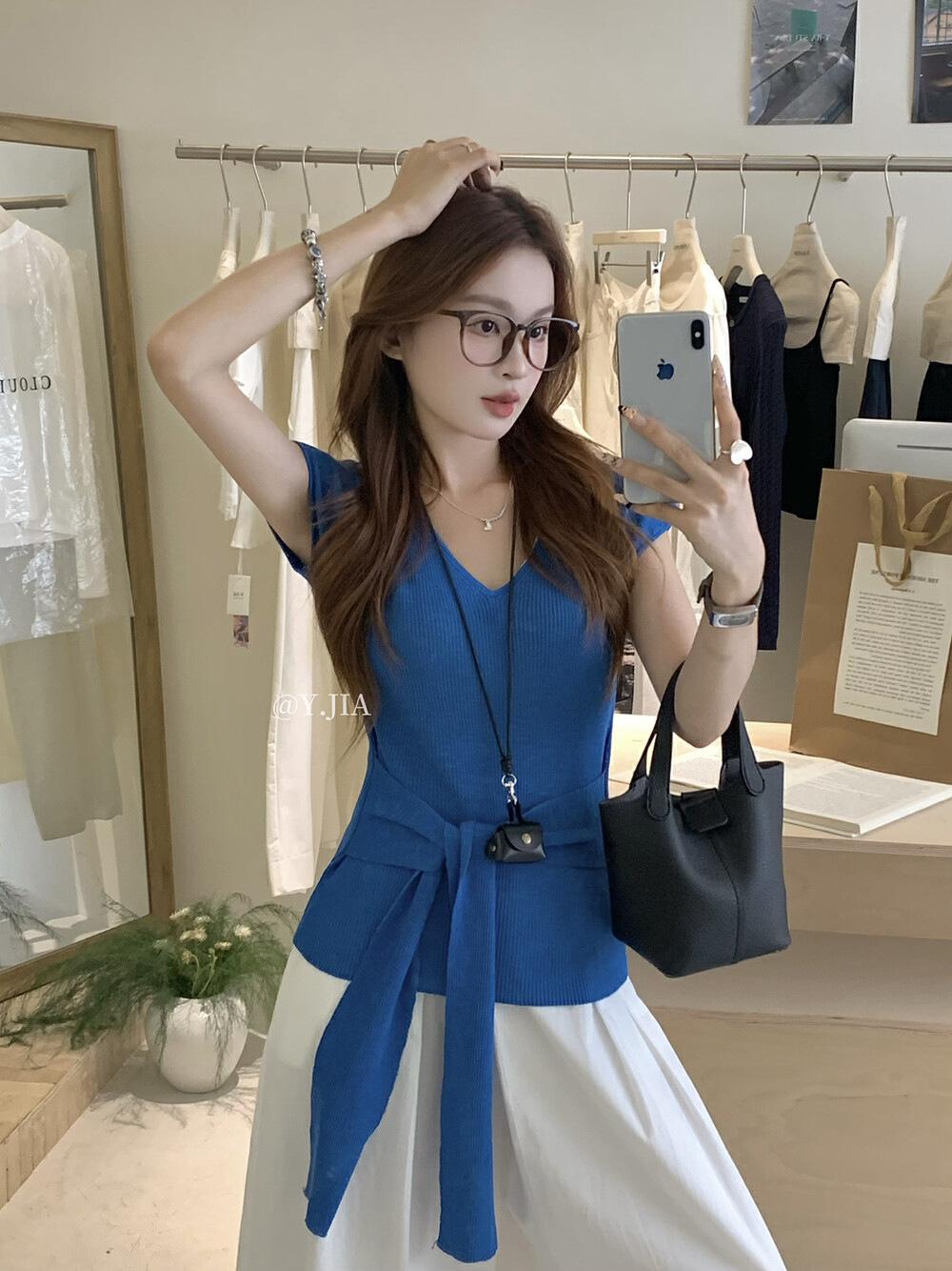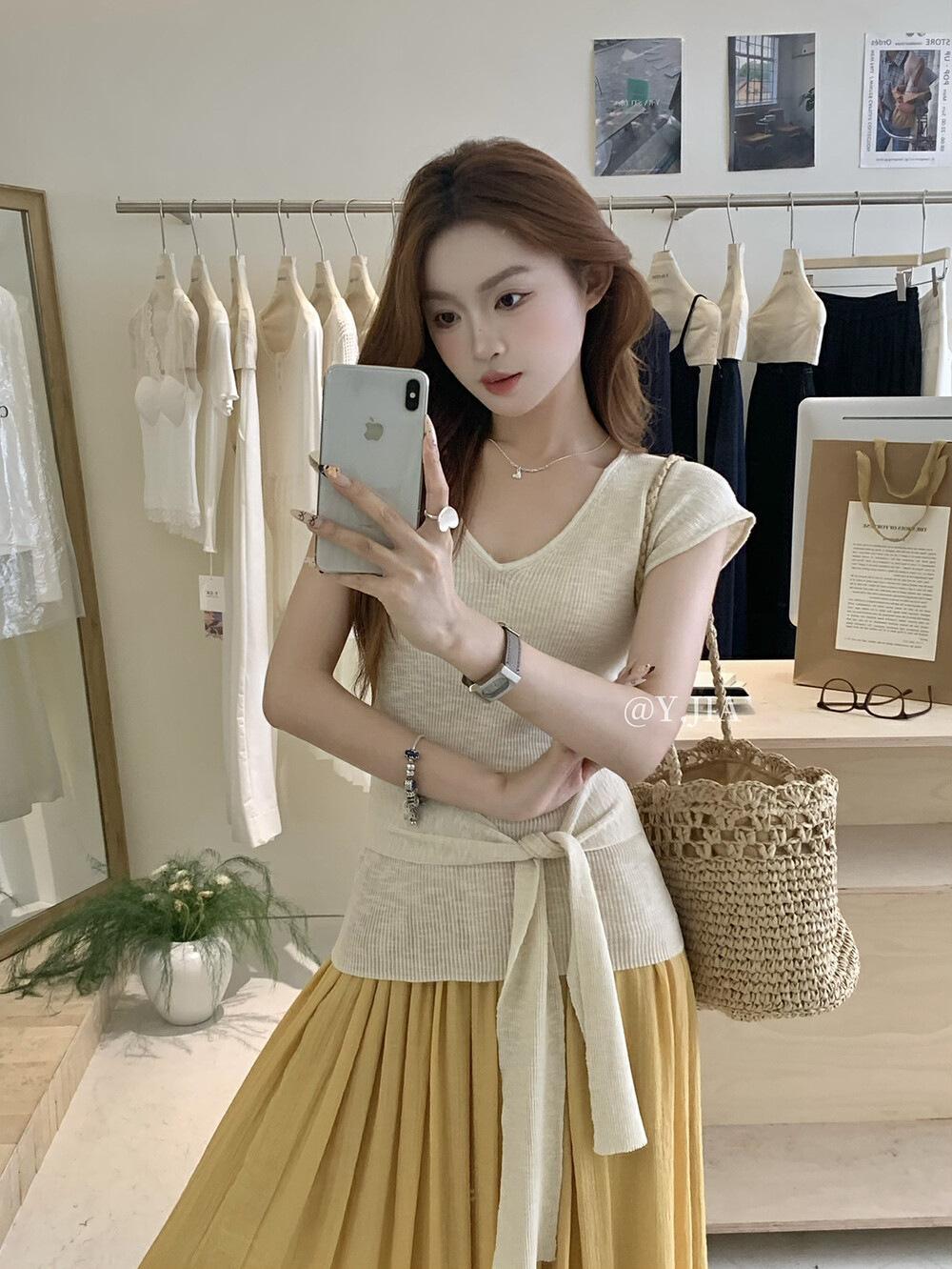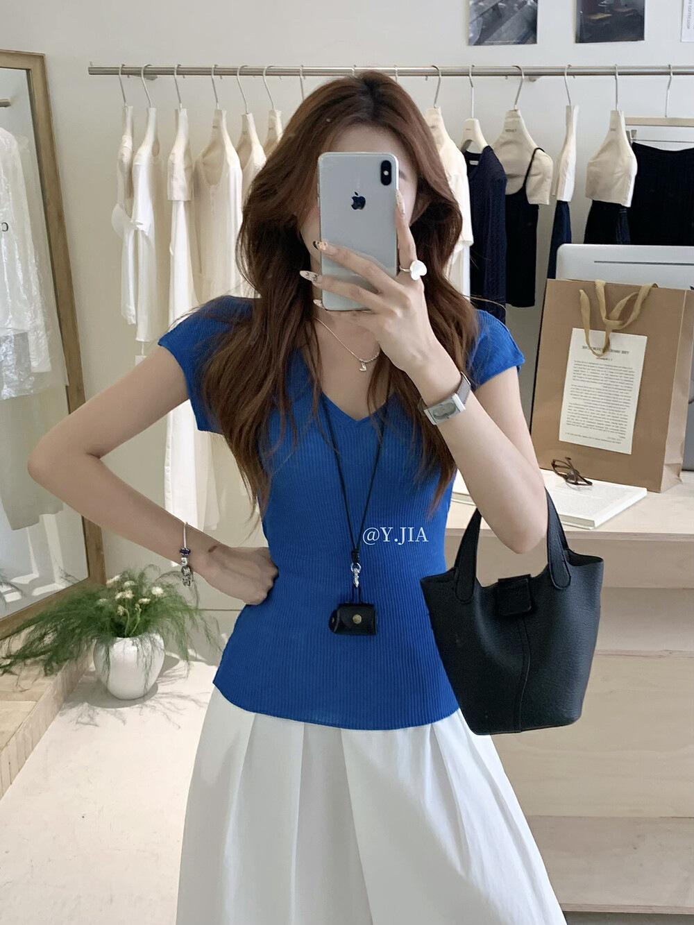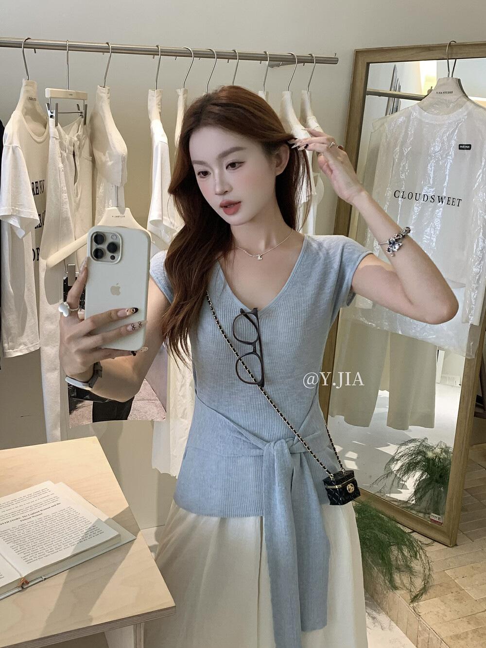 Gran Venta No Retornable Verano de Alta Gama Simple Cuello en V Tirantes Cintura Adelgazante Look Tejido de Punto Camiseta de Manga Corta para Mujer Top 210