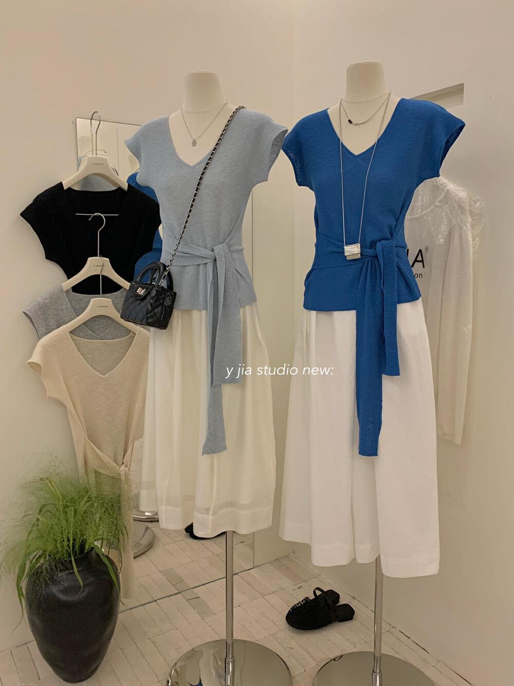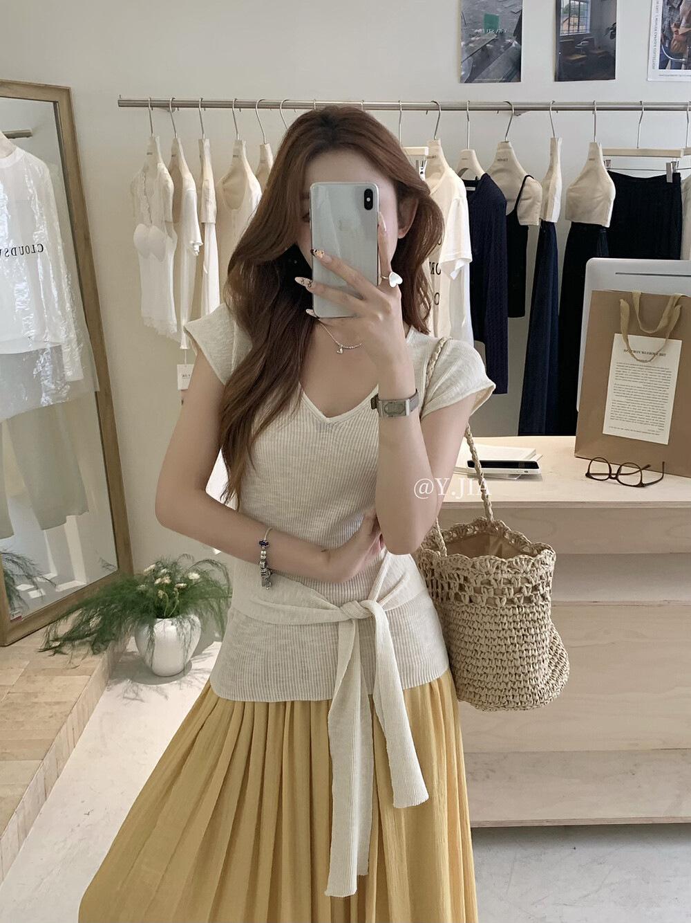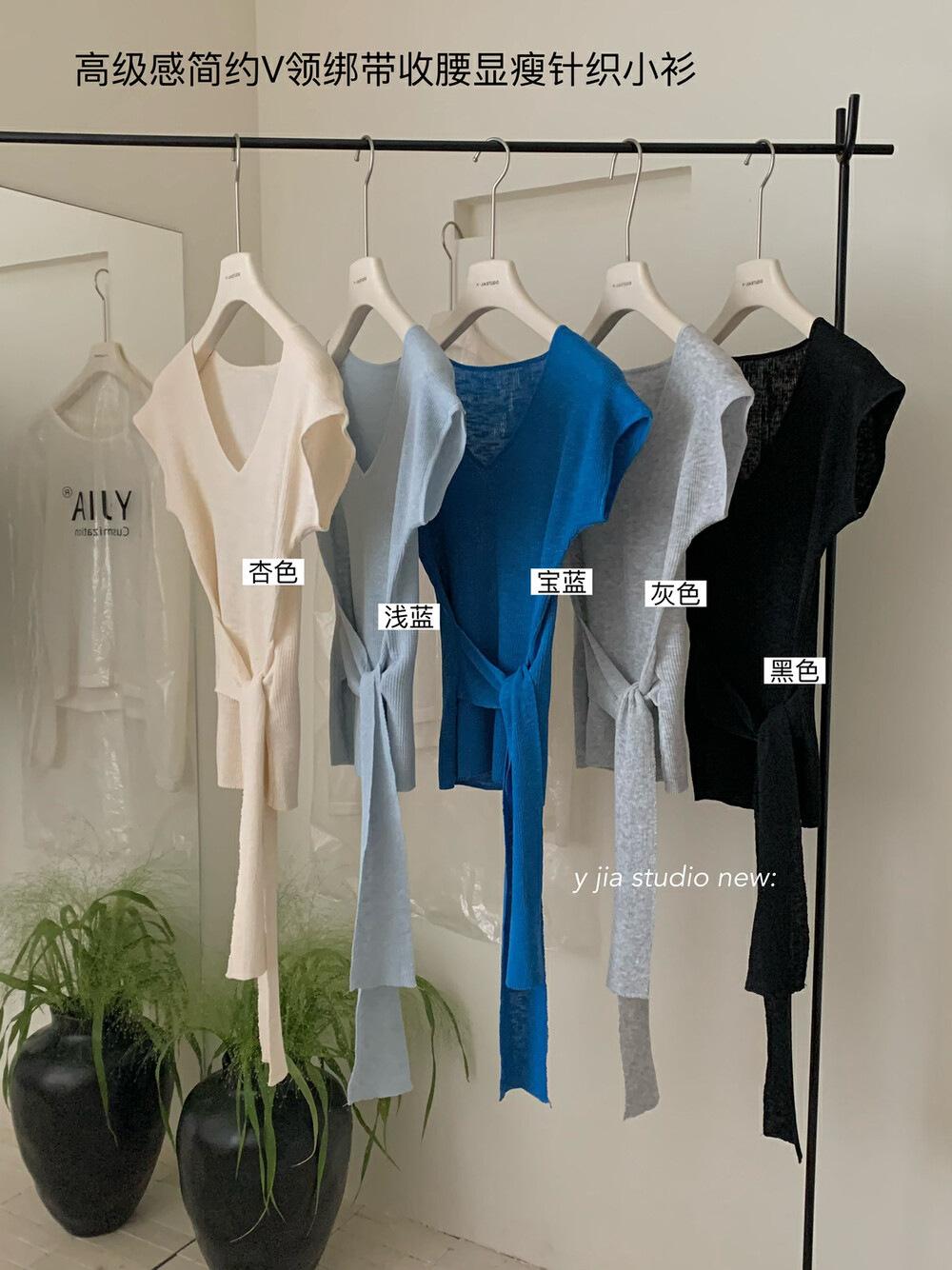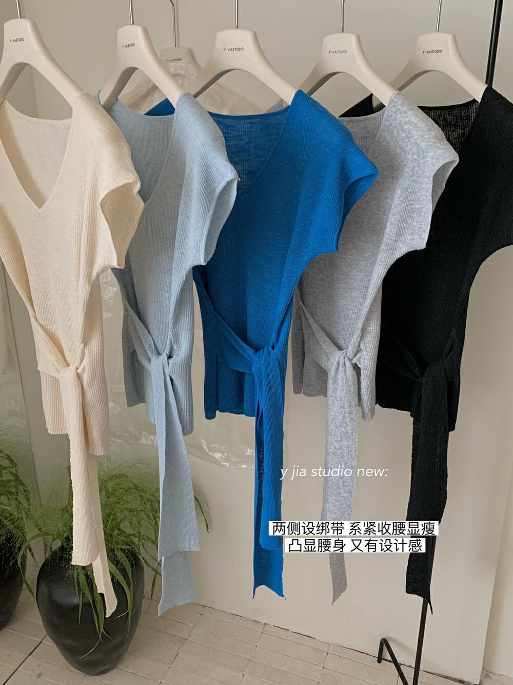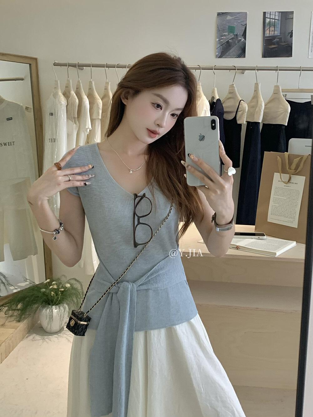 Gran Venta No Retornable Verano de Alta Gama Simple Cuello en V Tirantes Cintura Adelgazante Look Tejido de Punto Camiseta de Manga Corta para Mujer Top 210