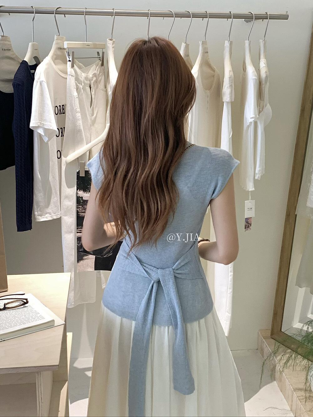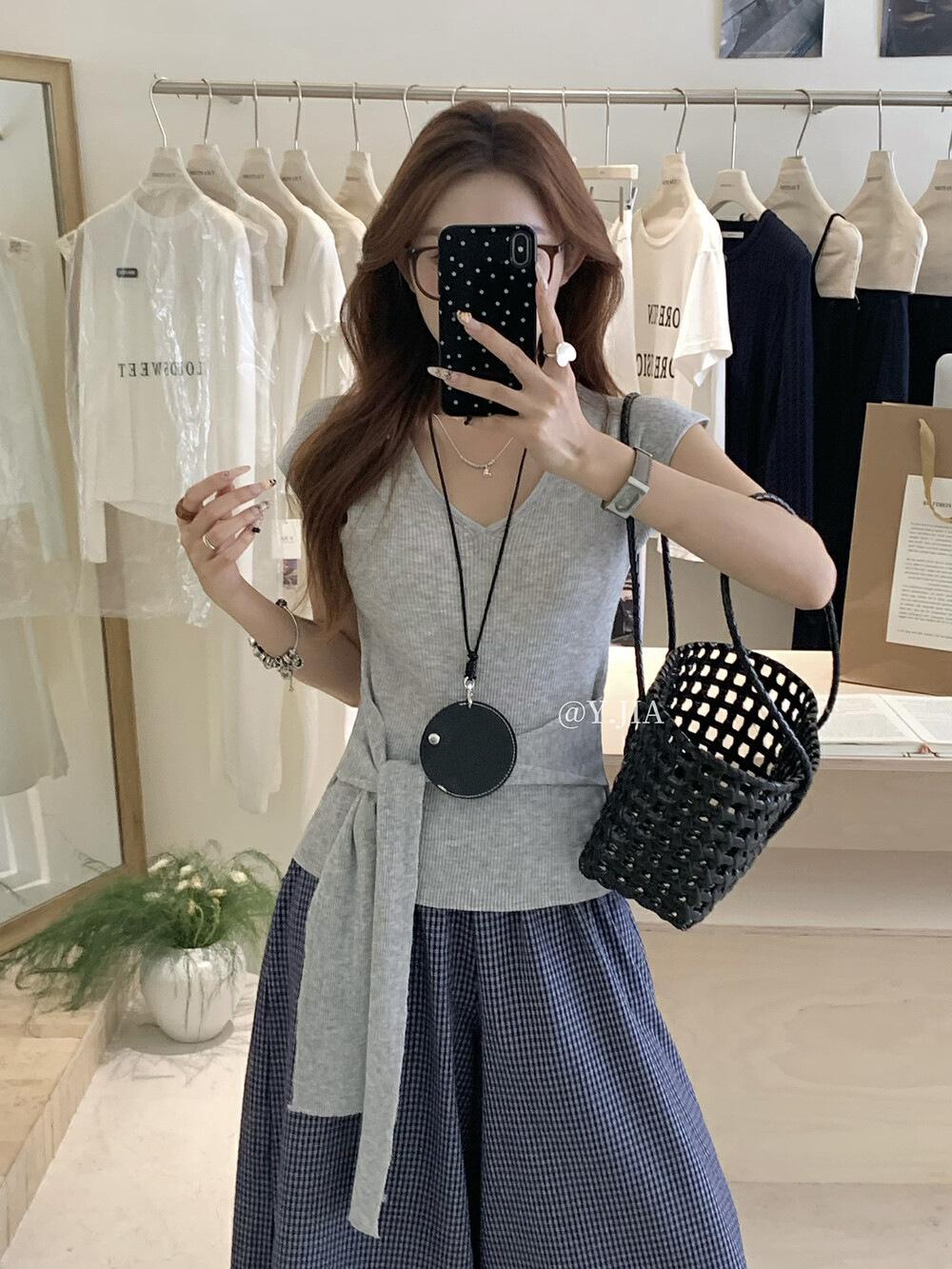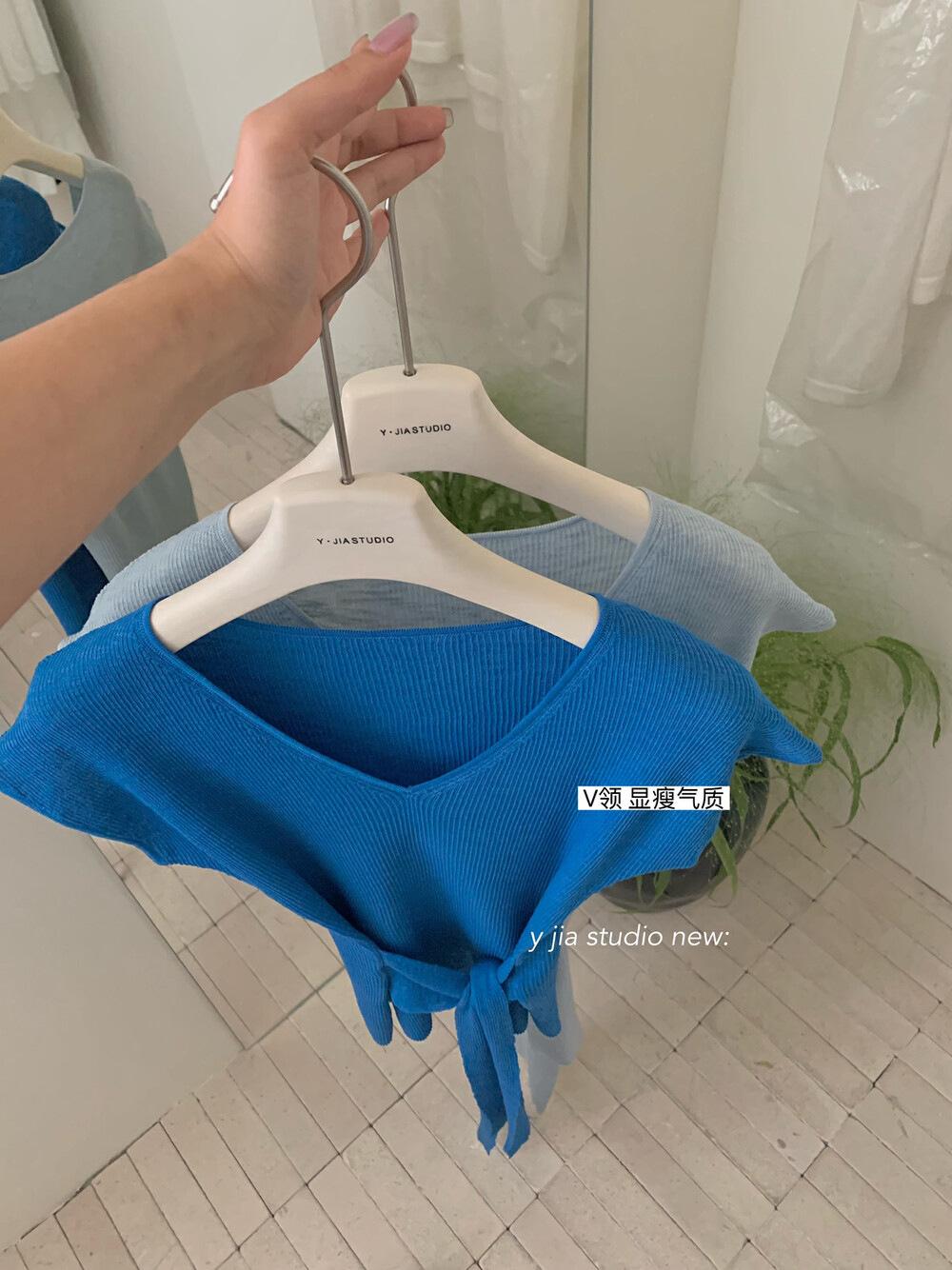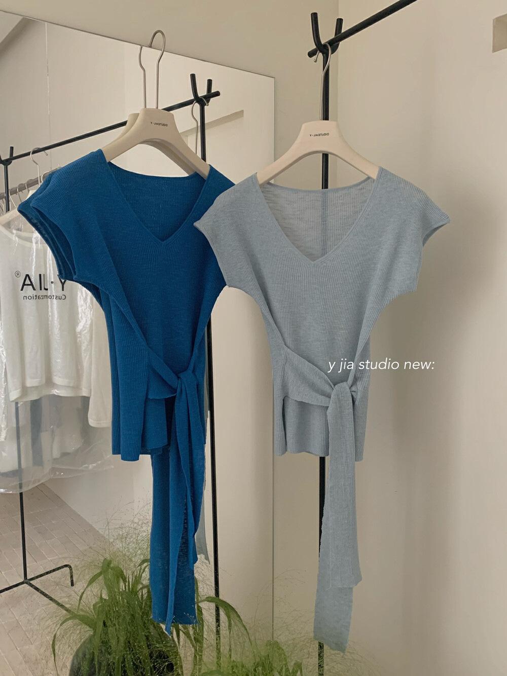 Gran Venta No Retornable Verano de Alta Gama Simple Cuello en V Tirantes Cintura Adelgazante Look Tejido de Punto Camiseta de Manga Corta para Mujer Top 210