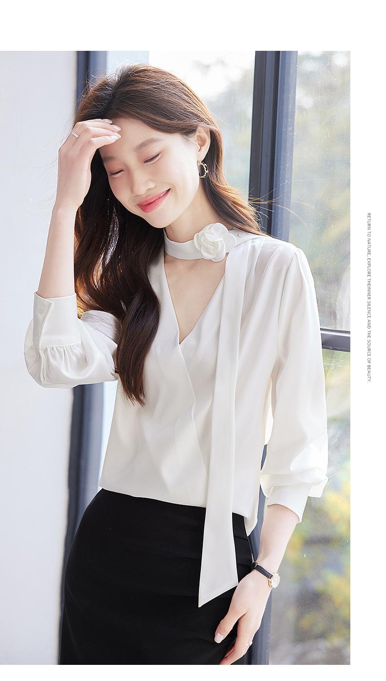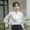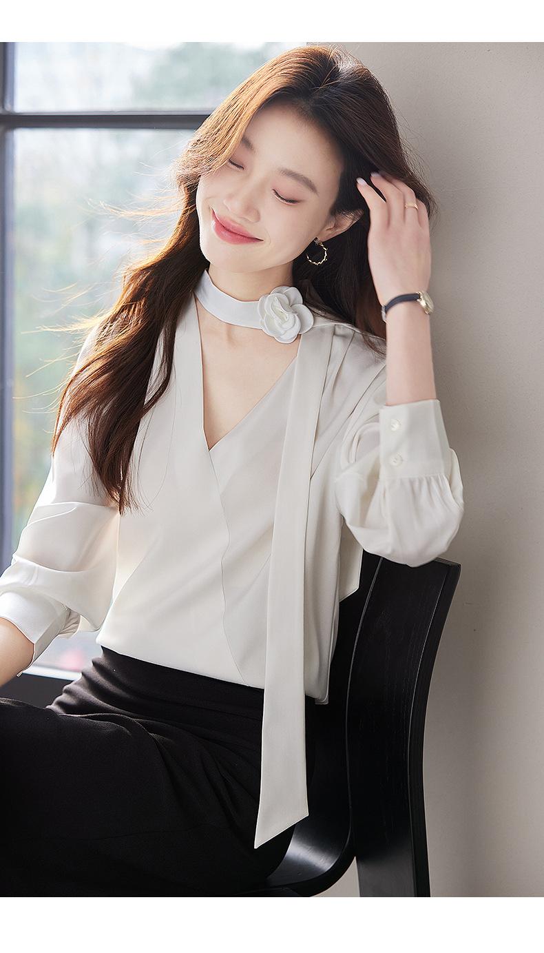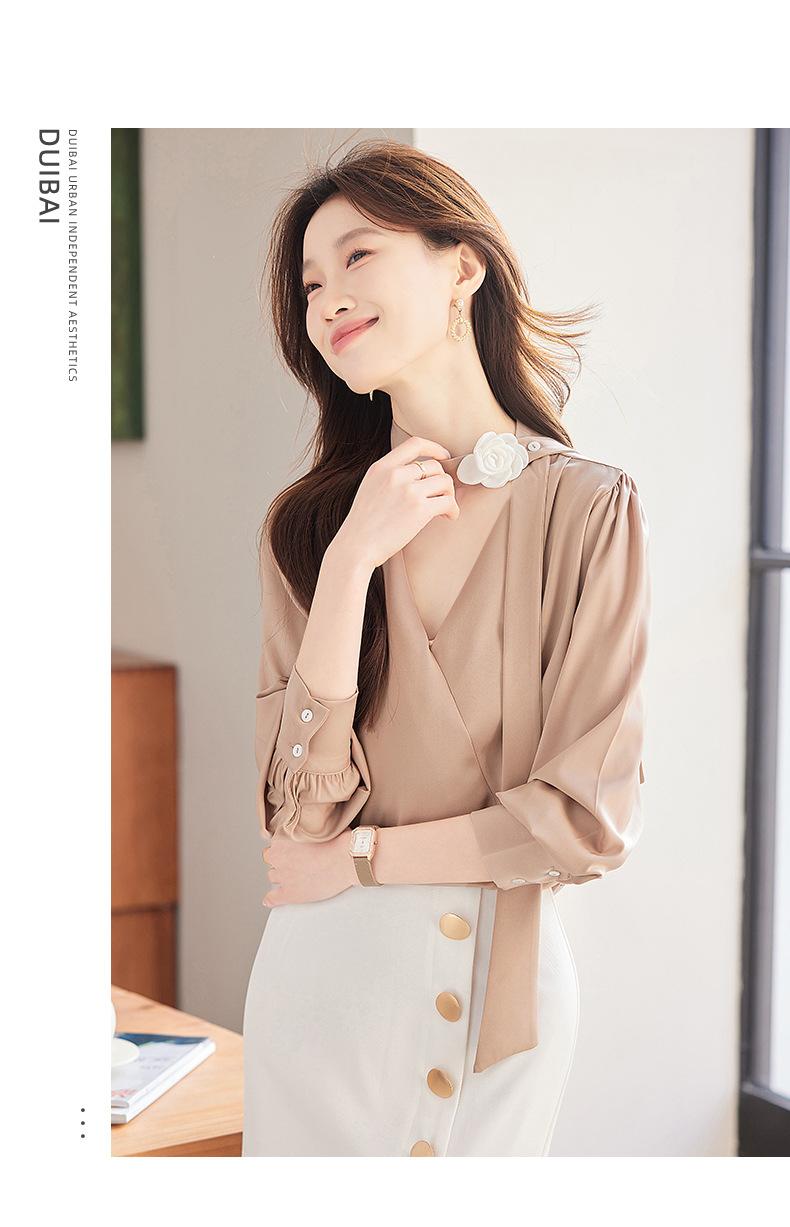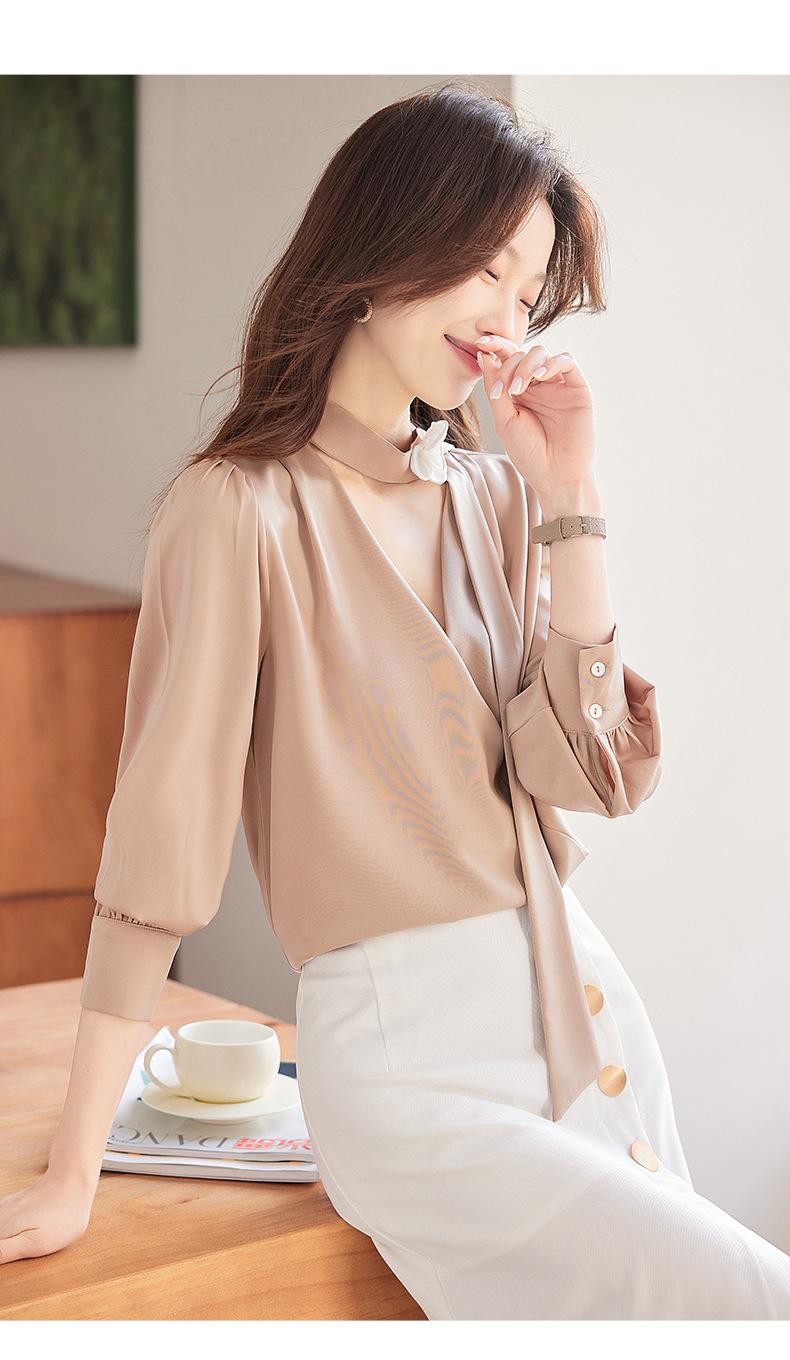 Camisa Francesa de Cuello en V y Manga Larga para Mujer para Primavera y Otoño, Elegante de Alta Gama, Camisa Holgada para Ropa de Trabajo, Top Profesional con Lazo de Hermana Real