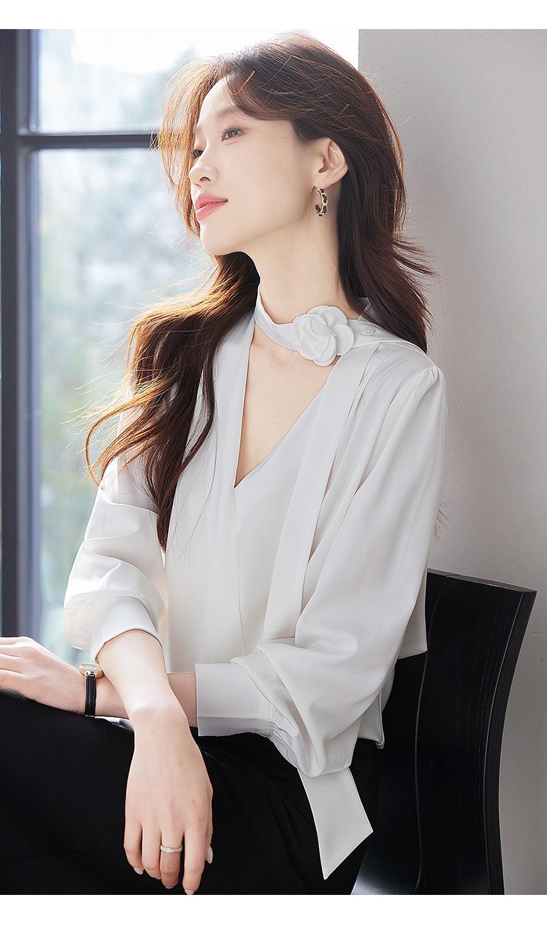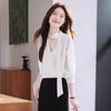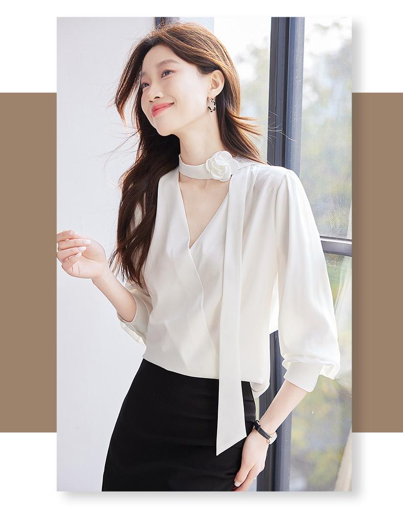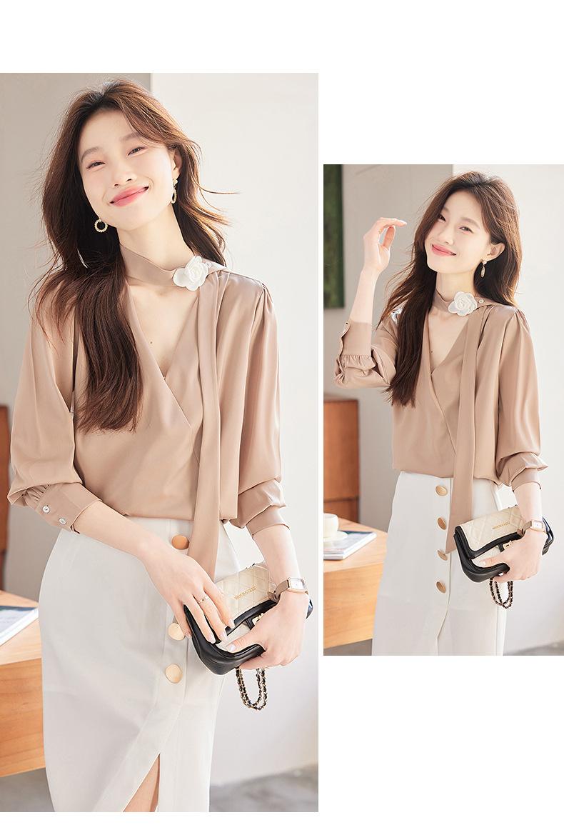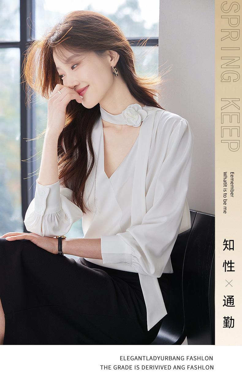Camisa Francesa de Cuello en V y Manga Larga para Mujer para Primavera y Otoño, Elegante de Alta Gama, Camisa Holgada para Ropa de Trabajo, Top Profesional con Lazo de Hermana Real