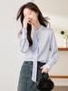 Camisa Azul de Mangas Fruncidas Frescas Moda 2025 Versátil Casual para Mujer Blanca Cuello Redondo Chifón Suelta Top Básico