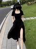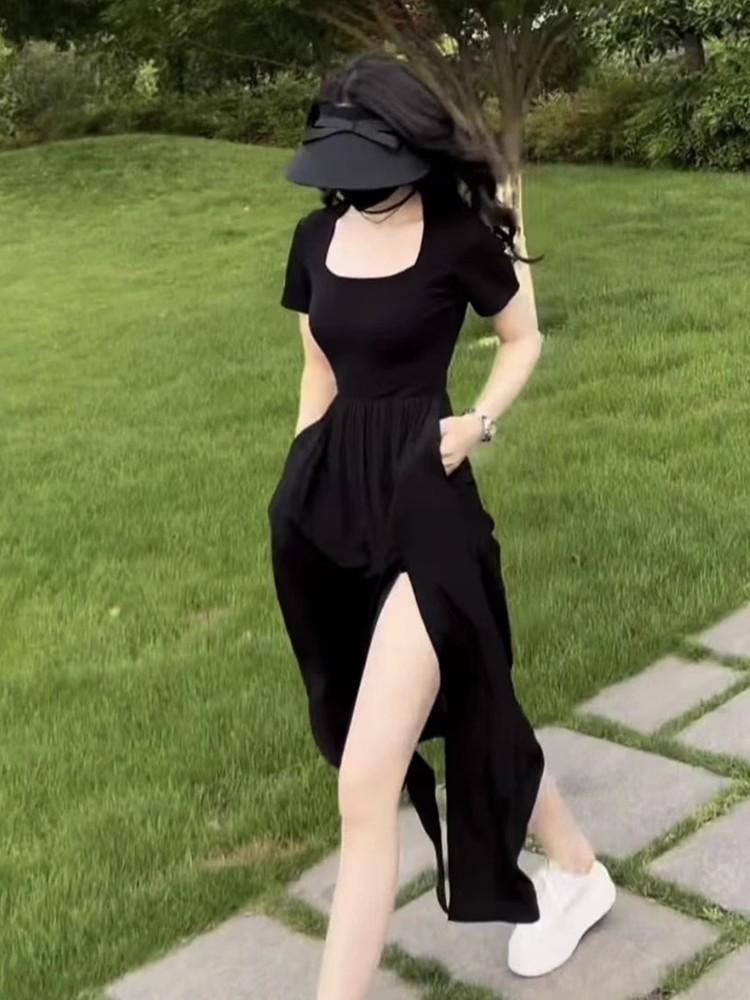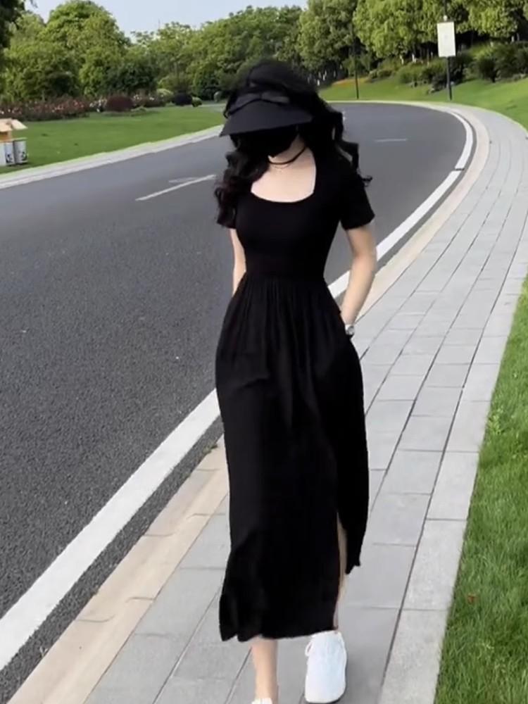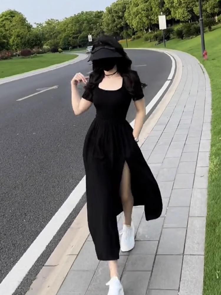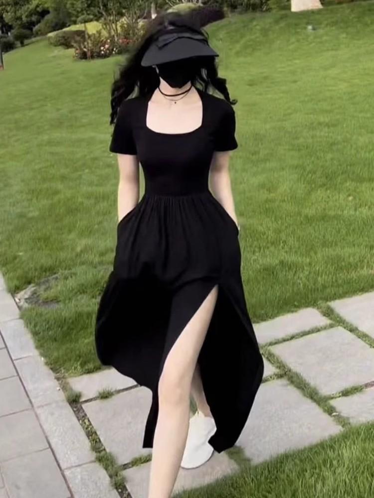 Vestido Estilo Hepburn Estilo Francés Verano para Mujer Elegante Adelgazante Falda con Abertura Cintura Alta Negro Línea A Falda Larga