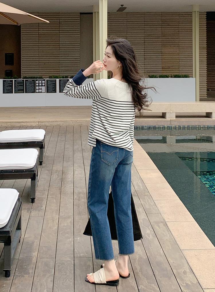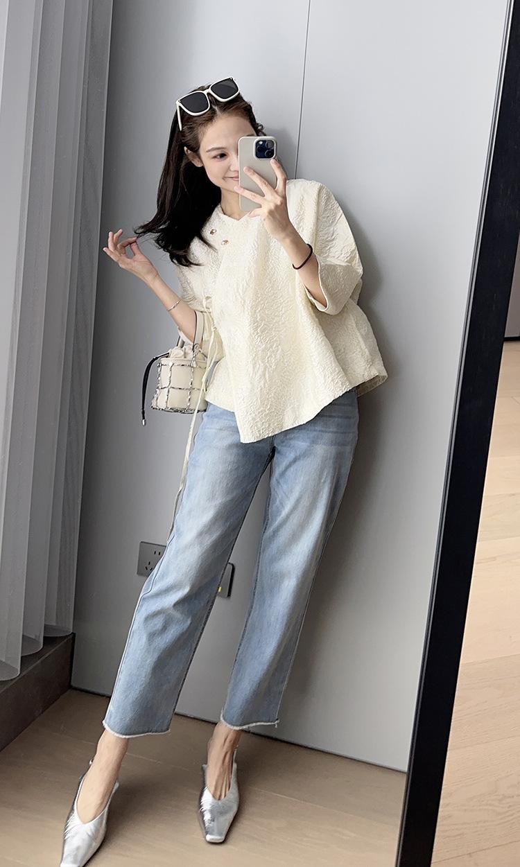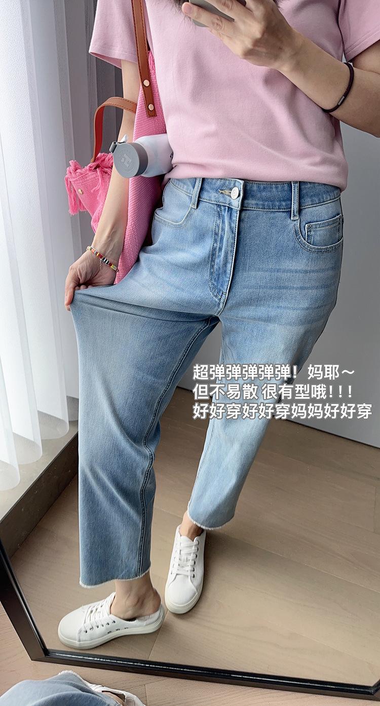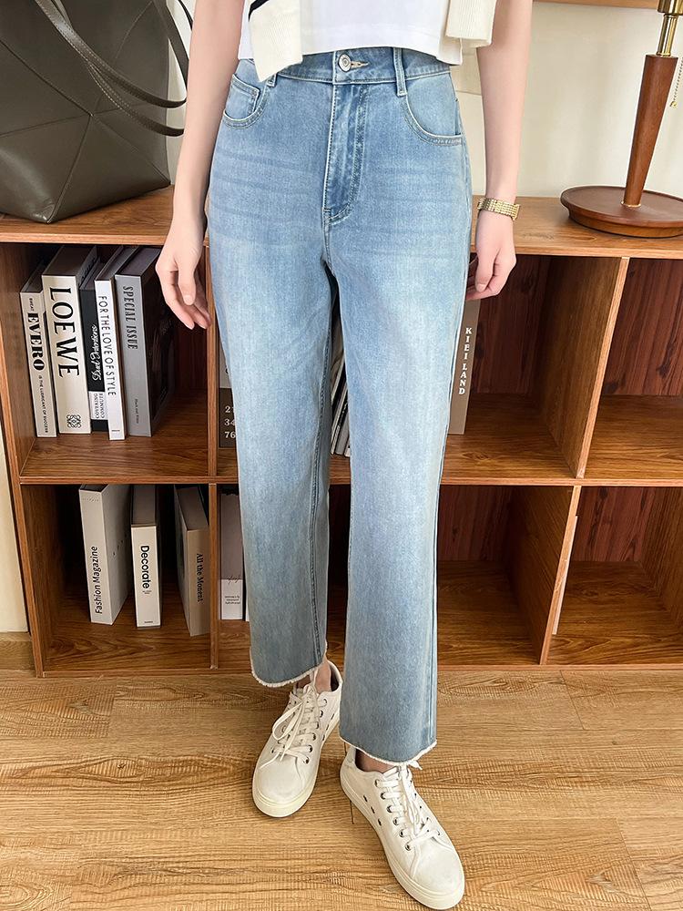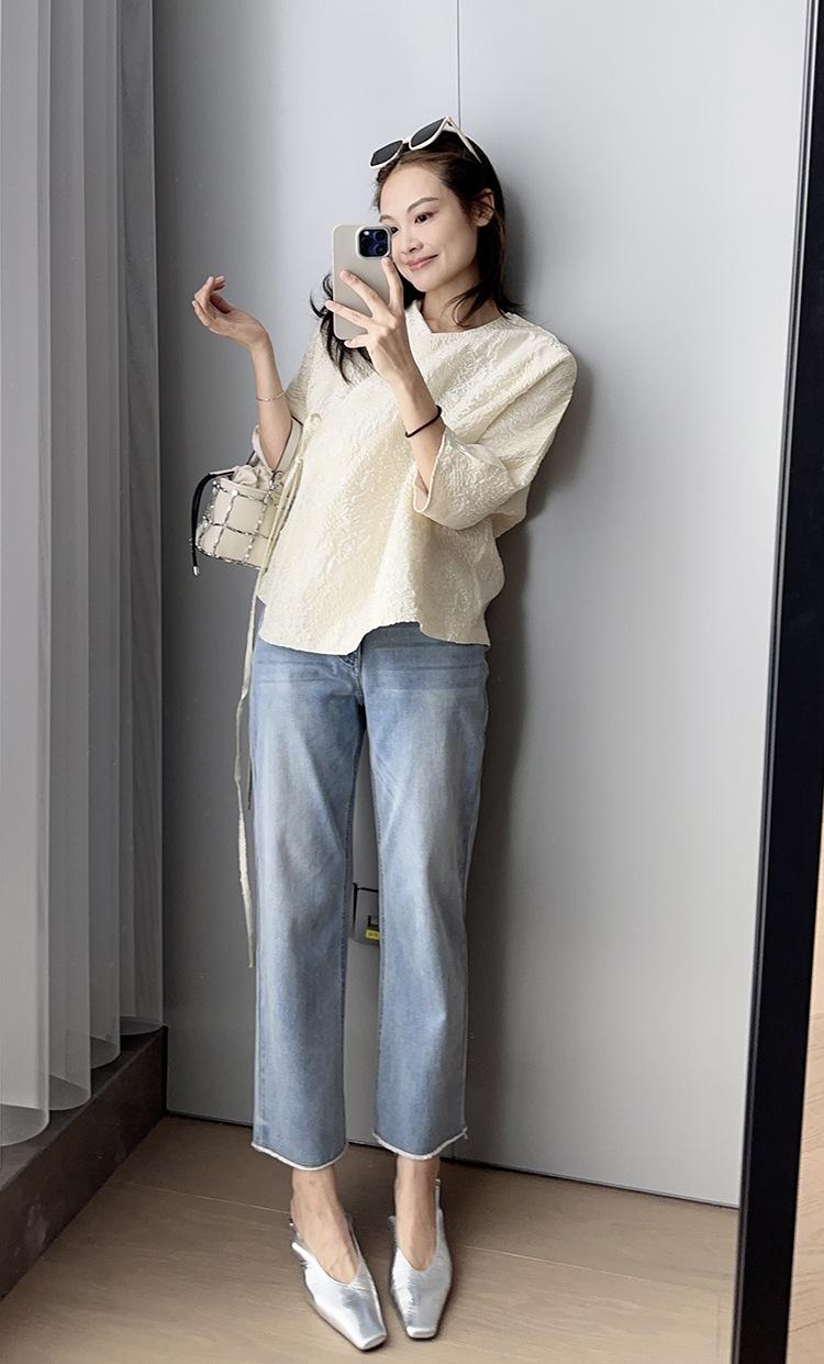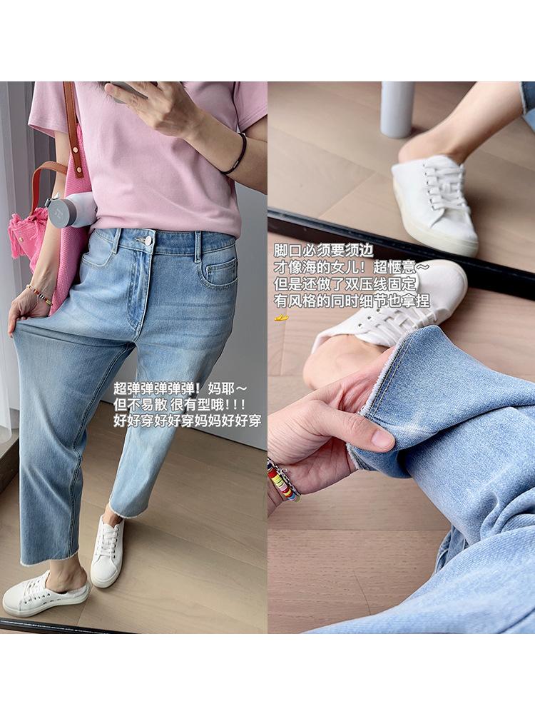 El largo de pantalón de nueve puntos es ligero y alto, con un animado diseño de borde crudo en el dobladillo
