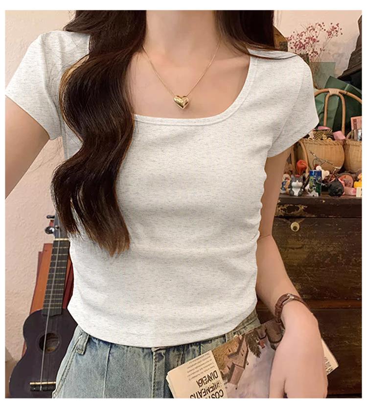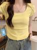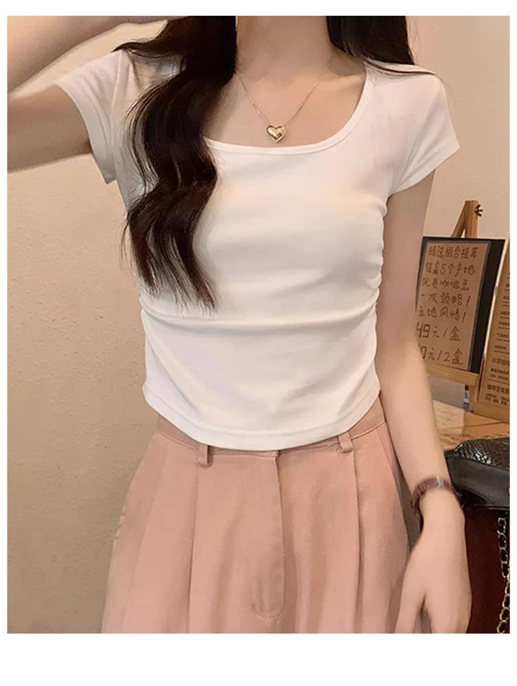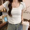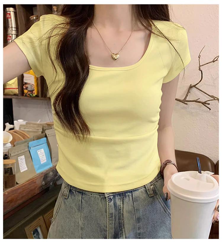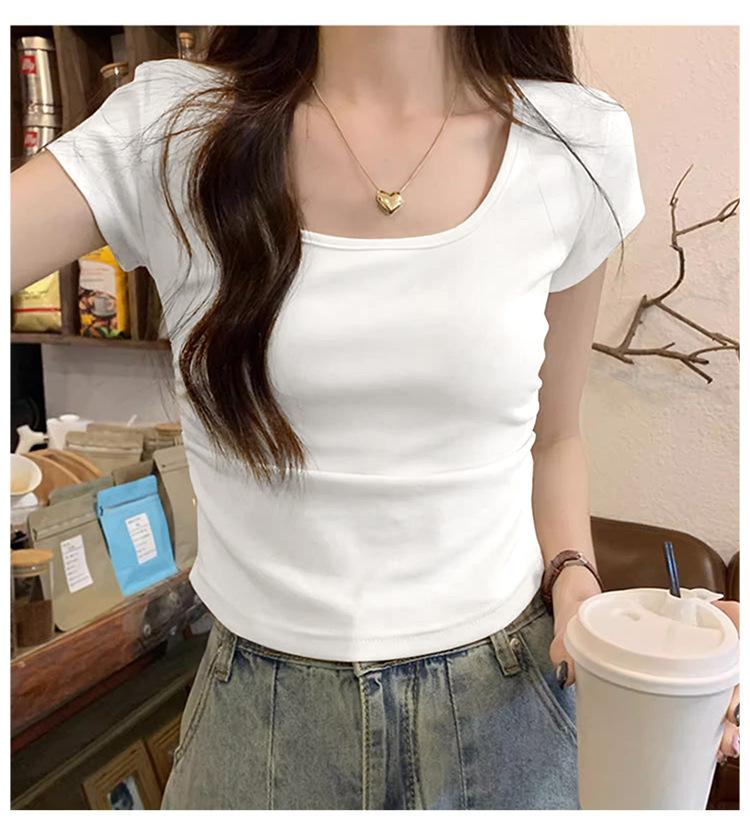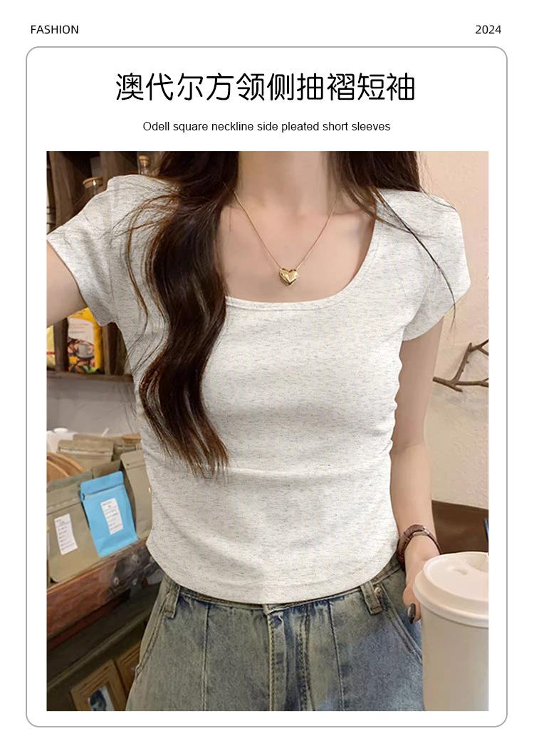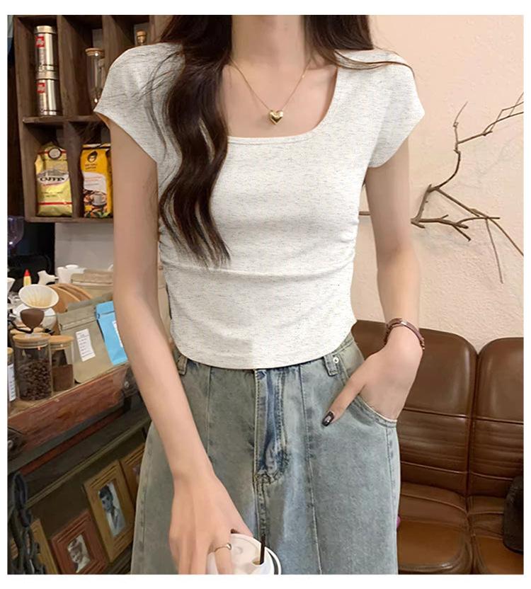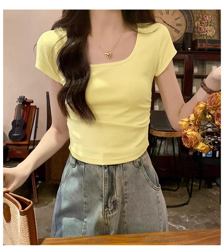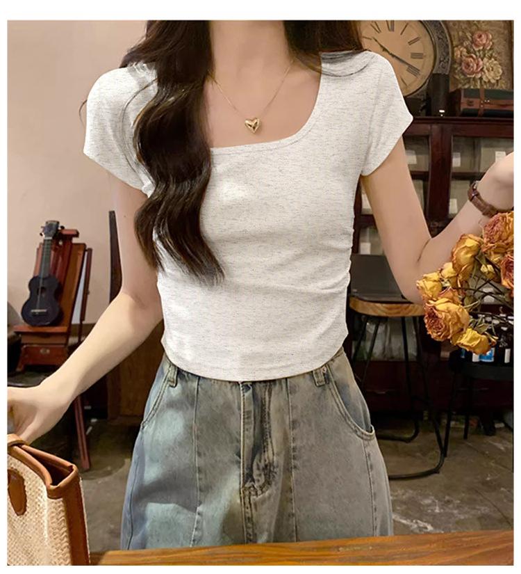 Camiseta de Hombro Derecho Cuello Cuadrado Manga Corta para Mujer Verano 2025 Nuevo Diseño Nicho Look Adelgazante Top Corto Plisado